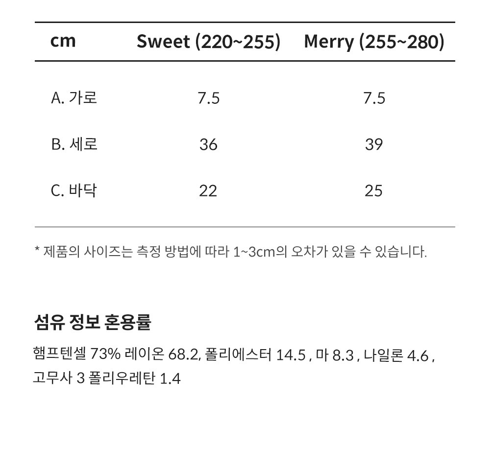 | 치수 | Sweet, Merry (상세 사이즈 본문 이미지 참고) *단면을 기준으로 잰 기장이며, 측정 방식에 따라 오차가 있을 수 있음 |