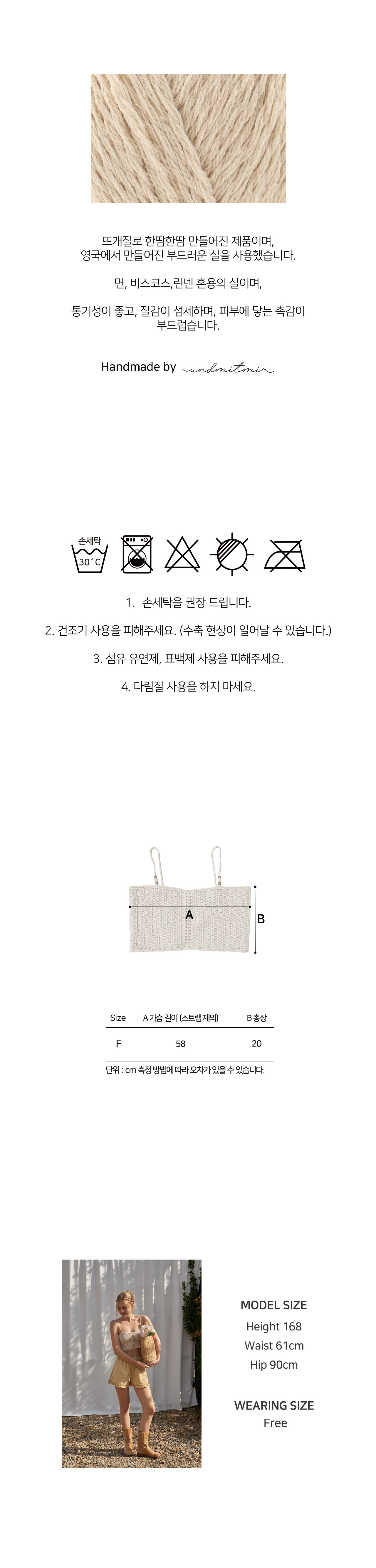 | 세탁방법 및 취급시 주의사항 | 1. 손세탁을 권장 드립니다. 2. 건조기 사용을 피해주세요. (수축 현상이 일어날 수 있습니다.) 3. 섬유 유연제, 표백제 사용을 피해주세요. 4. 다림질 사용을 하지 마세요. |