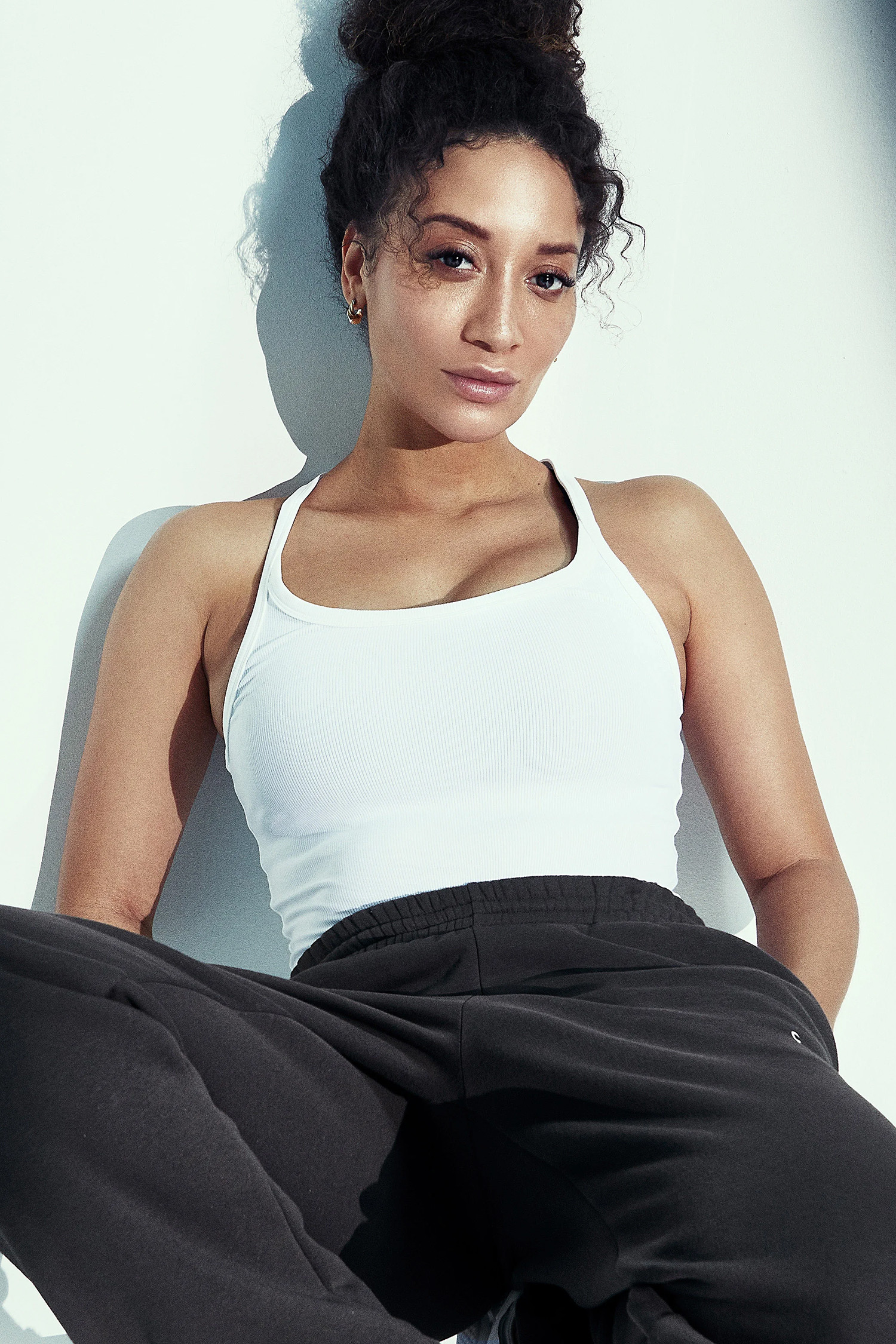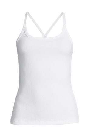 얇은 스트랩과 립 조직이 돋보이는 미니멀 탱크탑.
