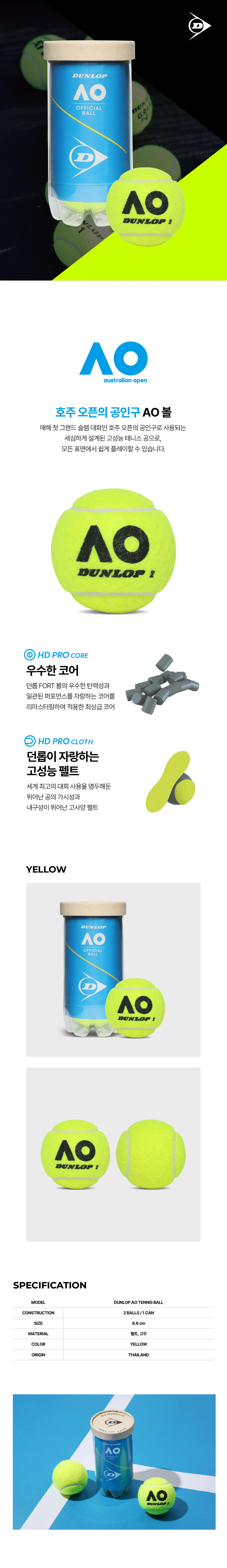| 상품별 세부 사양 | 그랜드슬램 호주 오픈 및 ATP 투어의 공식 사용구 모든 코트에서 최상의 성능을 발휘하는 프리미엄 볼 -HD CORE : 최고의 퍼포먼스와 내구성을 자랑하는 코어 -HD PRO CLOTH : 세계 최고의 토너먼트 및 플레이어를 위한 고사양 펠트 |