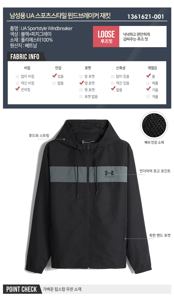 [언더아머] 남성용 스포츠스타일 윈드브레이커 재킷 1361621_001