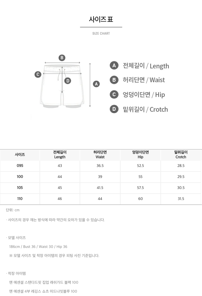 | 소재 | 쇼츠 겉감: 폴리에스터 100% / 쇼츠 안감: 폴리에스터 91%, 폴리우레탄 9% / 레깅스 겉감: 폴리에스터 82%, 폴리우레탄 18% / 레깅스 안감: 폴리에스터 73%, 폴리우레탄 27% |