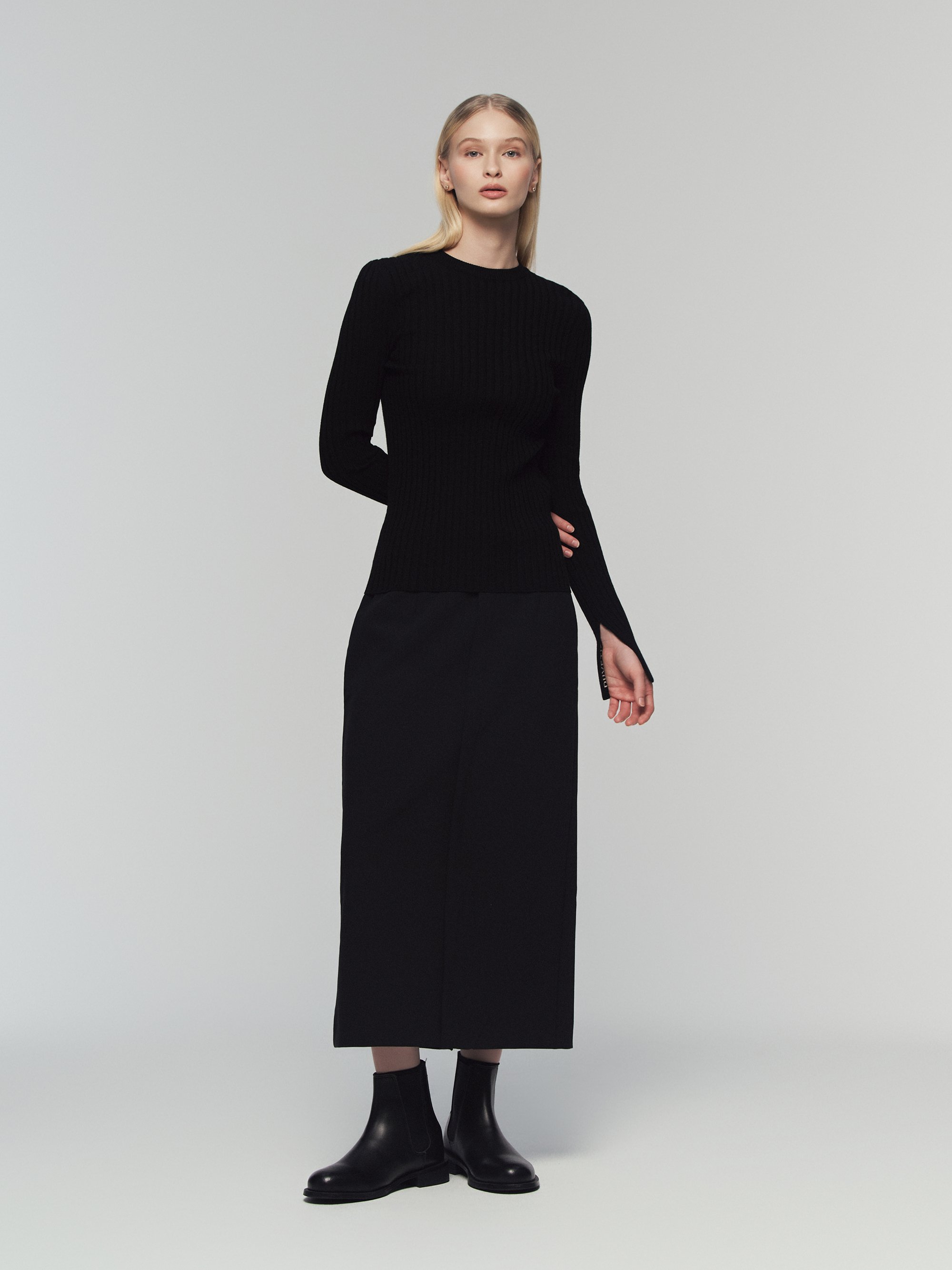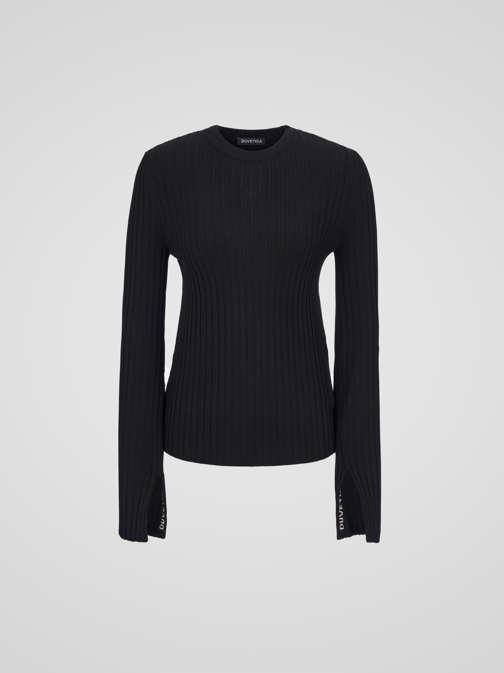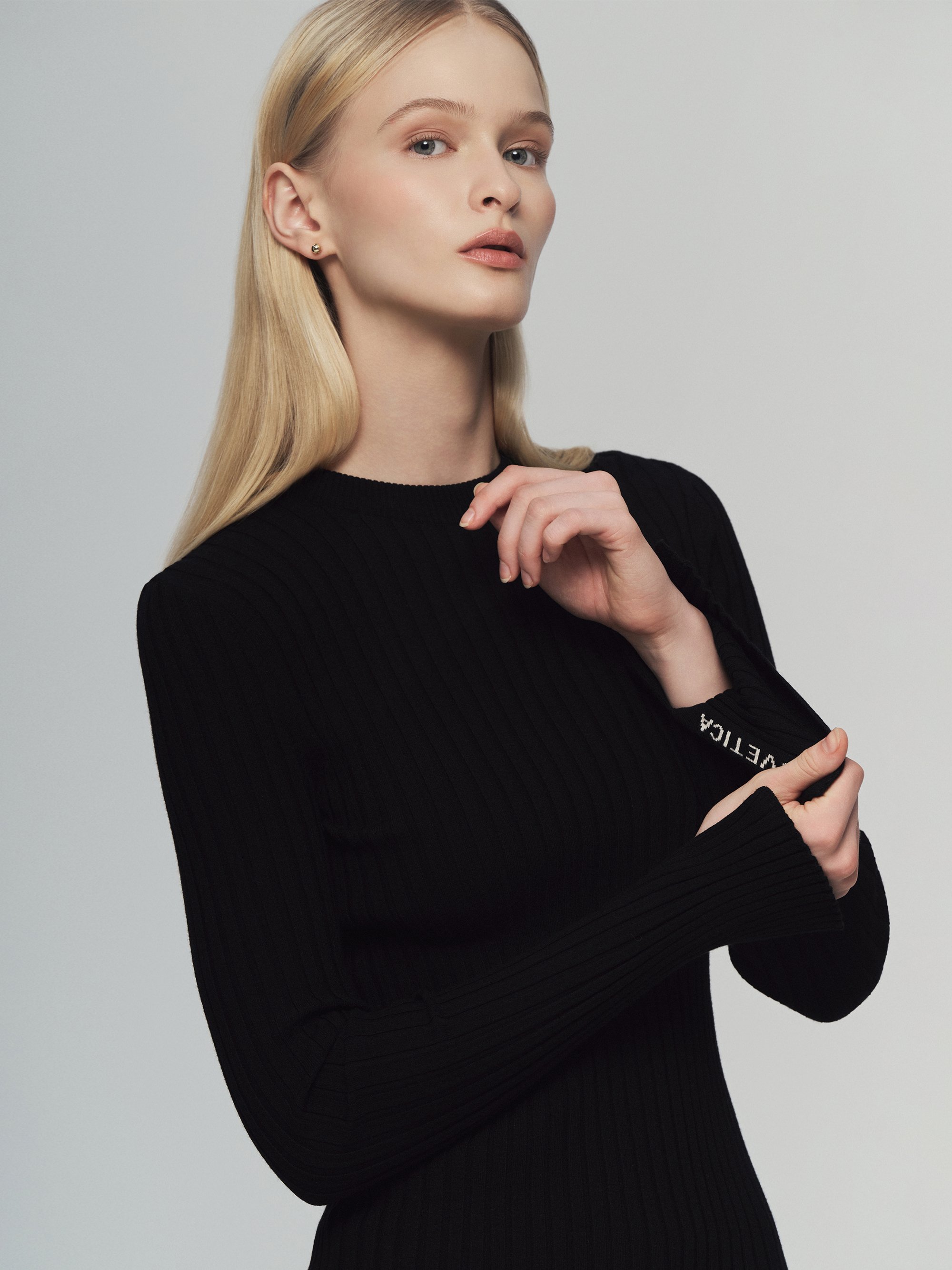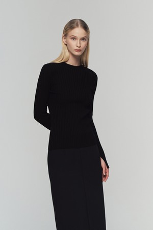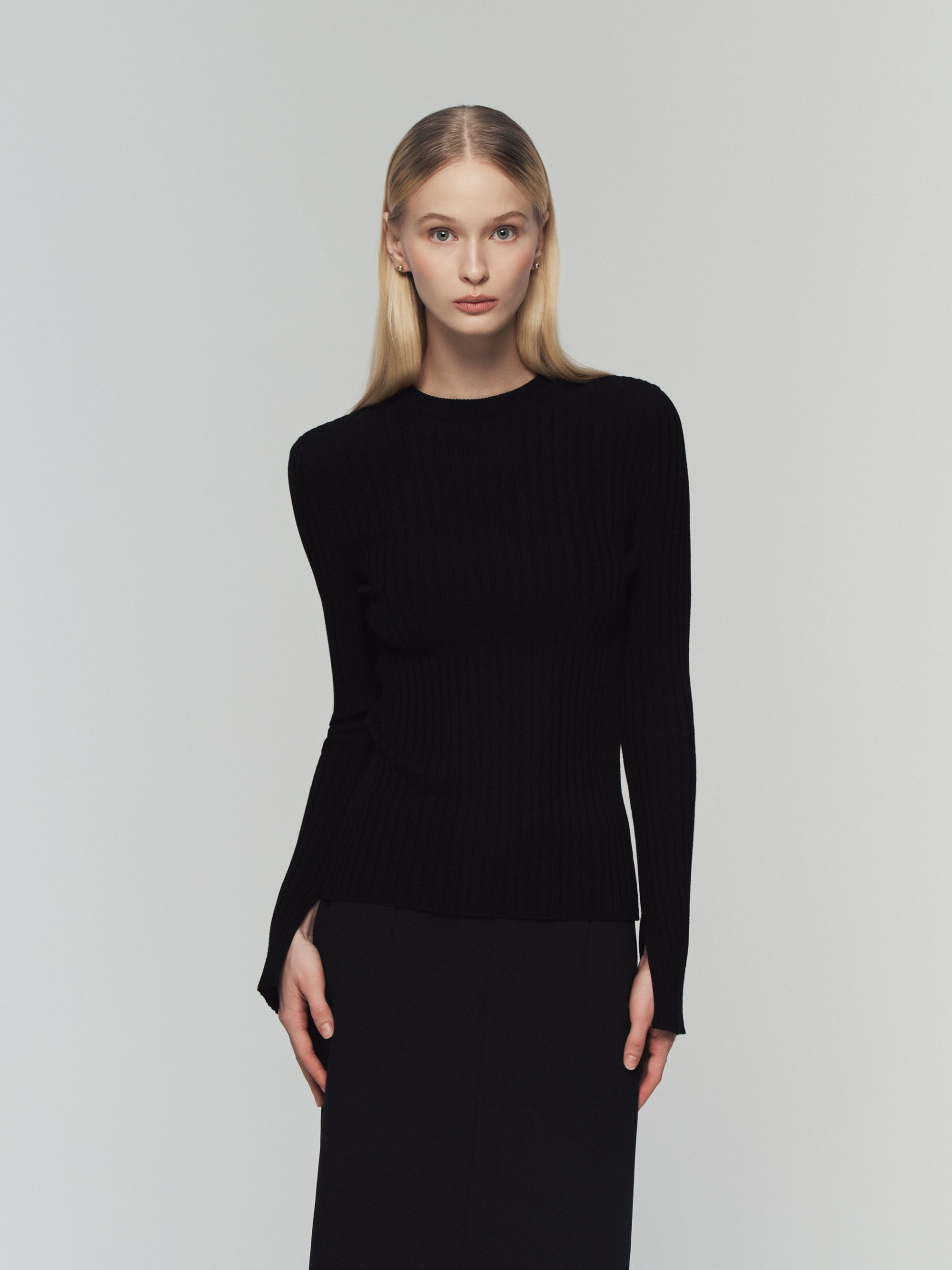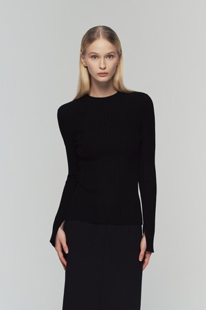 - 소매 안쪽 절개에 니팅으로 로고 포인트를 준 슬림핏 라운드넥 니트