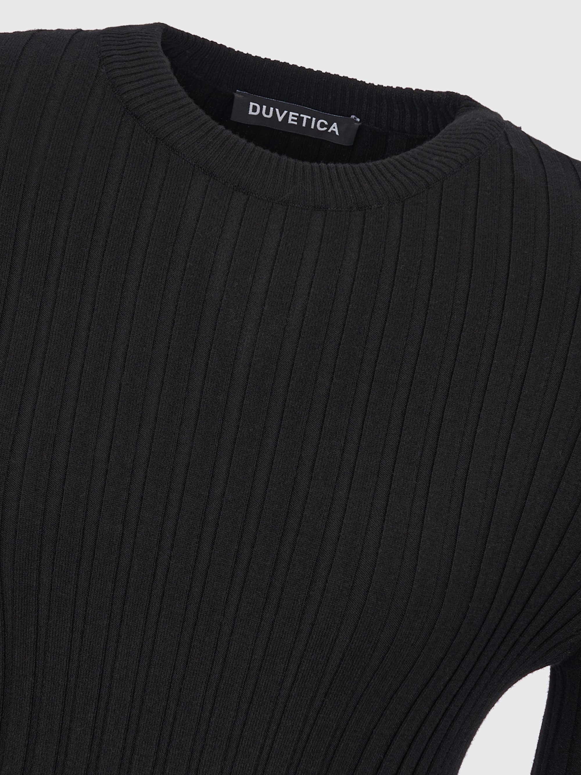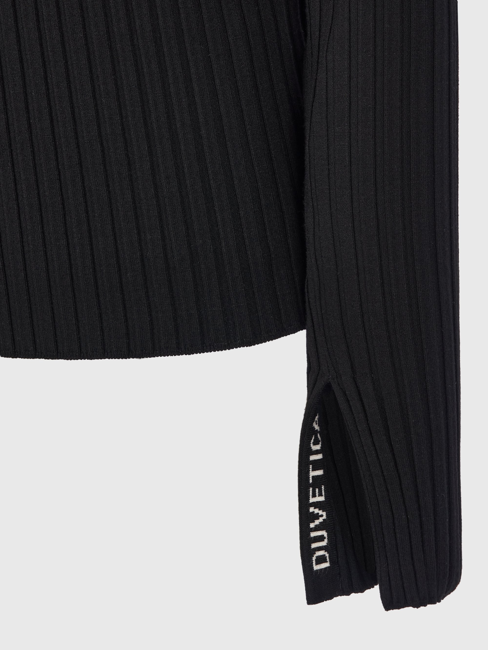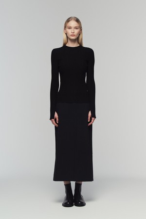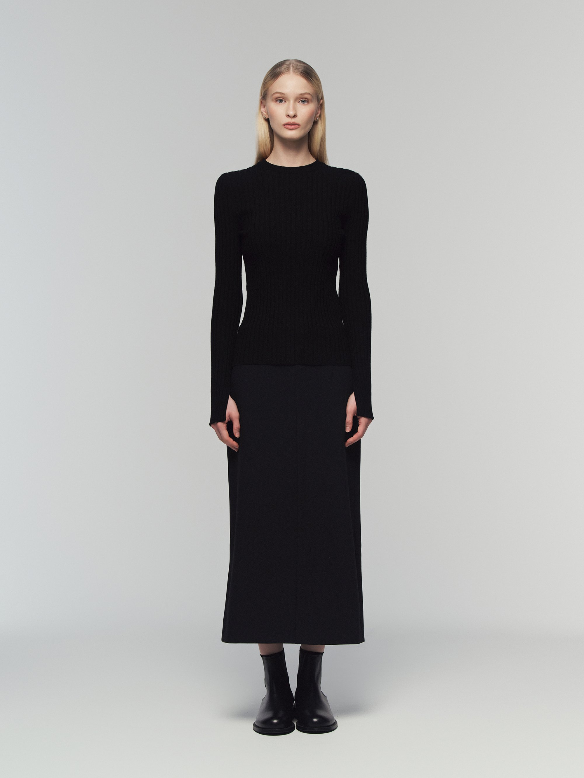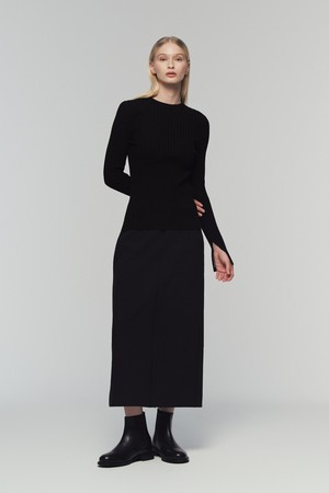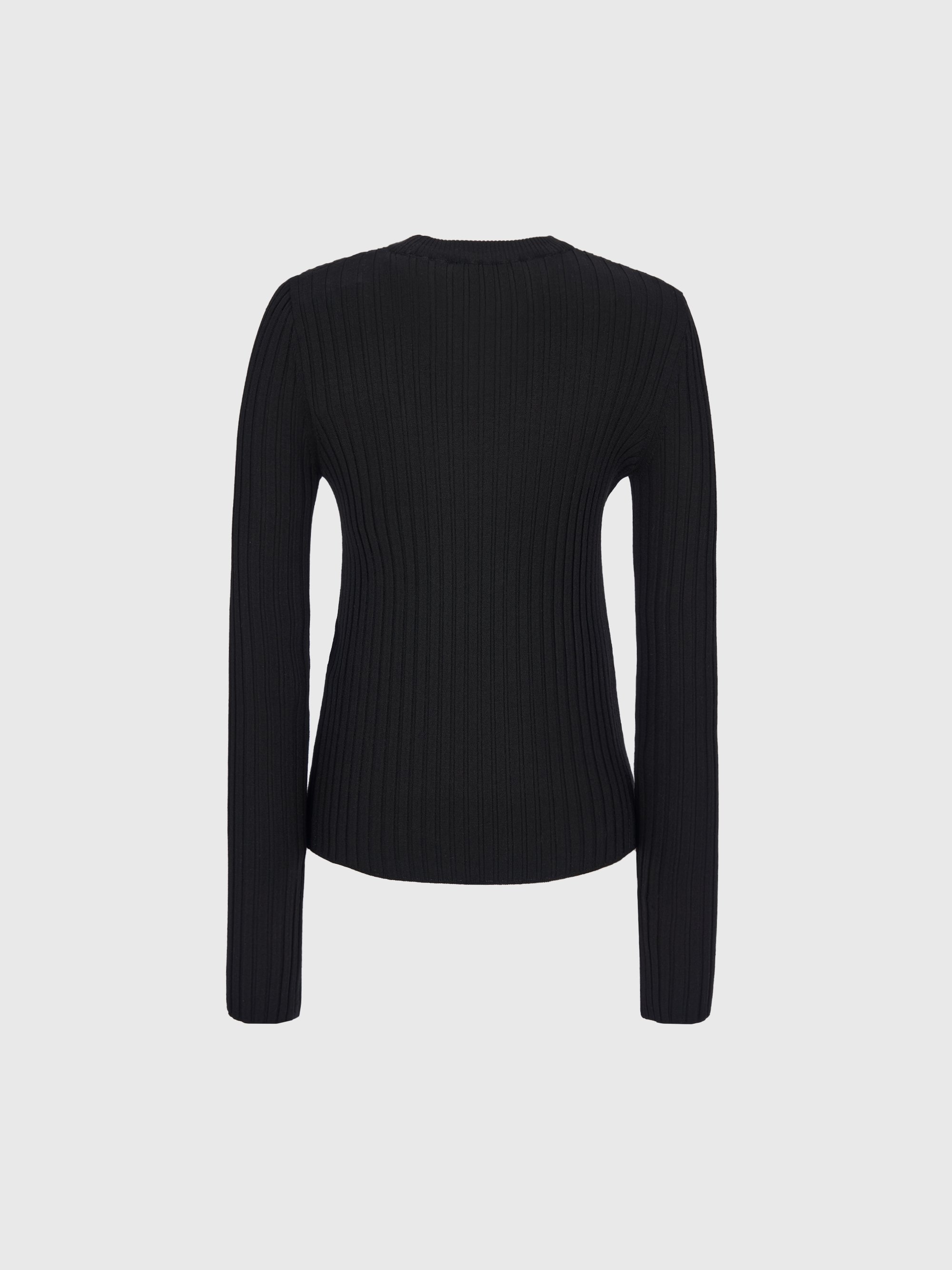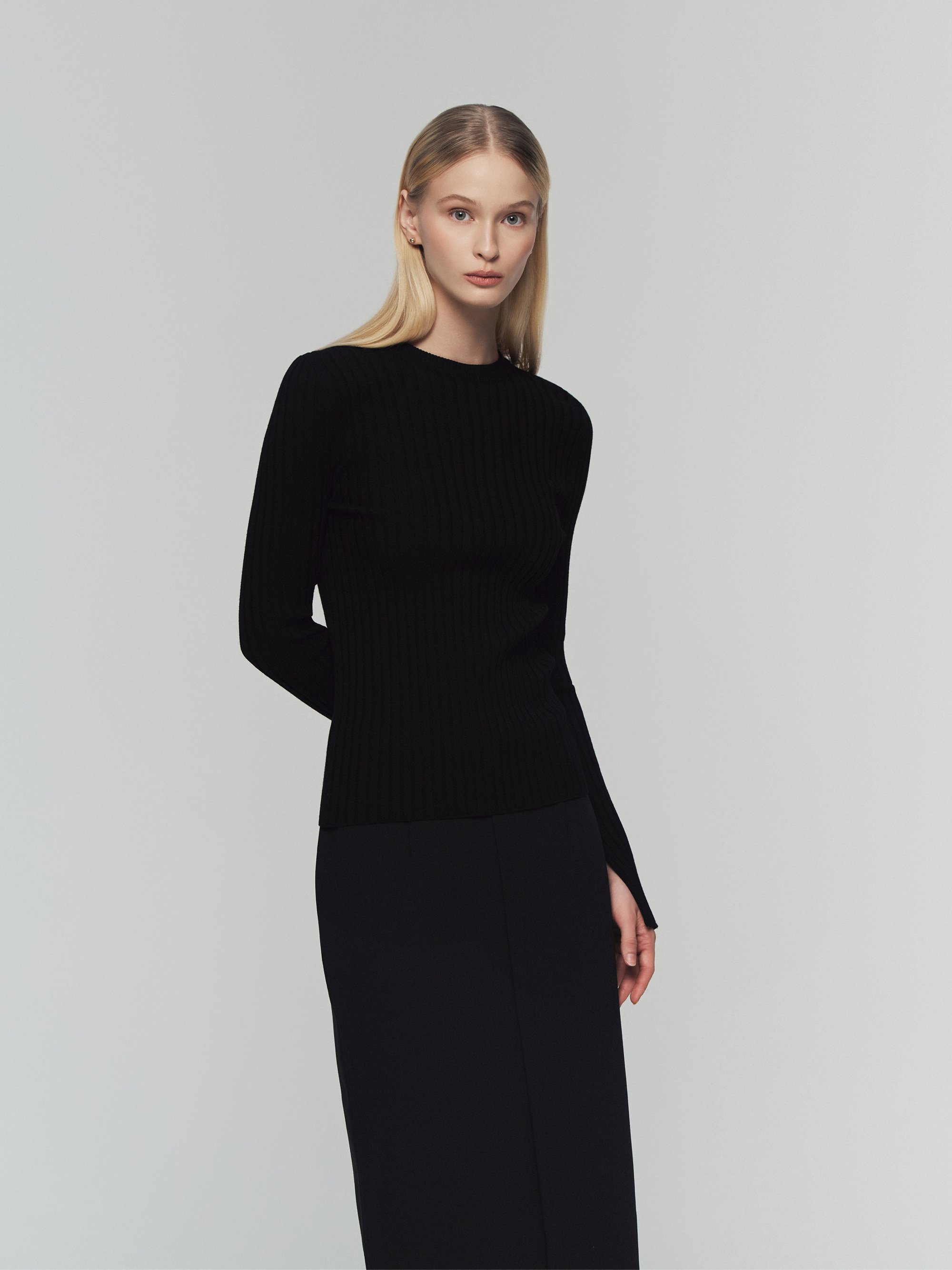 - 소매 안쪽 절개에 니팅으로 로고 포인트를 준 슬림핏 라운드넥 니트