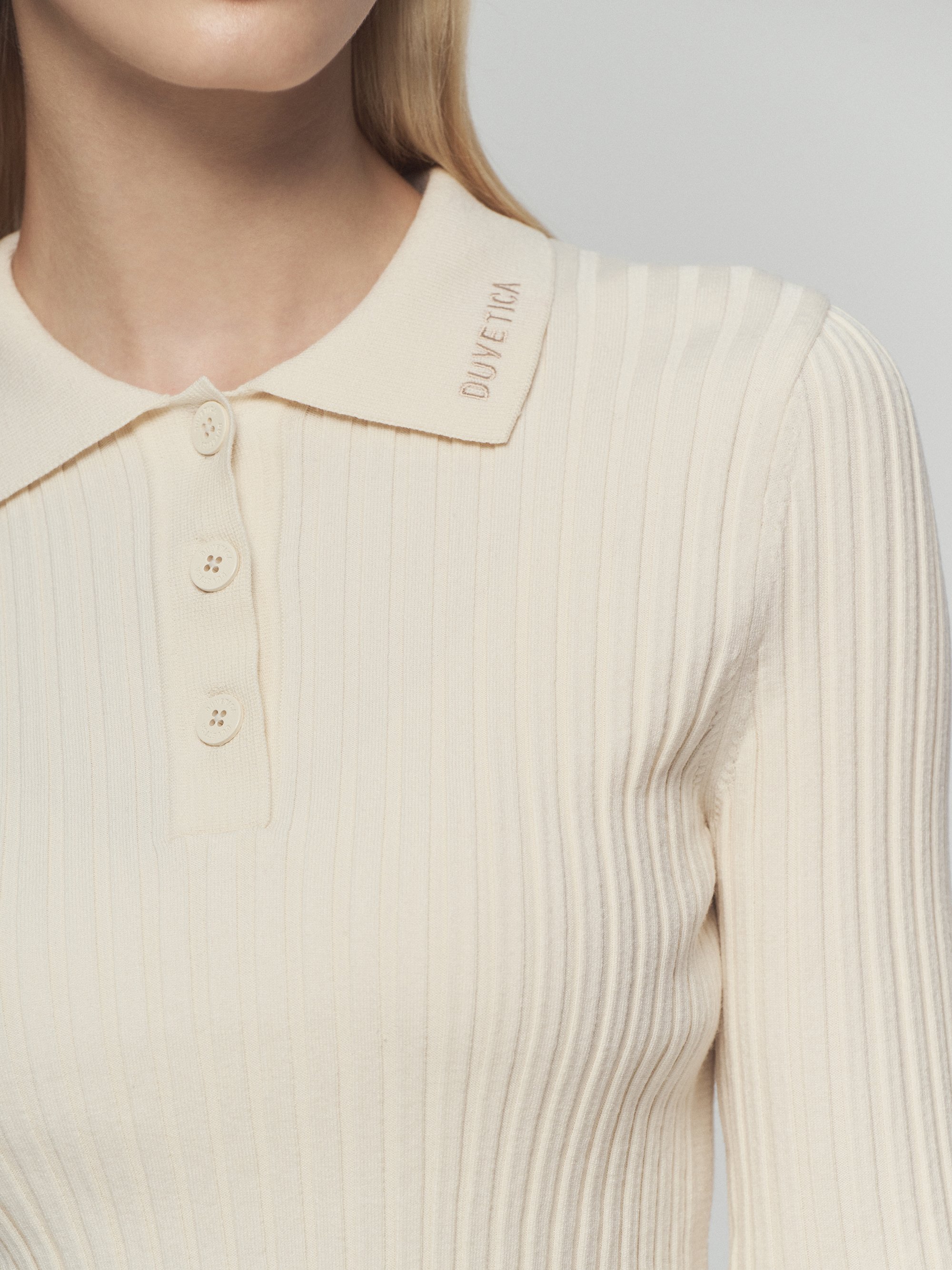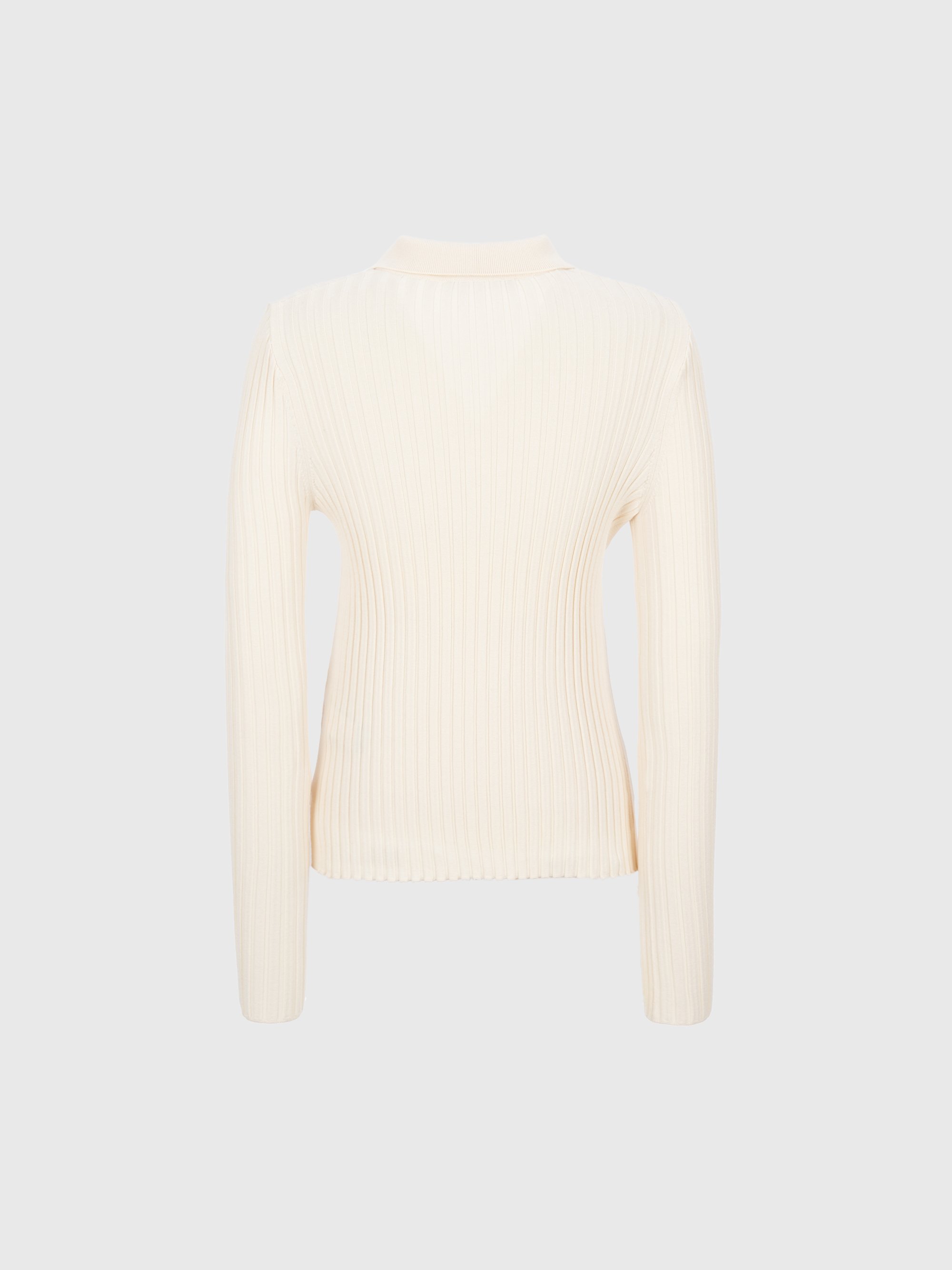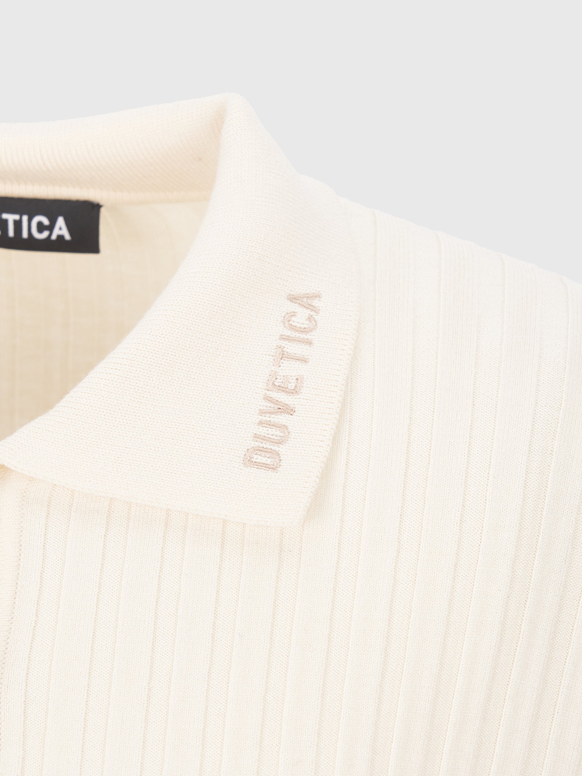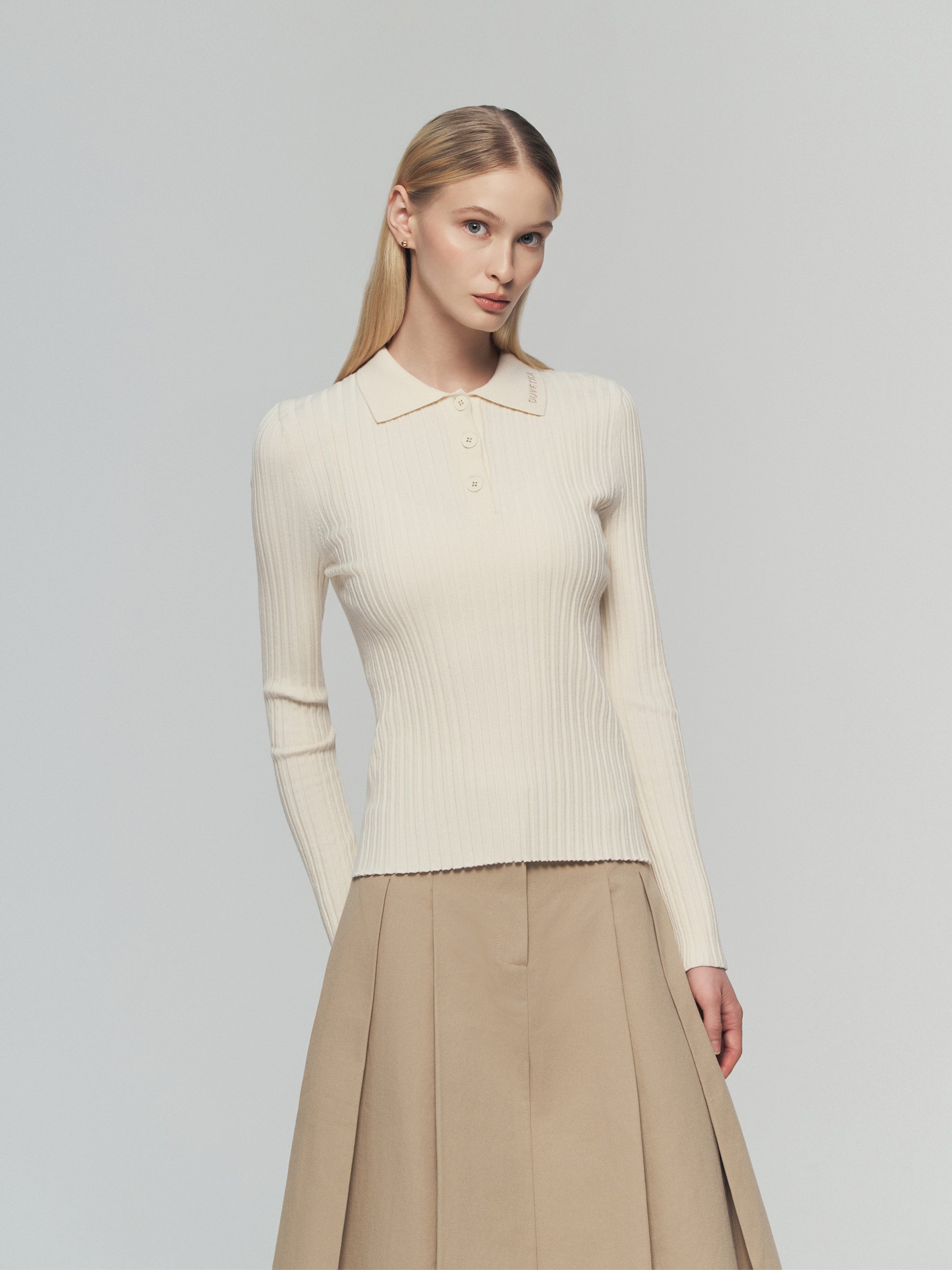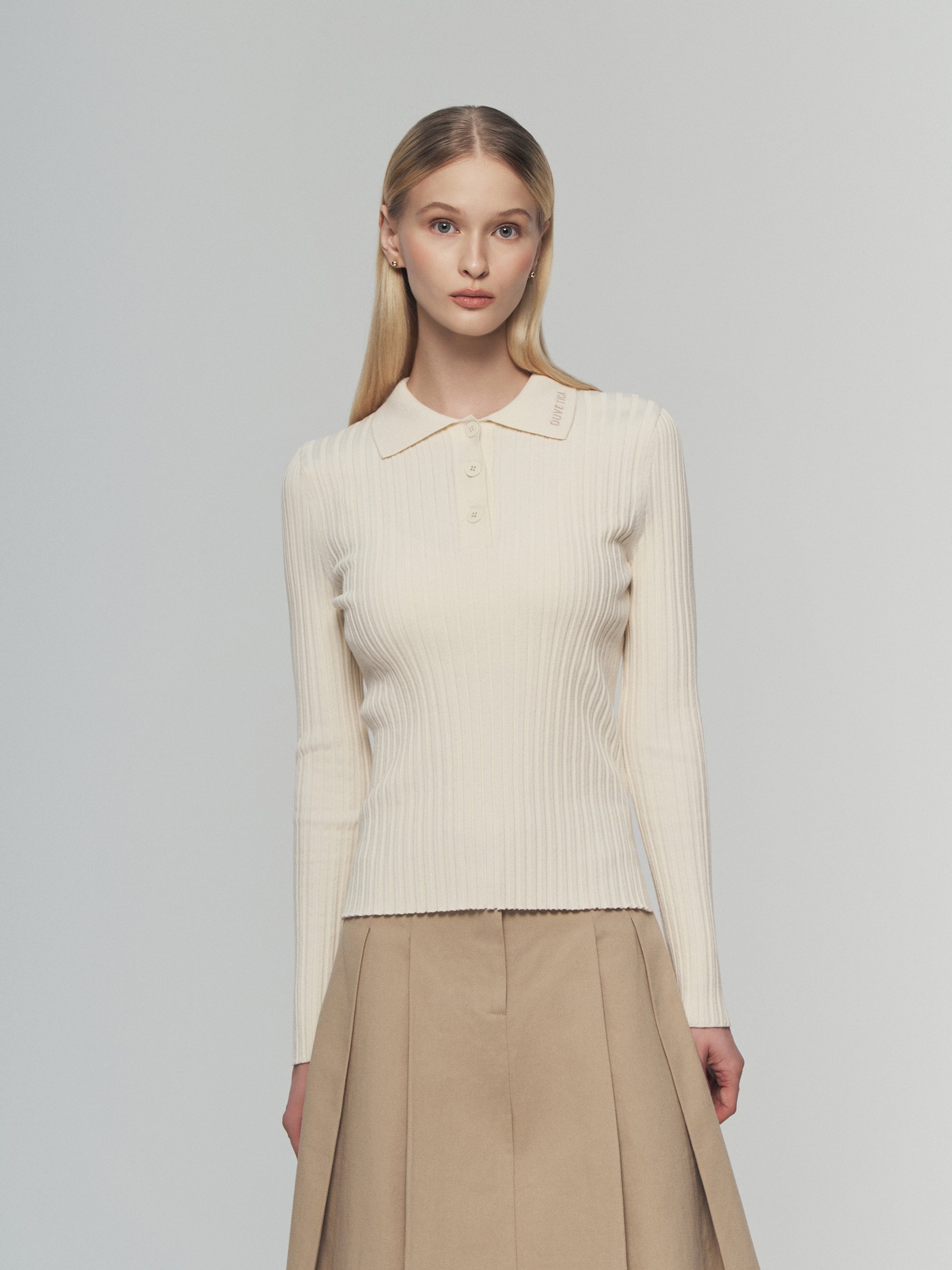 - 소매 안쪽 절개에 니팅으로 로고 포인트를 준 슬림핏 버튼형 카라넥 니트