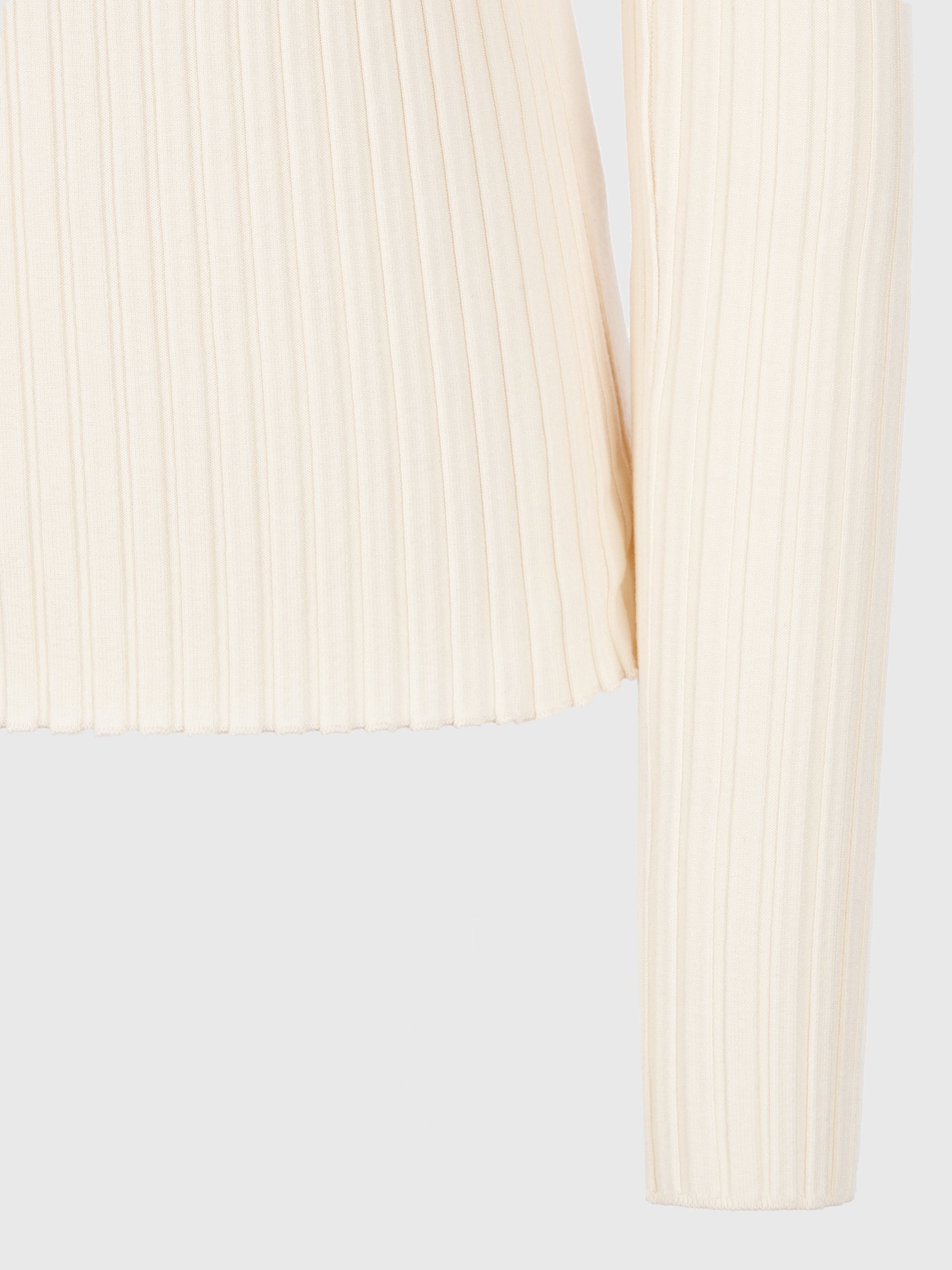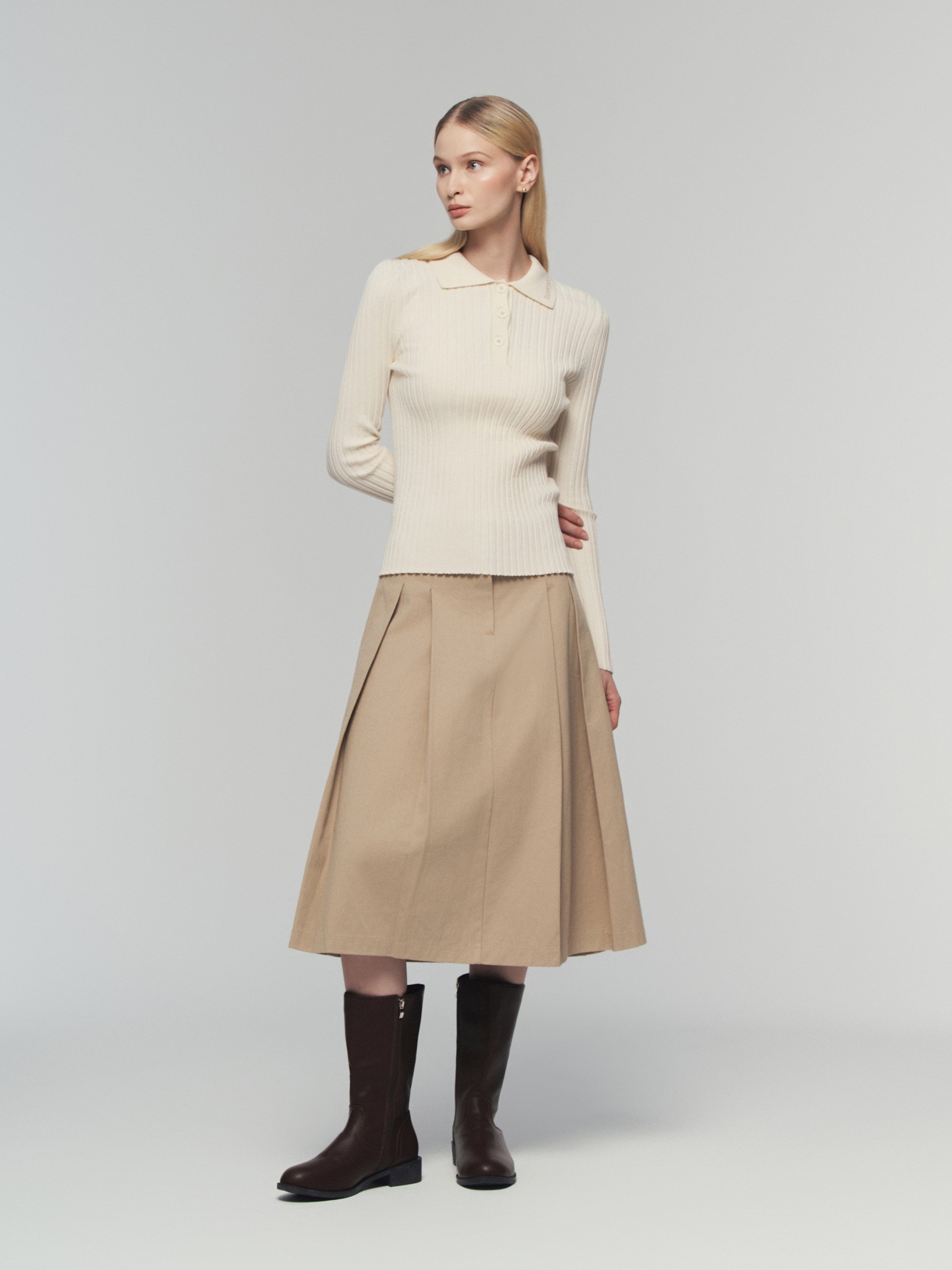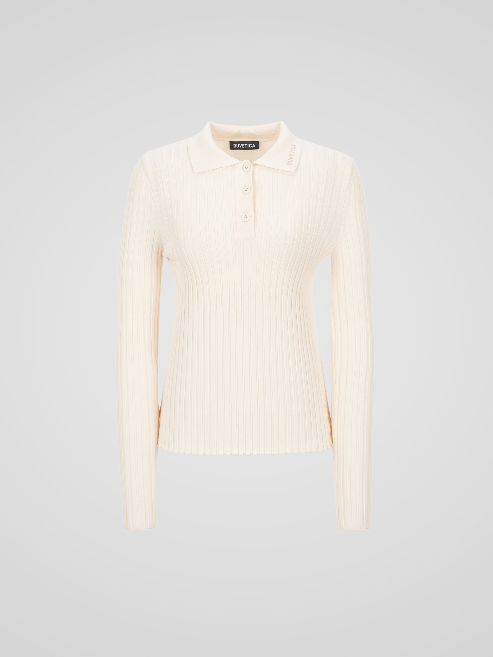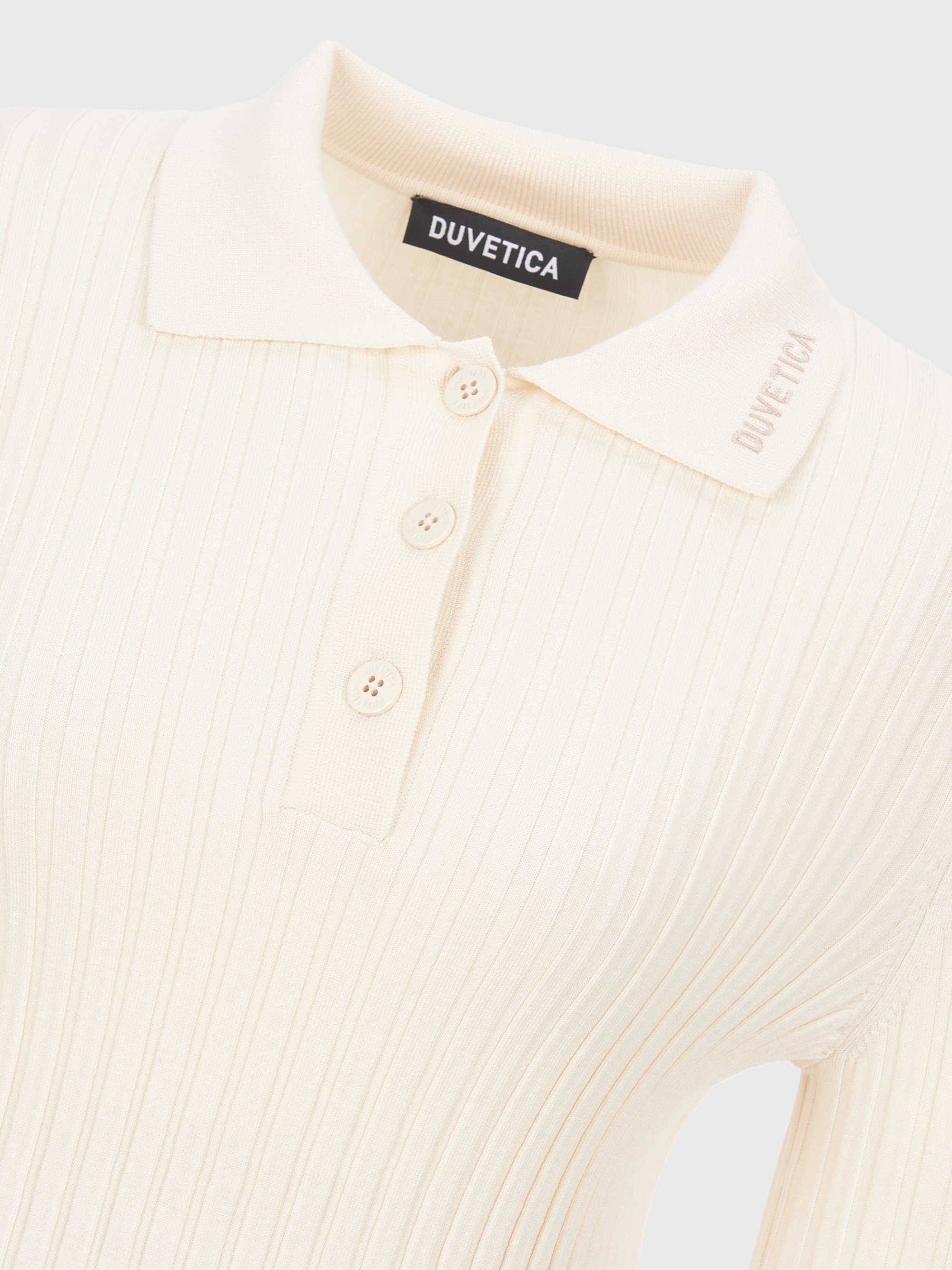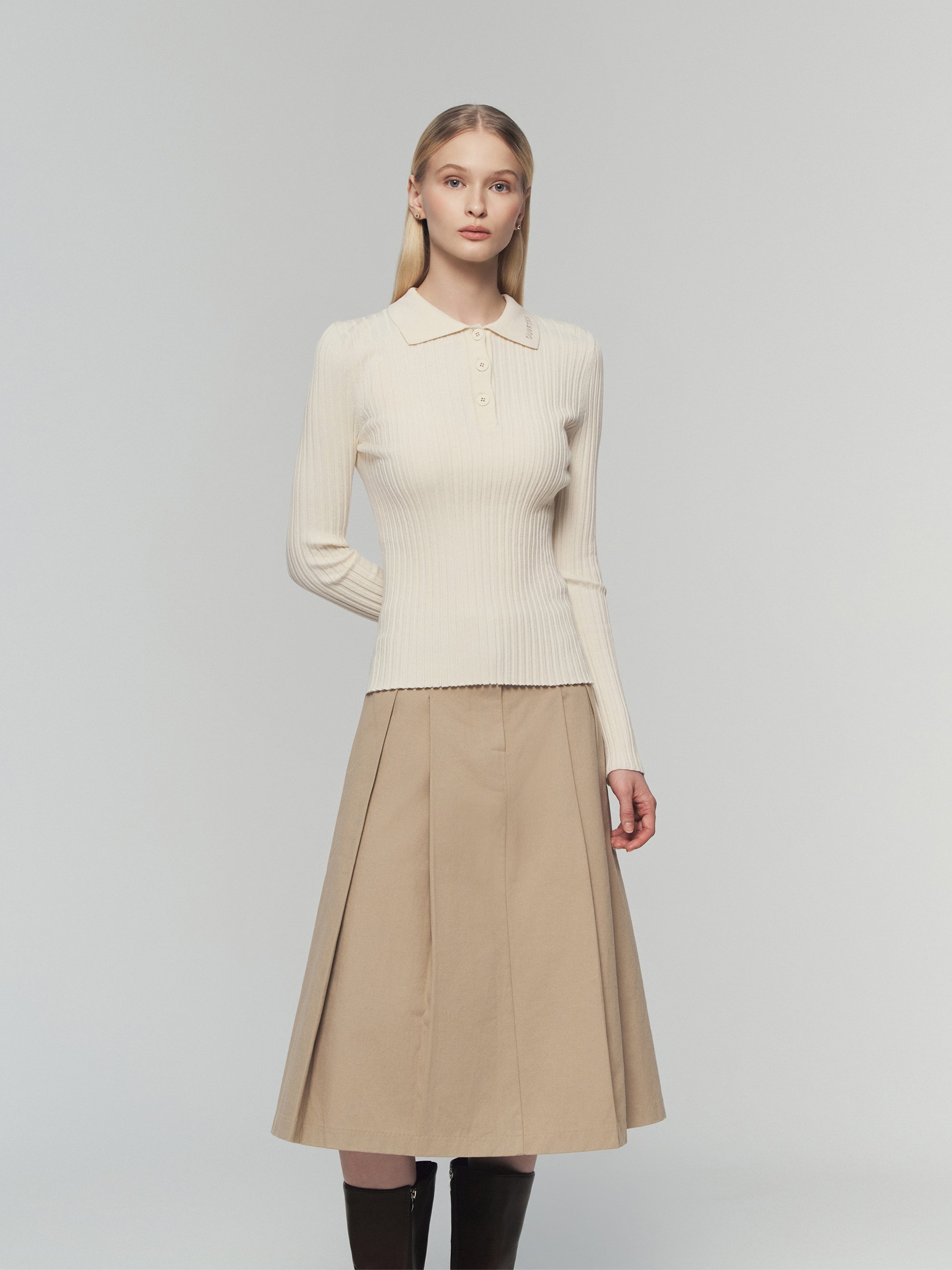 - 소매 안쪽 절개에 니팅으로 로고 포인트를 준 슬림핏 버튼형 카라넥 니트