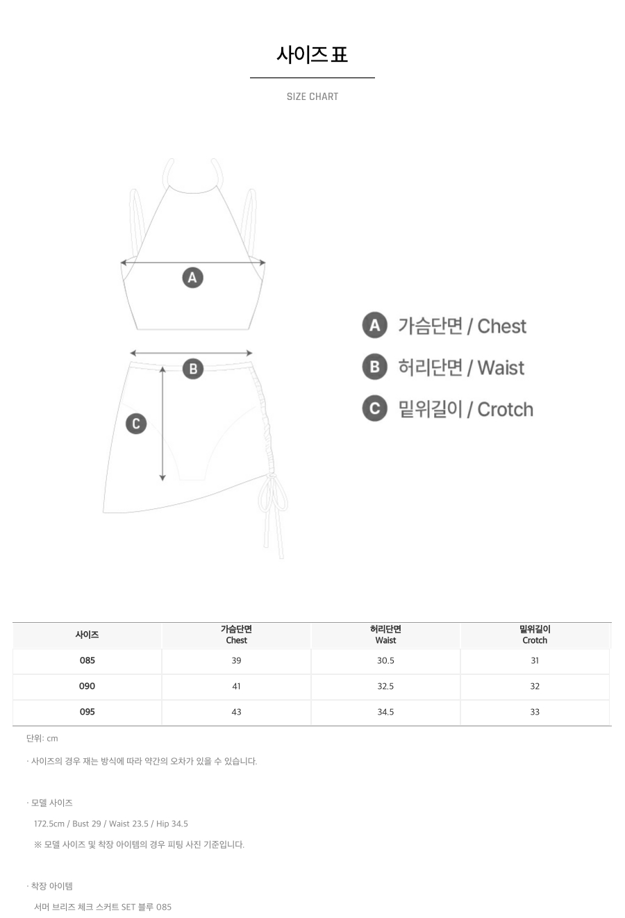 | 소재 | 홀터넥 겉감: 폴리에스터 85%, 폴리우레탄 15% / 브라 겉감: 나일론 68%, 면 31%, 폴리우레탄 1% / 상의 안감: 폴리에스터 73%, 폴리우레탄 27% / 스커트 겉감: 폴리에스터 85%, 폴리우레탄 15% / 팬티 겉감: 폴리에스터 84%, 폴리우레탄 16% / 하의 안감: 폴리에스터 73%, 폴리우레탄 27% |