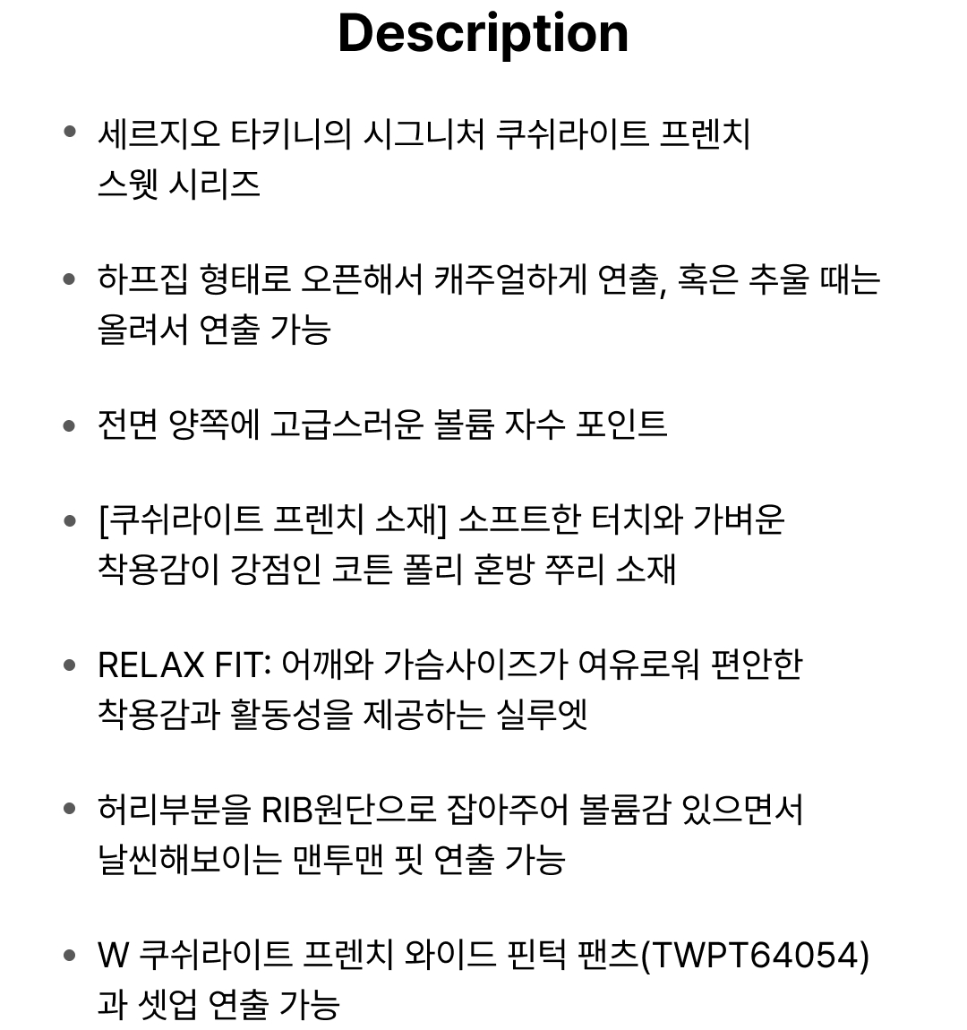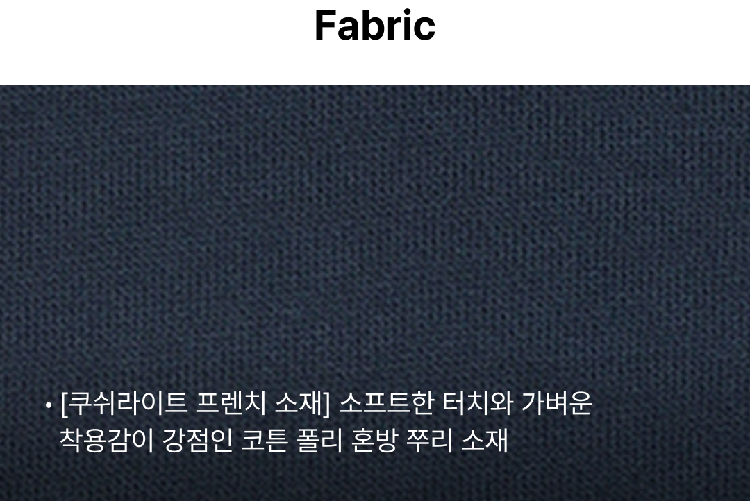 | 소재 | 겉감1 면58% 겉감1 폴리에스터42% 겉감2 면92% 겉감2 폴리우레탄8% |