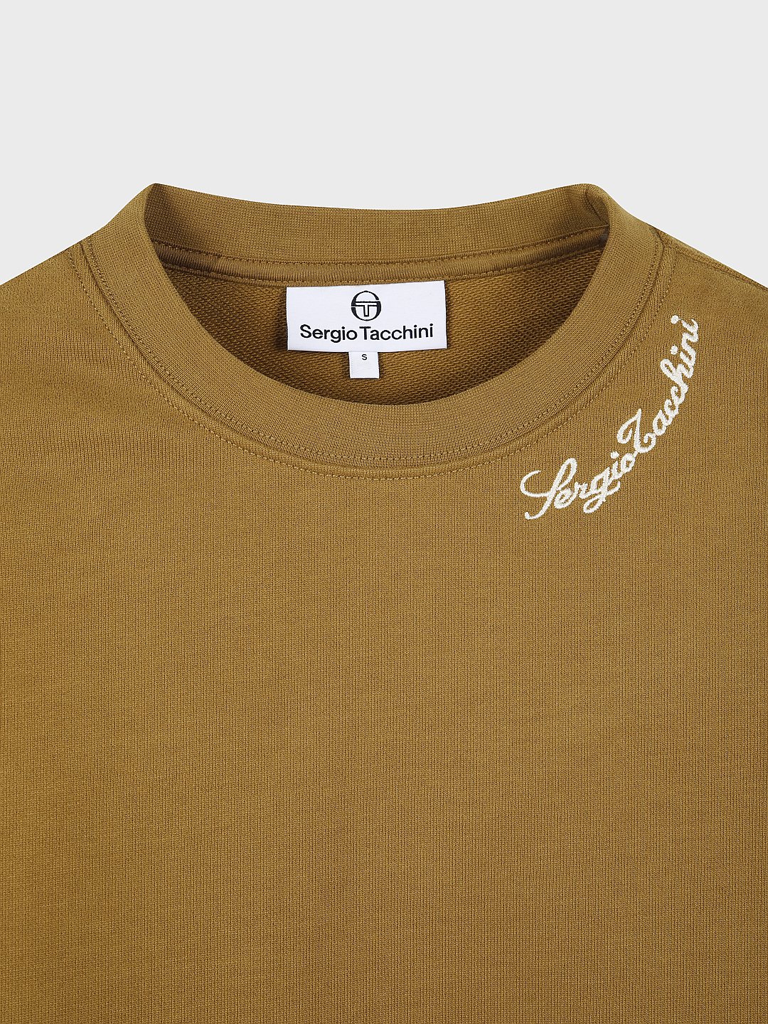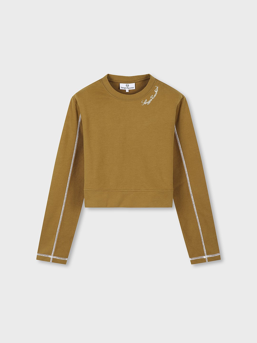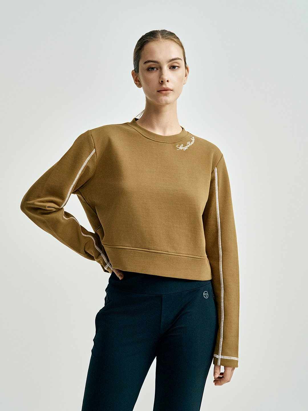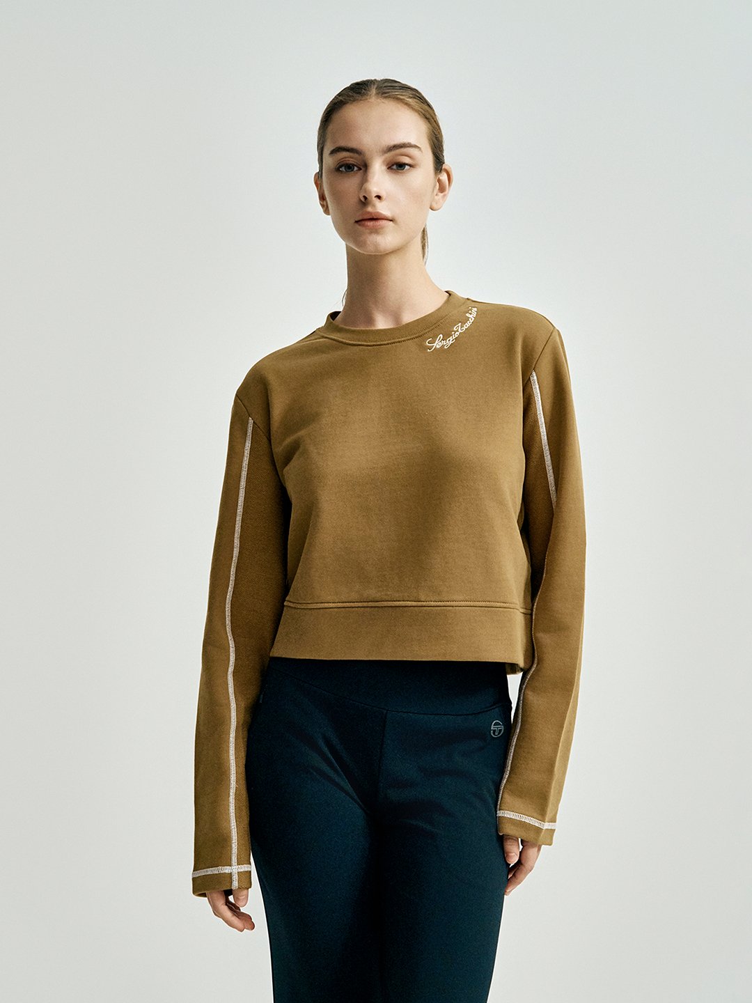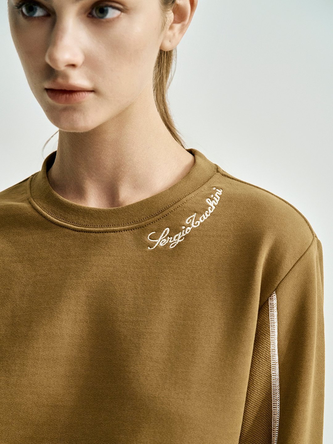 - - 네크 필기체 자수와 소매, 사이드 라인에 스티치 디테일이 적용된 유니크한 디자인의 크루넥 맨투맨