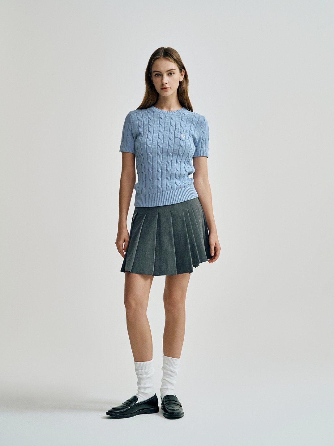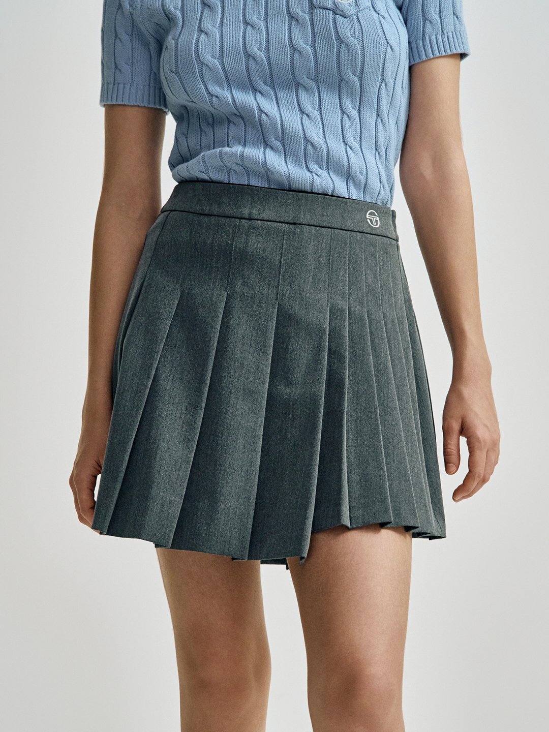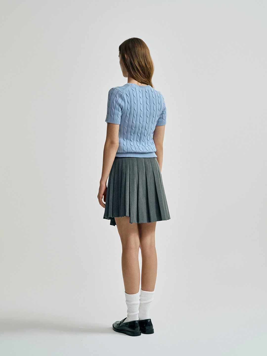 - - 언발란스한 플리츠 기장감이 포인트가 되는 미디 기장의 TR 플리츠 스커트