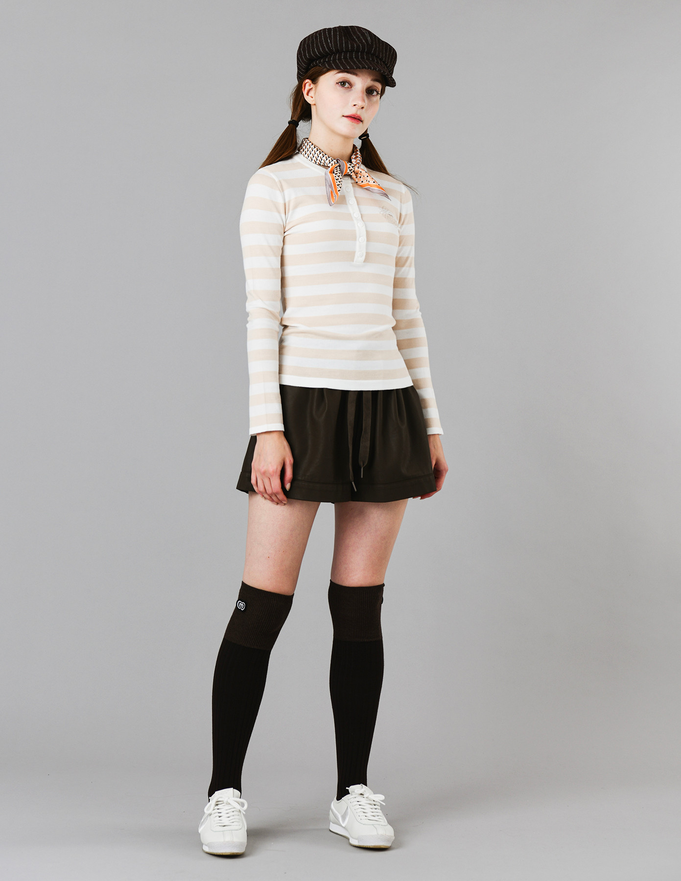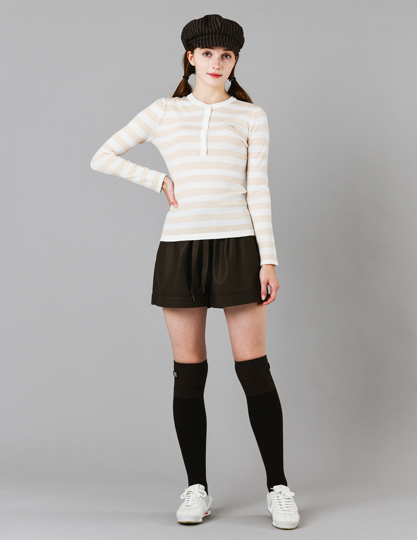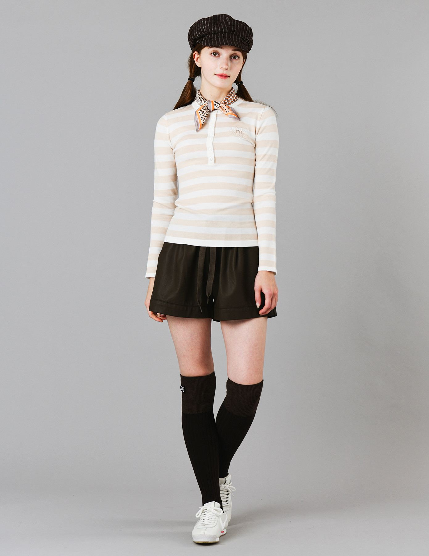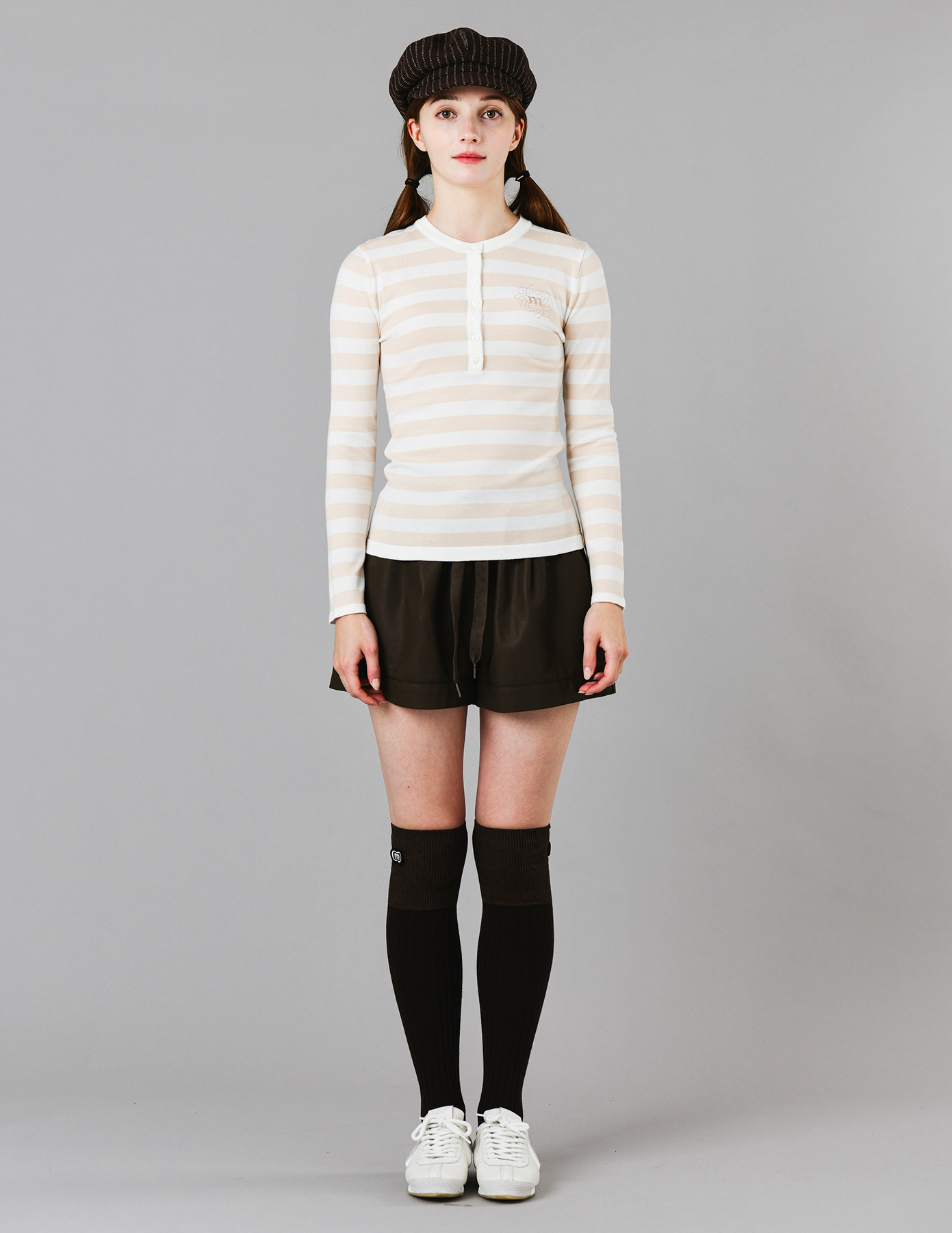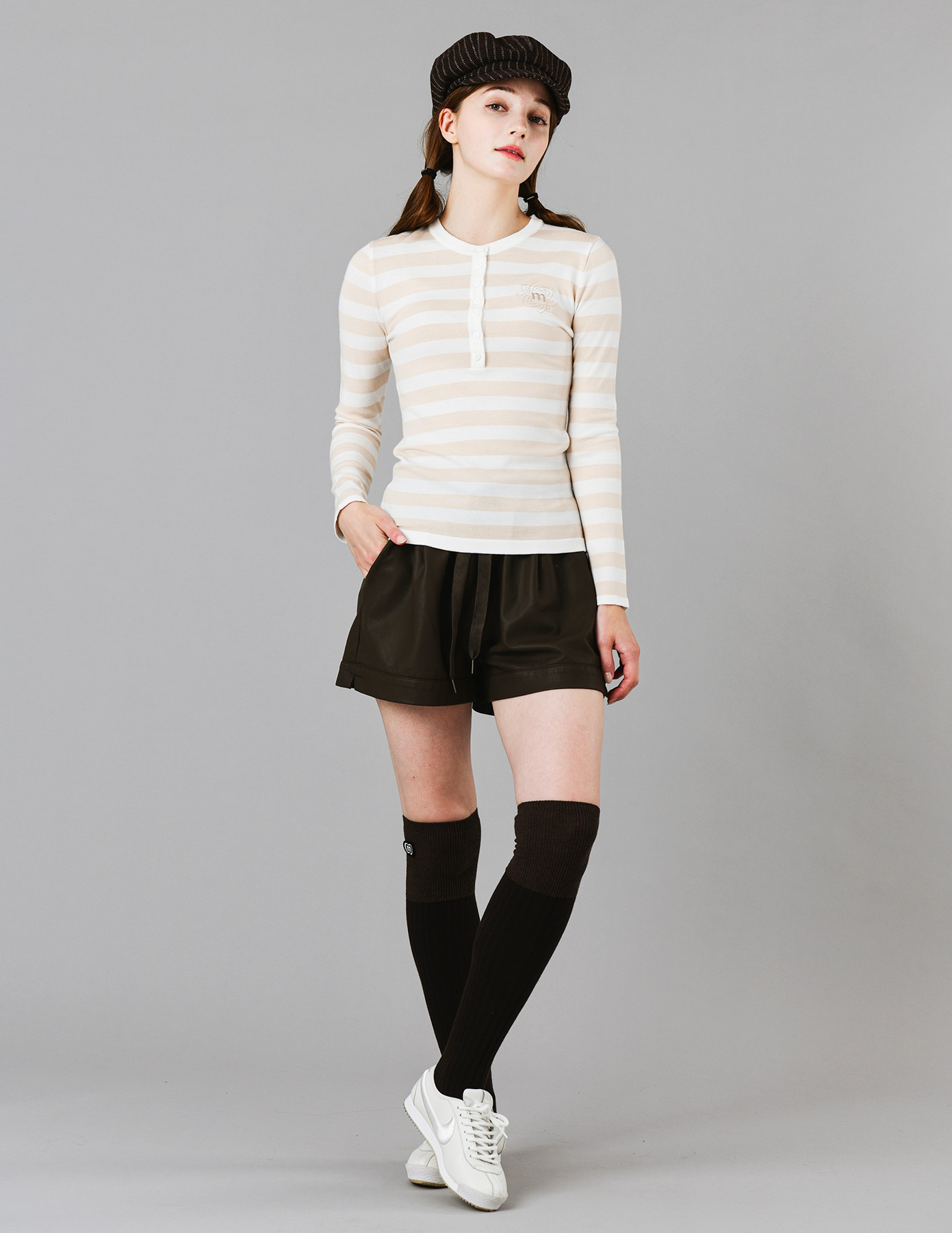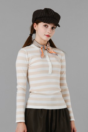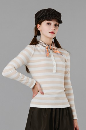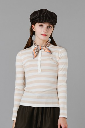 볼드 스트라이프 헨리 넥 피치 베이지 니트