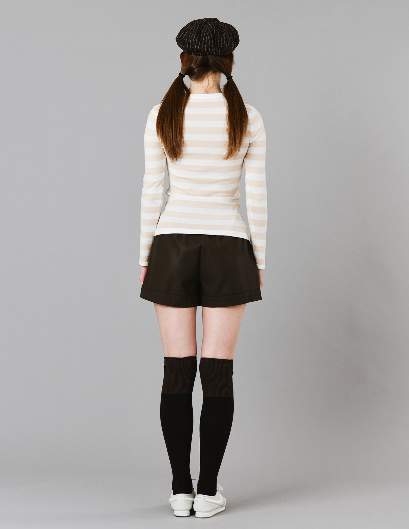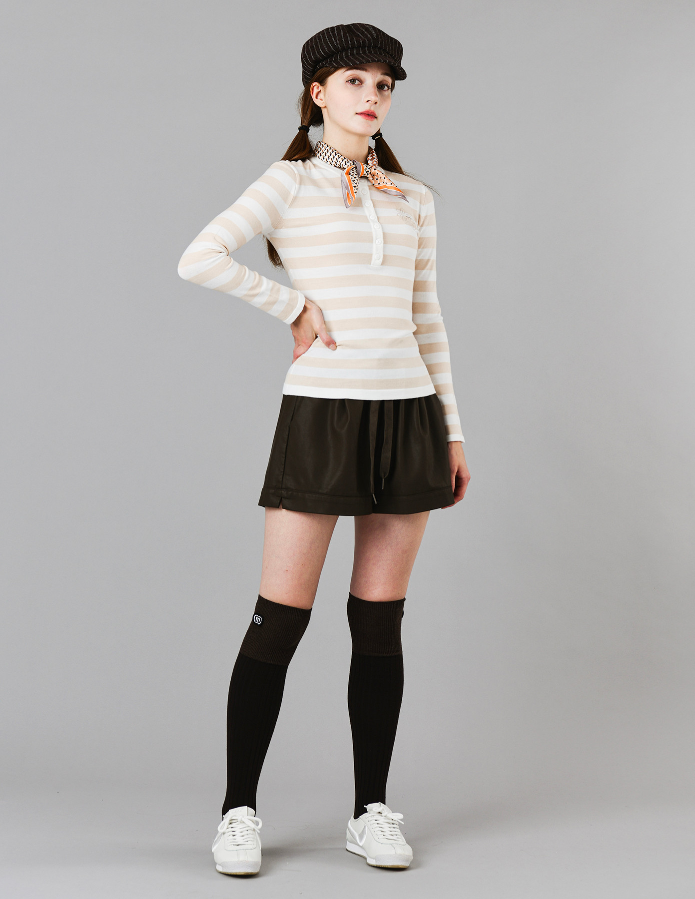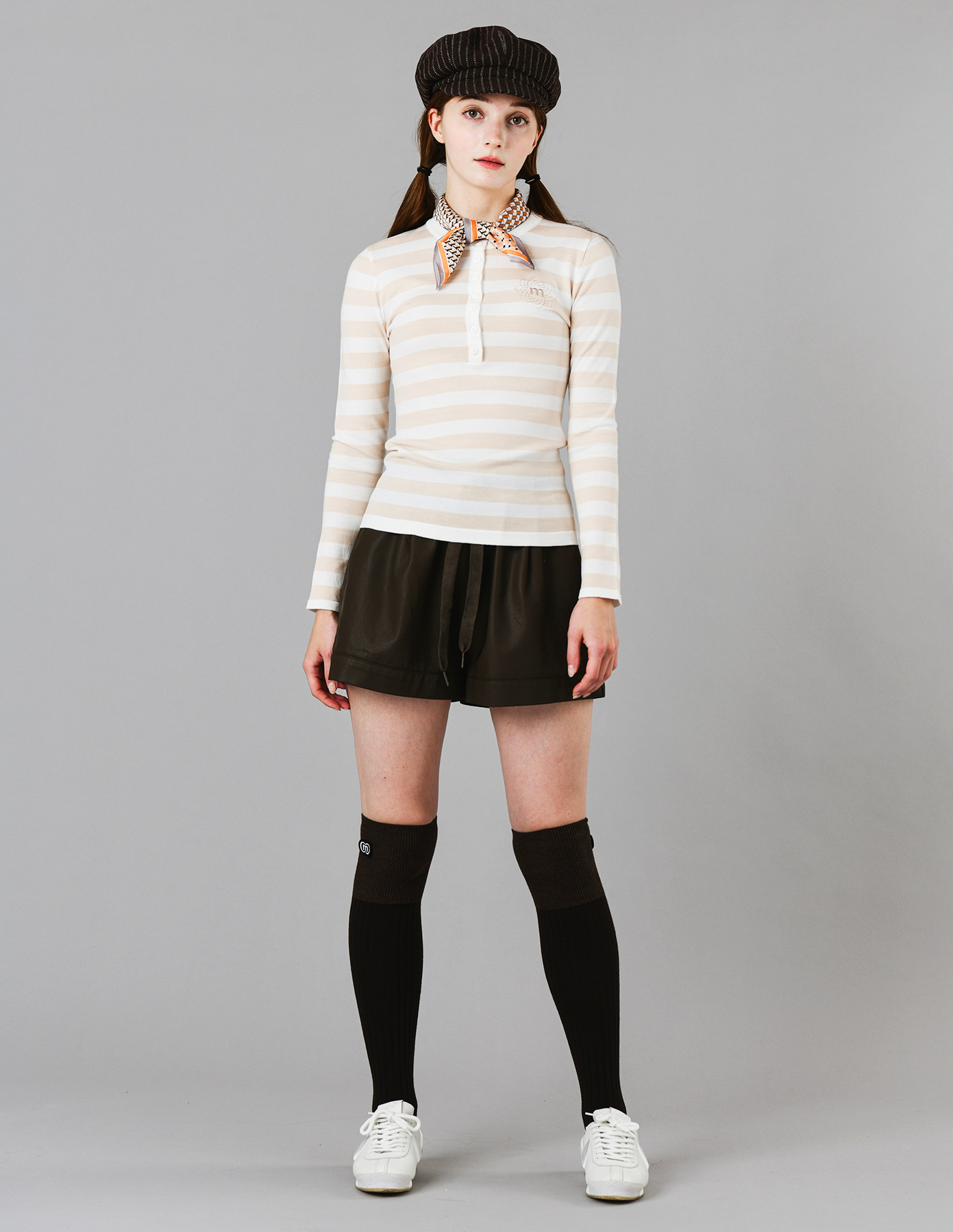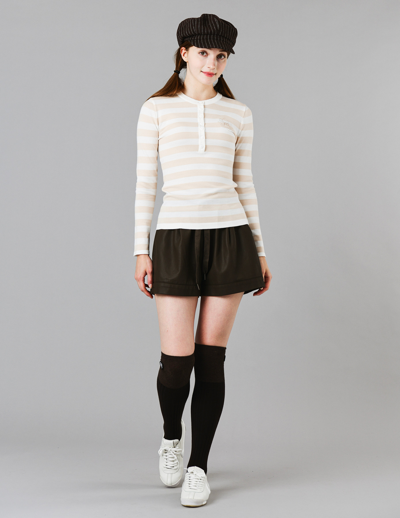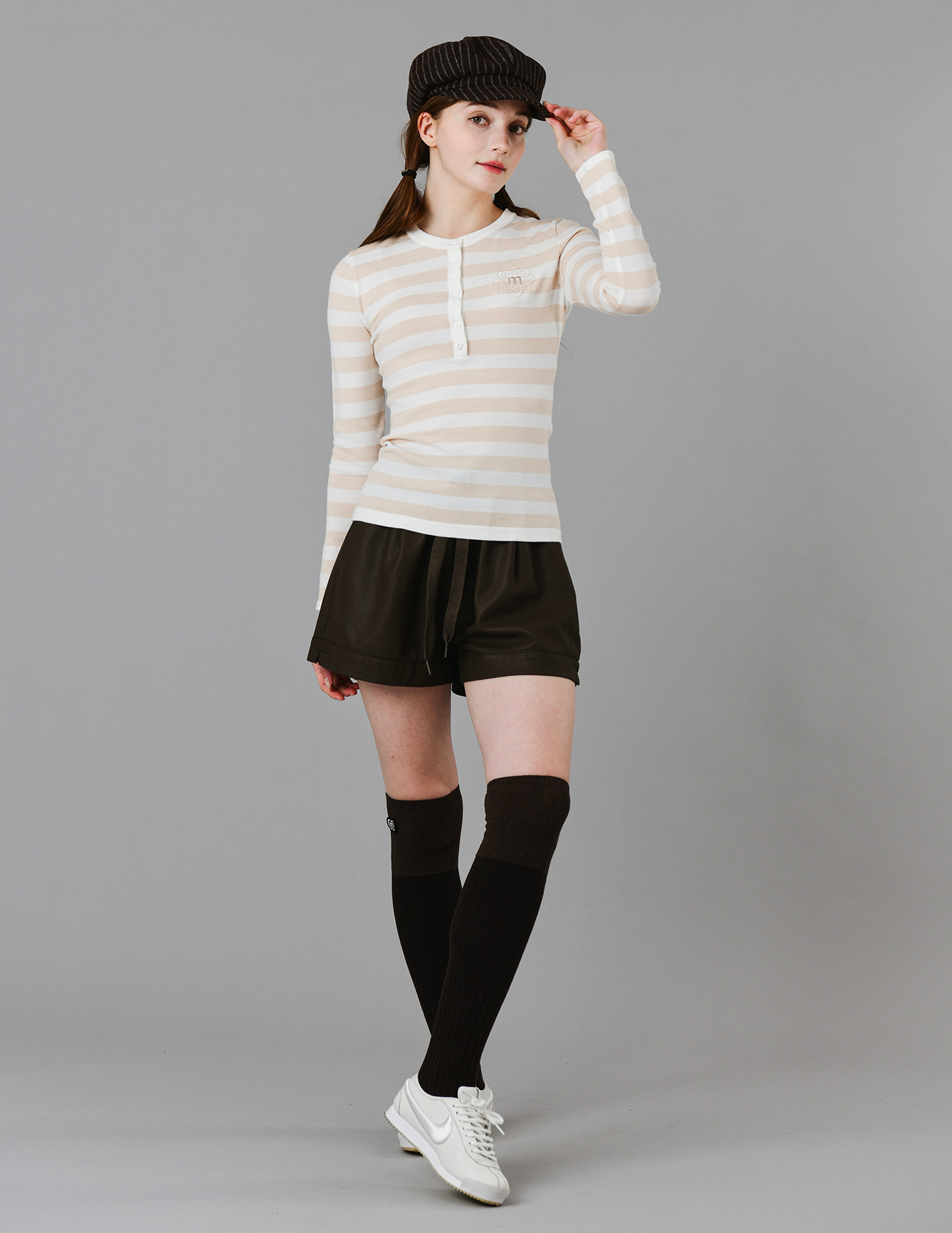 볼드 스트라이프 헨리 넥 피치 베이지 니트