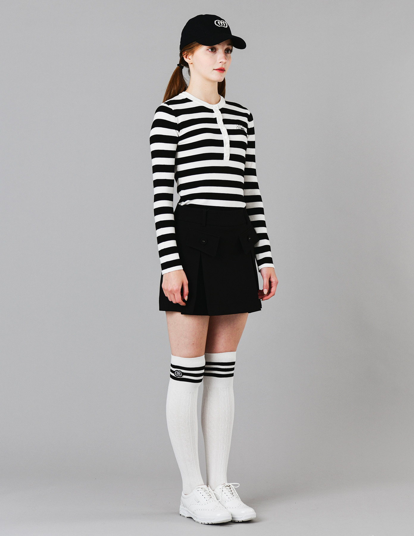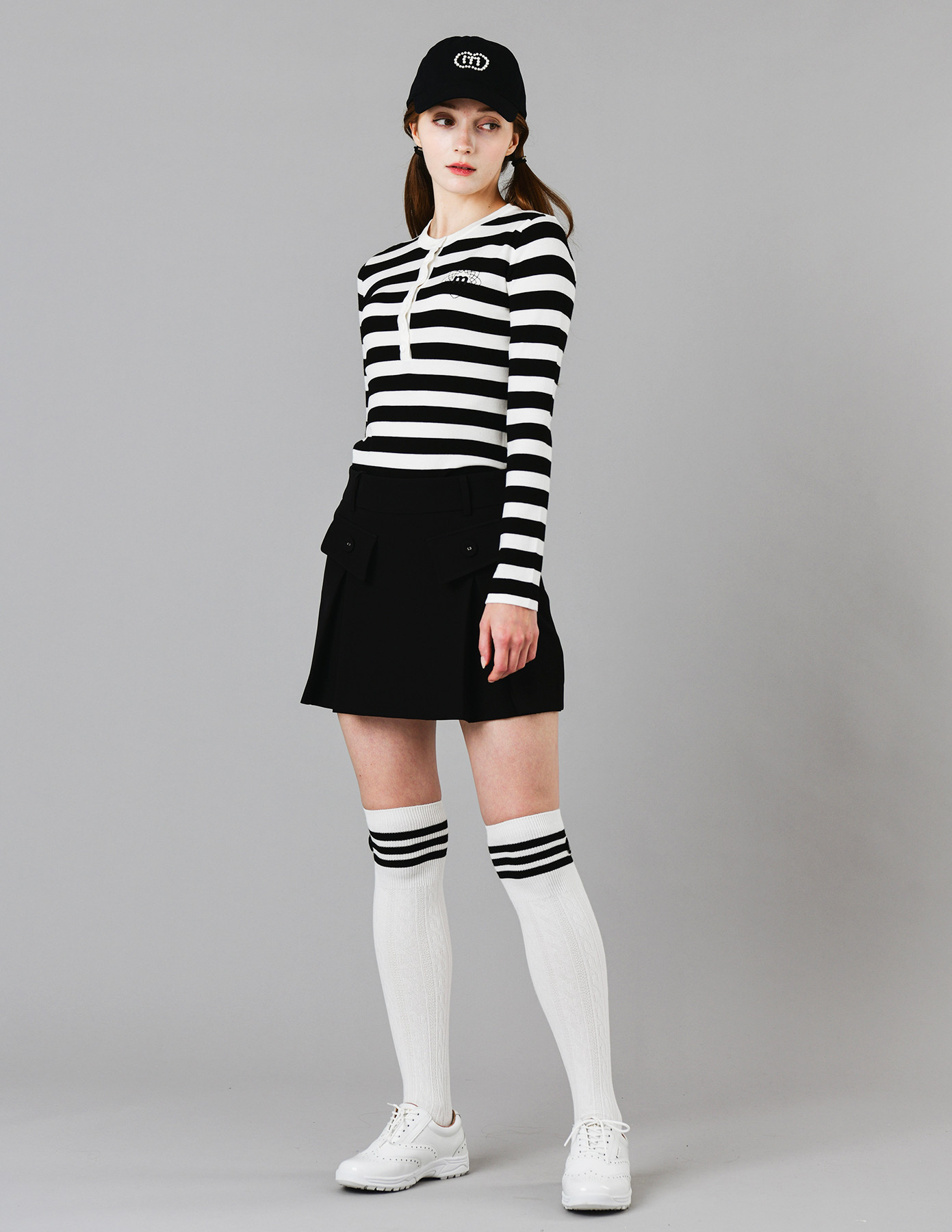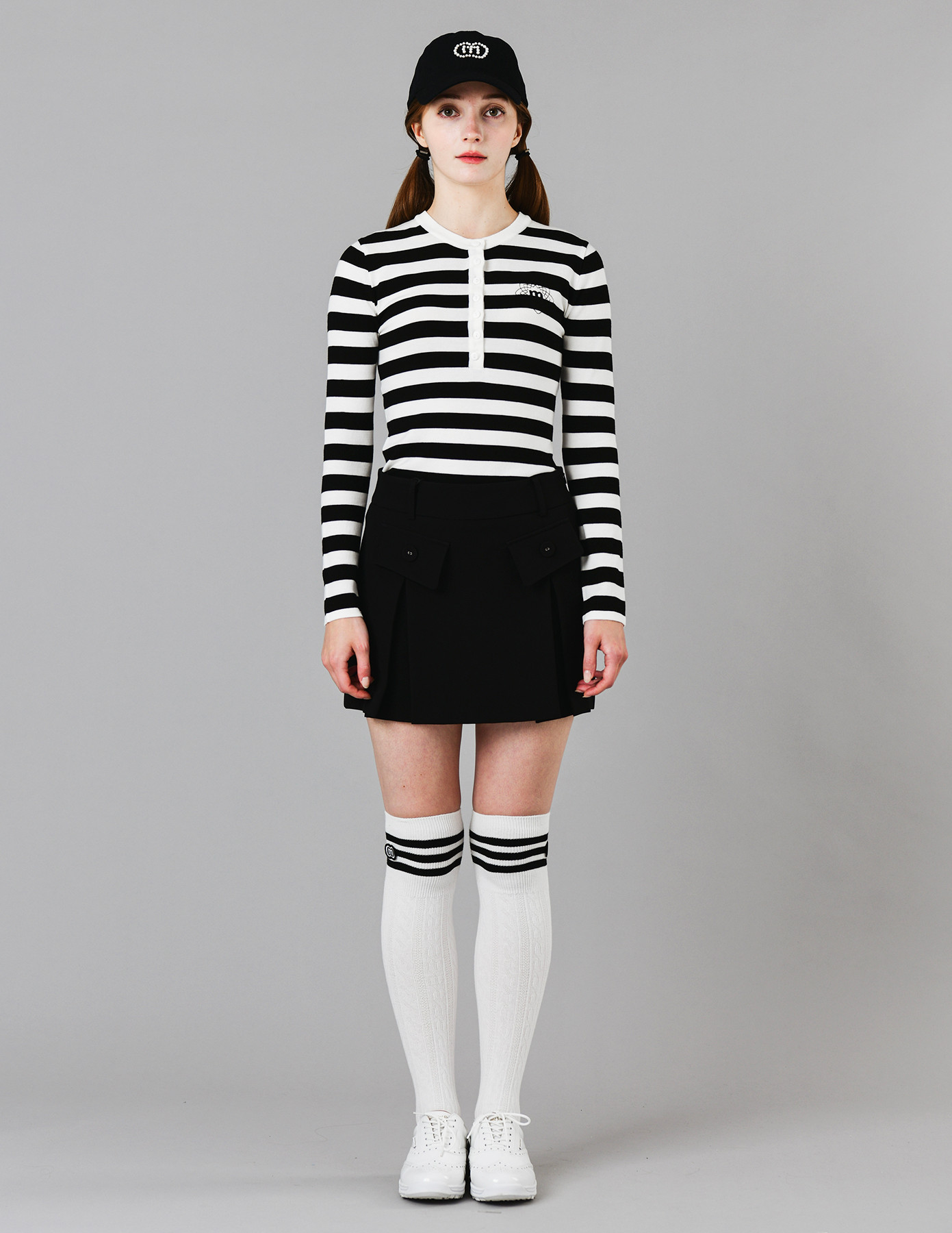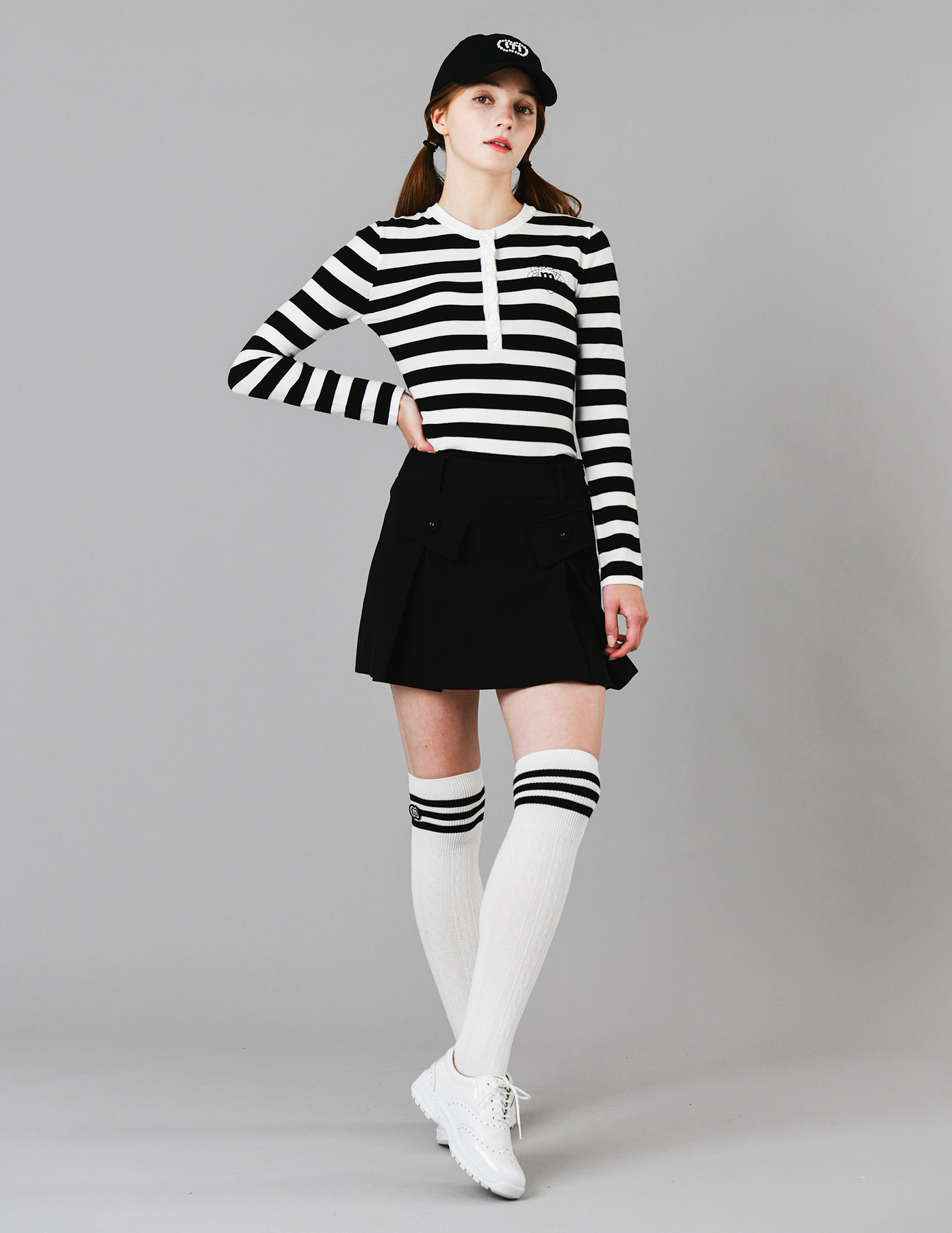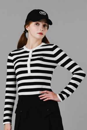 볼드한 스트라이프 자카드 패턴의 헨리넥 니트입니다.