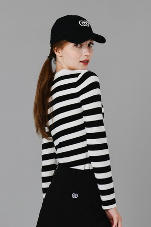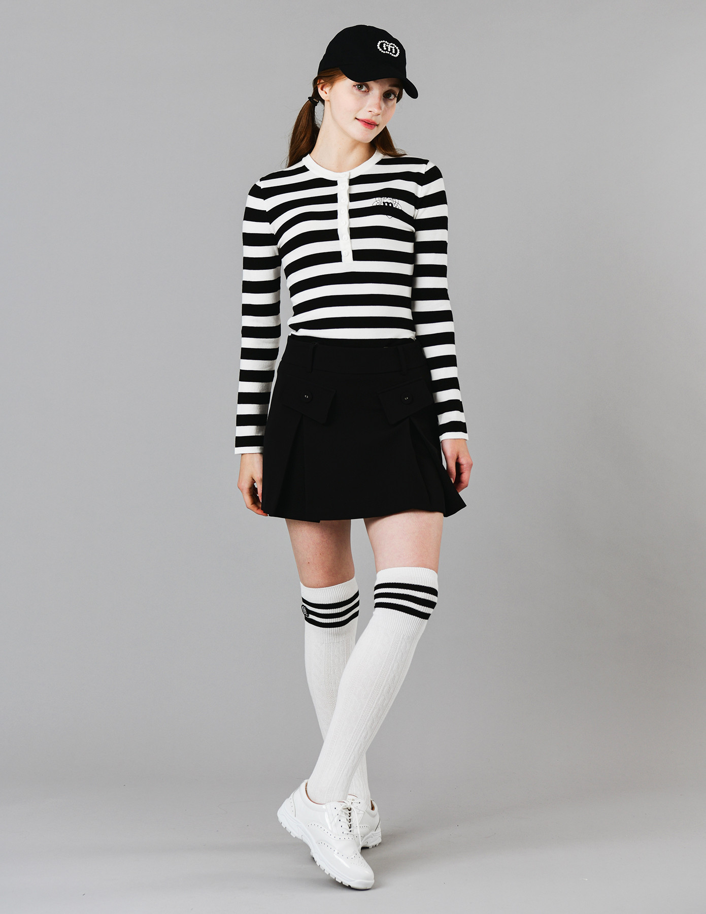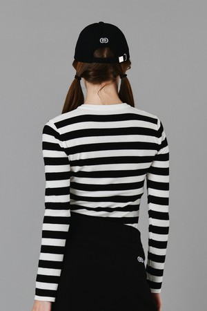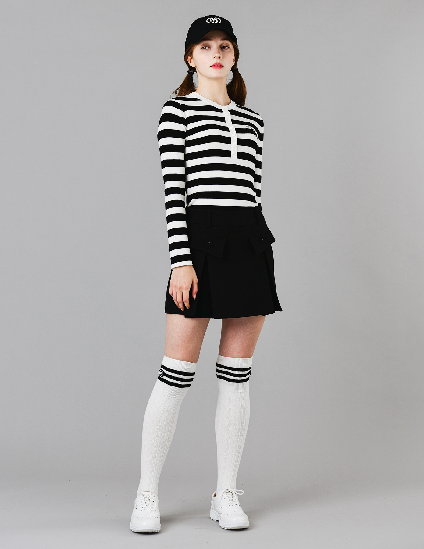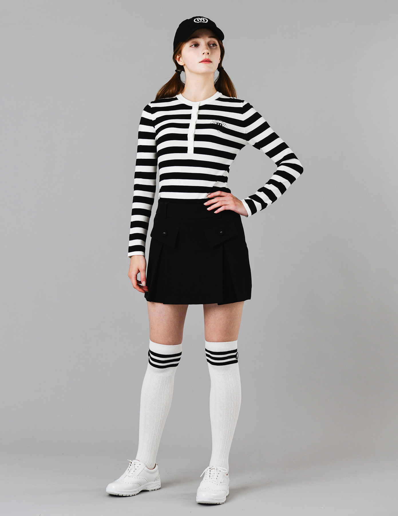 볼드한 스트라이프 자카드 패턴의 헨리넥 니트입니다.