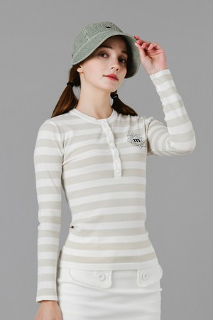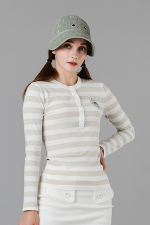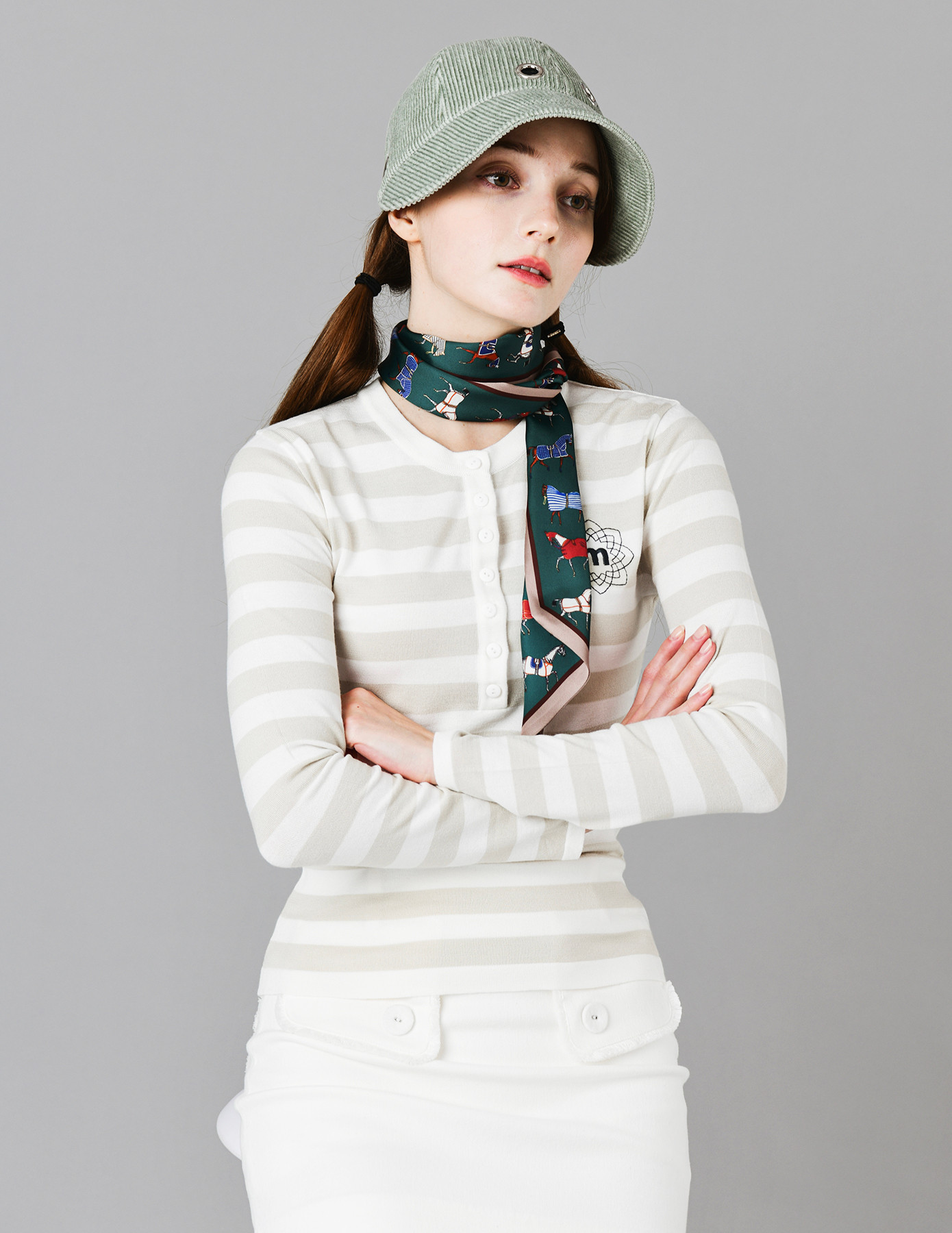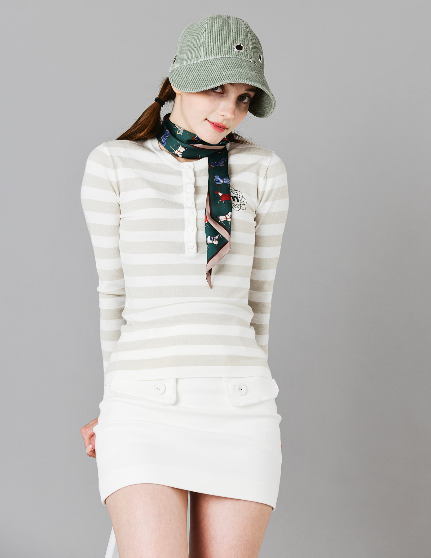 볼드한 스트라이프 자카드 패턴의 헨리넥 니트입니다.