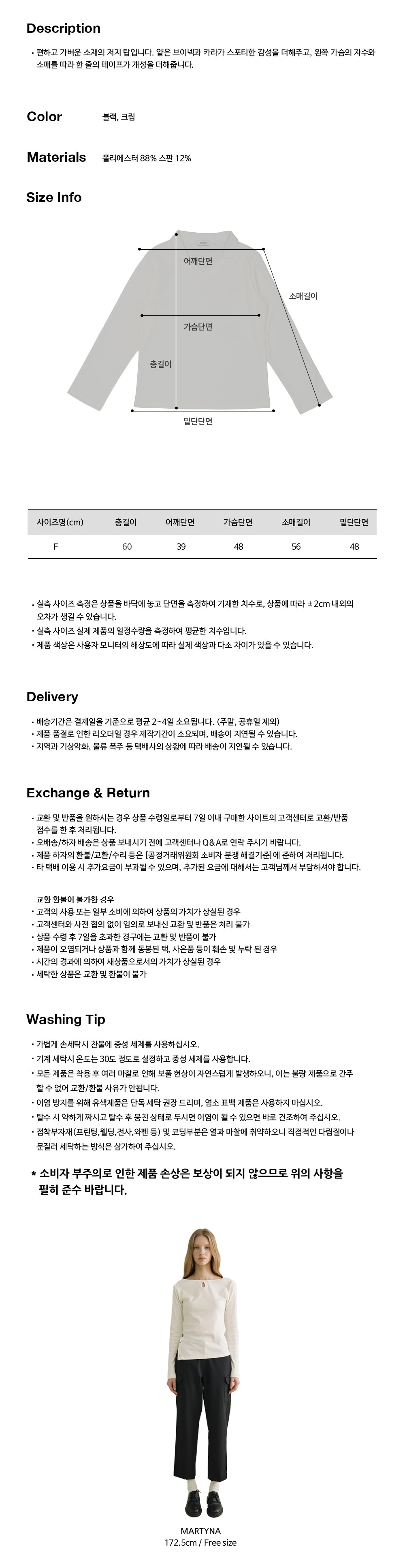치수총길이 60, 어깨단면 39, 가슴단면 48, 소매길이 56, 밑단단면 48(cm)