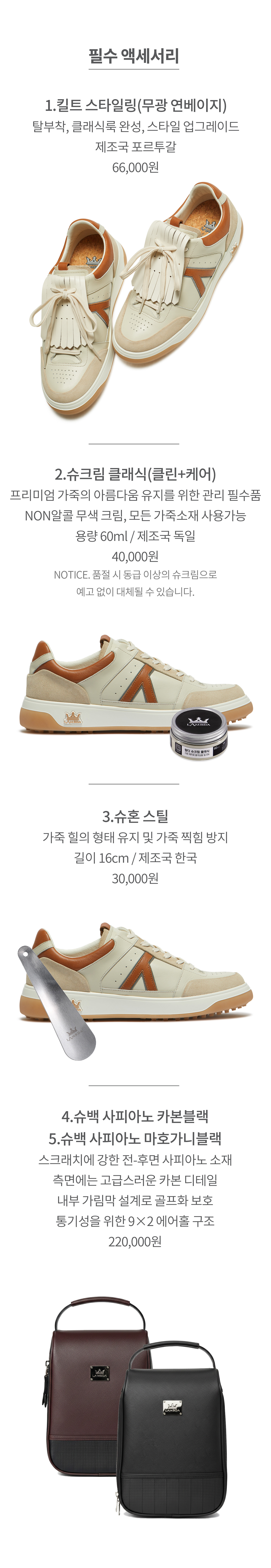 | 소재 | UPPER 2겹 소가죽 / SOLE 열가소성 폴리우레탄 |