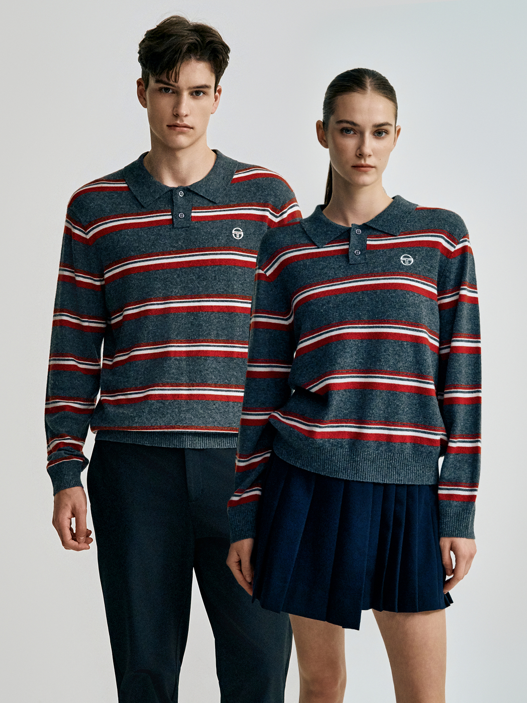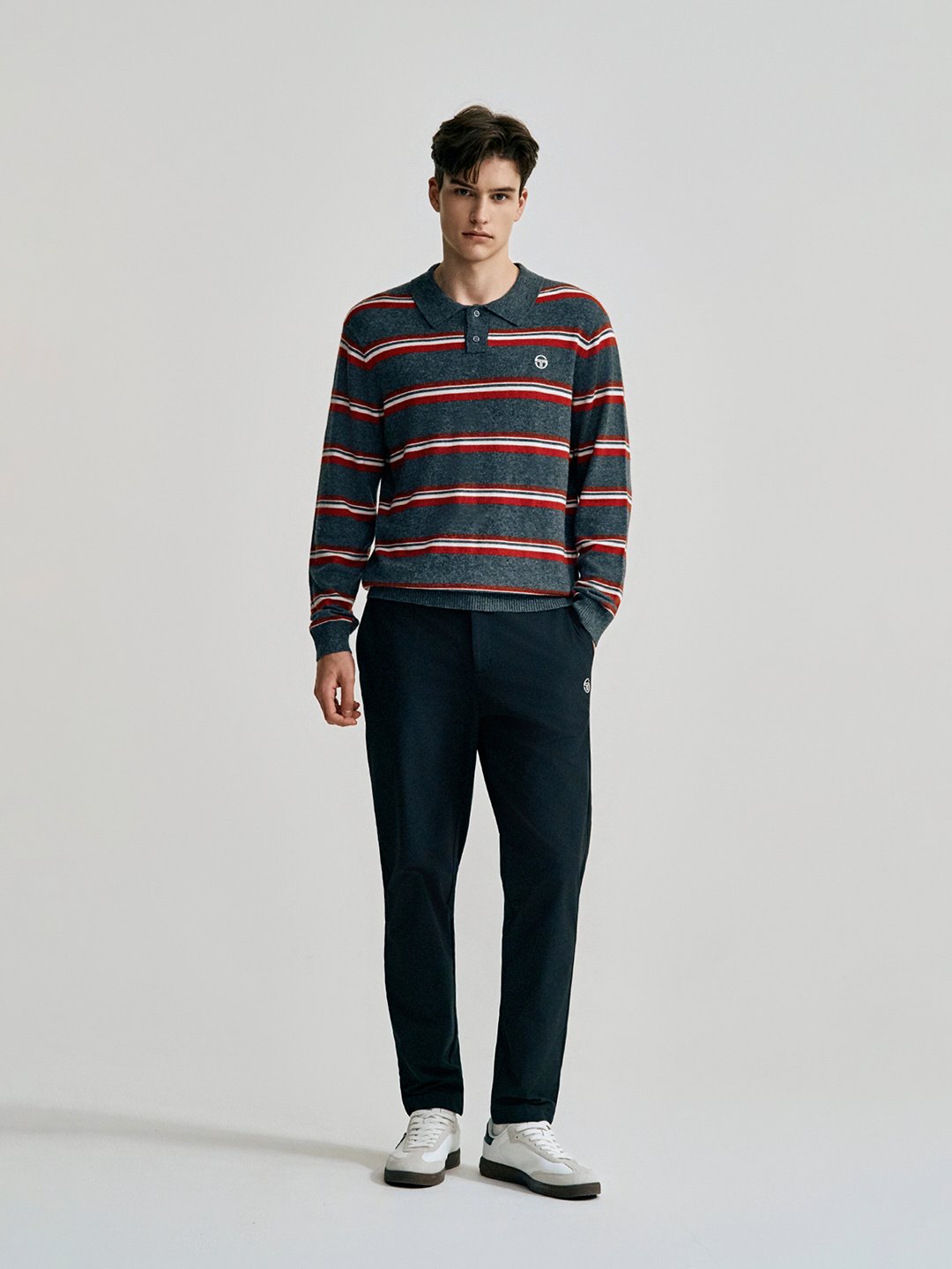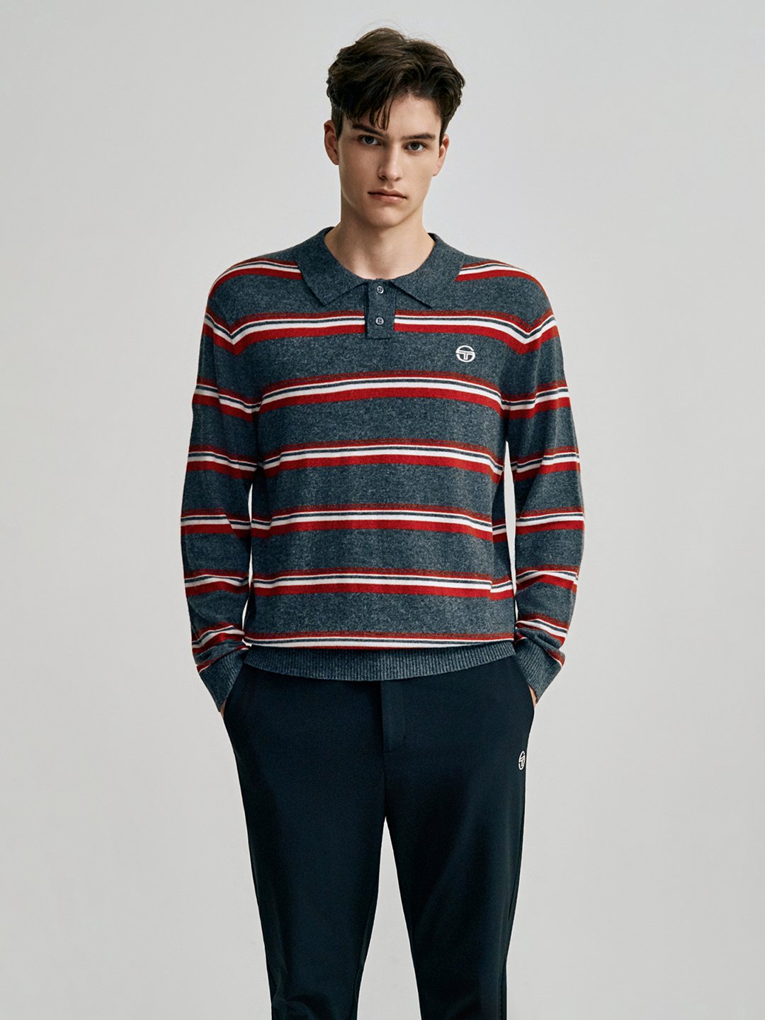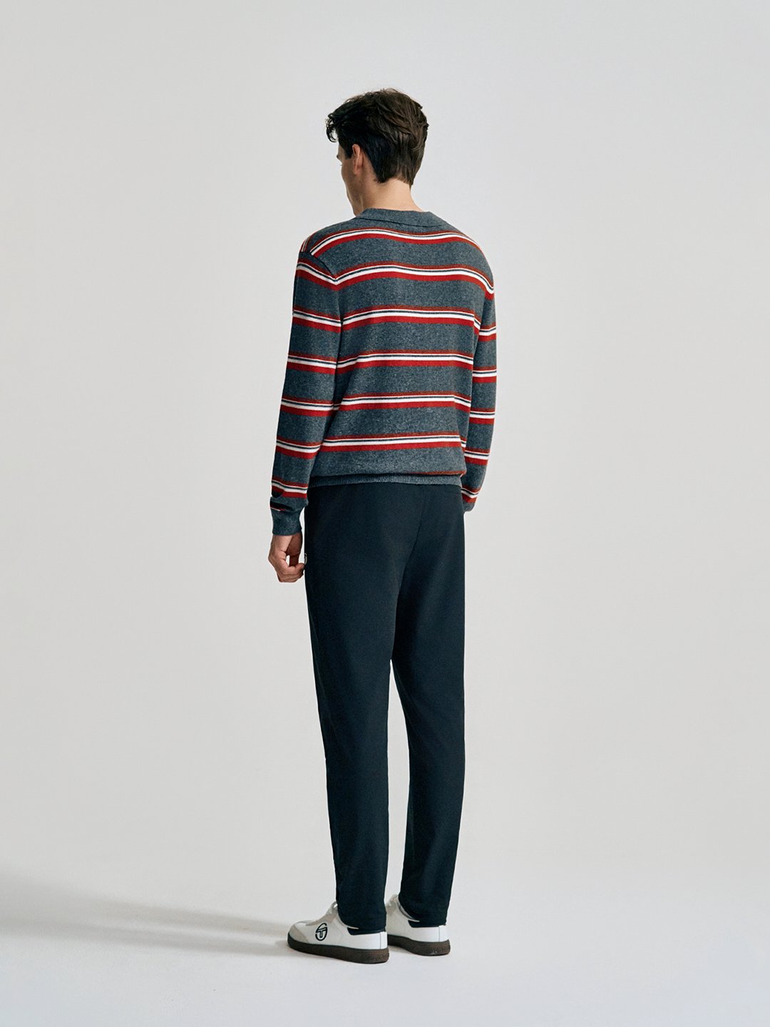 - - 캐시 혼방 원사를 사용한 스트라이프 패턴의 유니섹스 폴로 스웨터