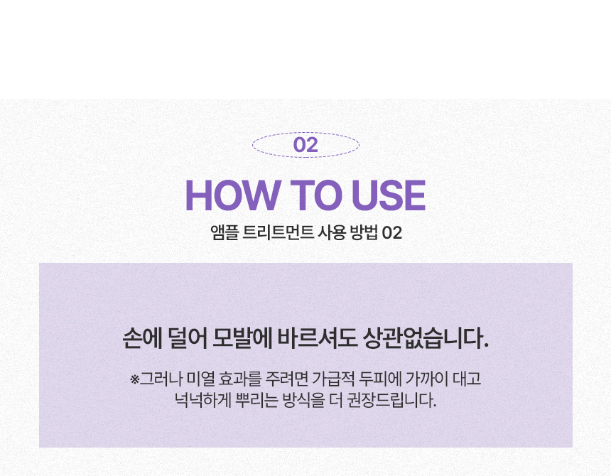 | 사용방법 | 1일 1회 두피 및 모발이 젖은 상태에서 적당량을 손에 덜어 모발과 두피에 가볍게 마사지 하듯이 펴 바른 다음 2~3분 후 미온수로 깨끗이 헹구어 냅니다. |