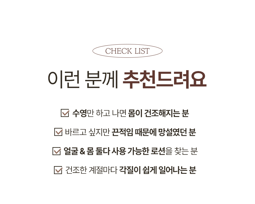 | 사용방법 | 제품 적당량을 덜어 얼굴 또는 몸 전체에 부드럽게 펴 바른 후 흡수시켜줍니다. |
