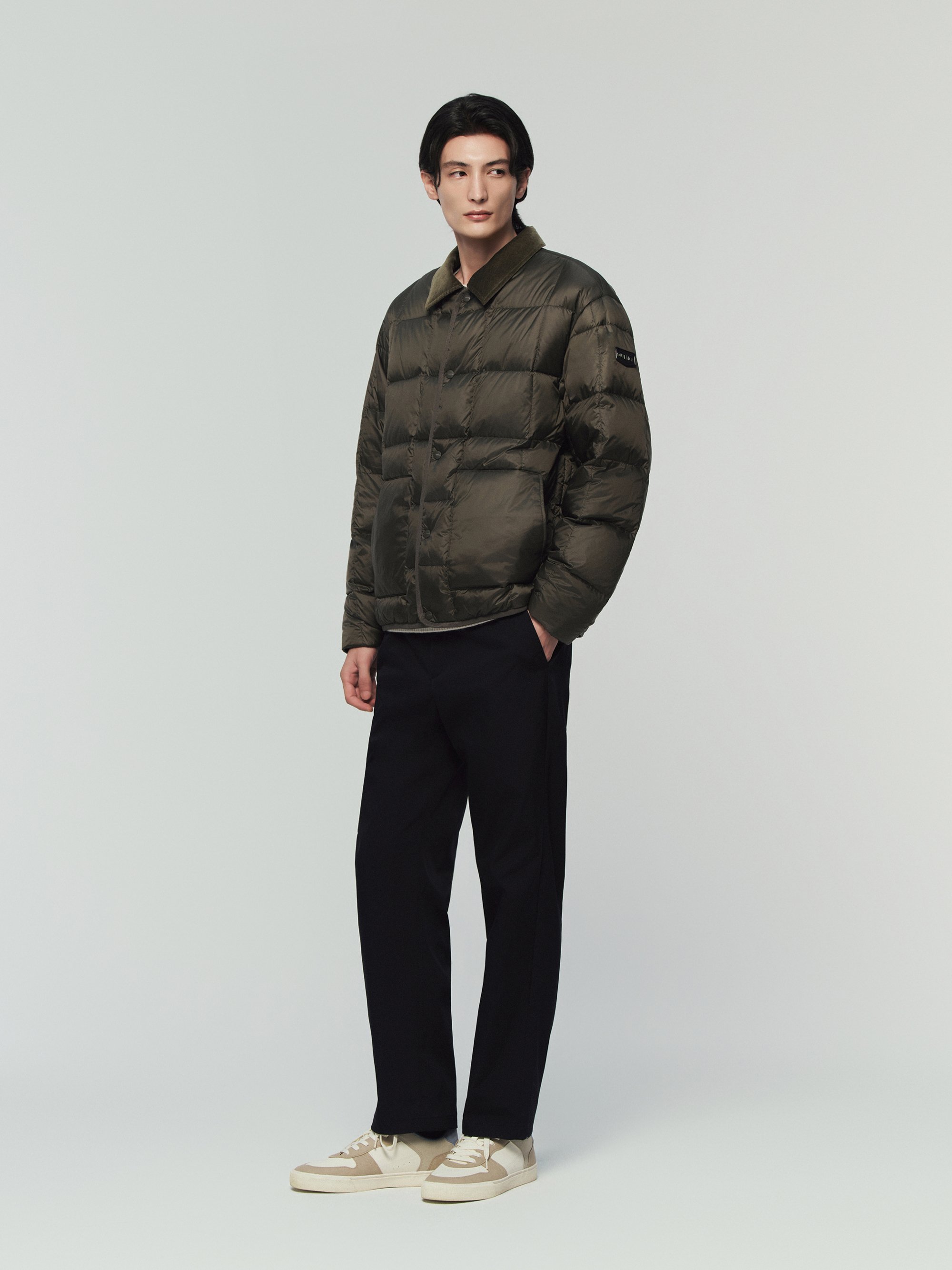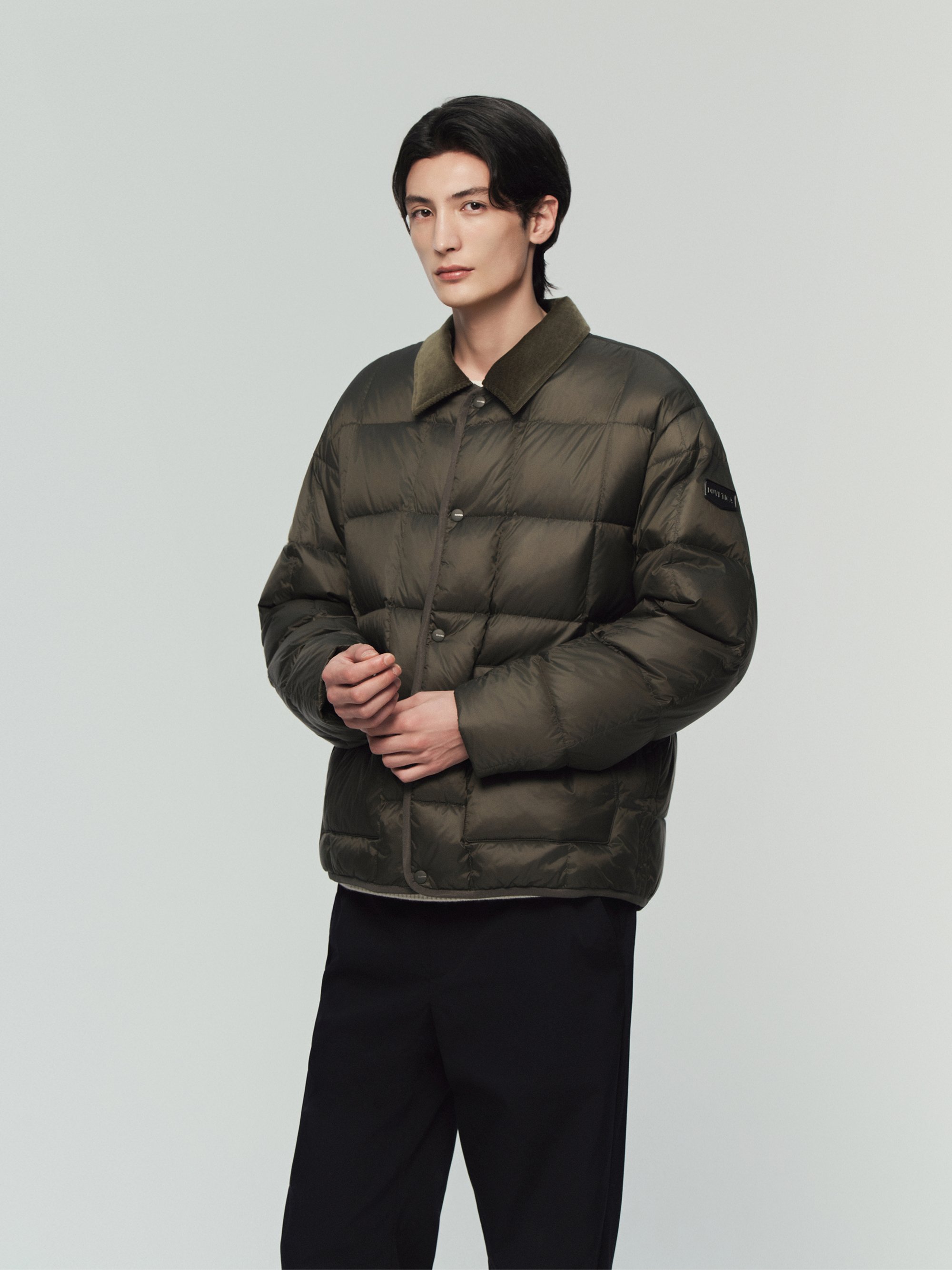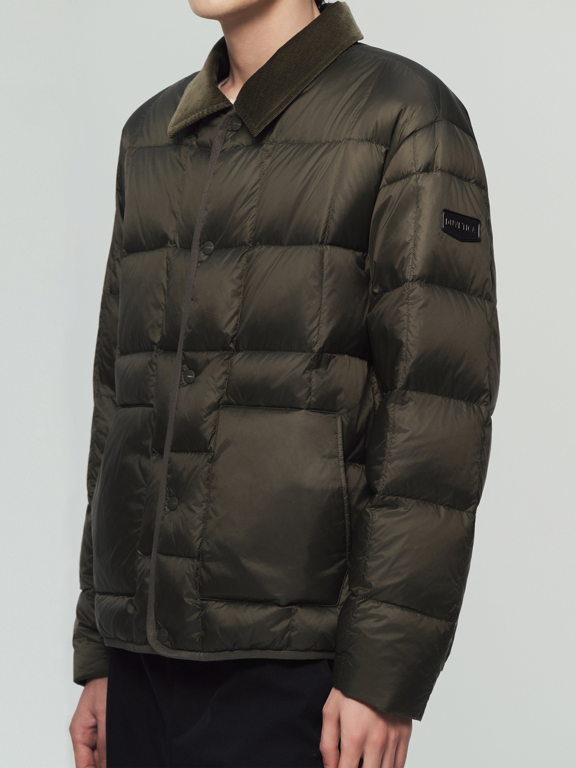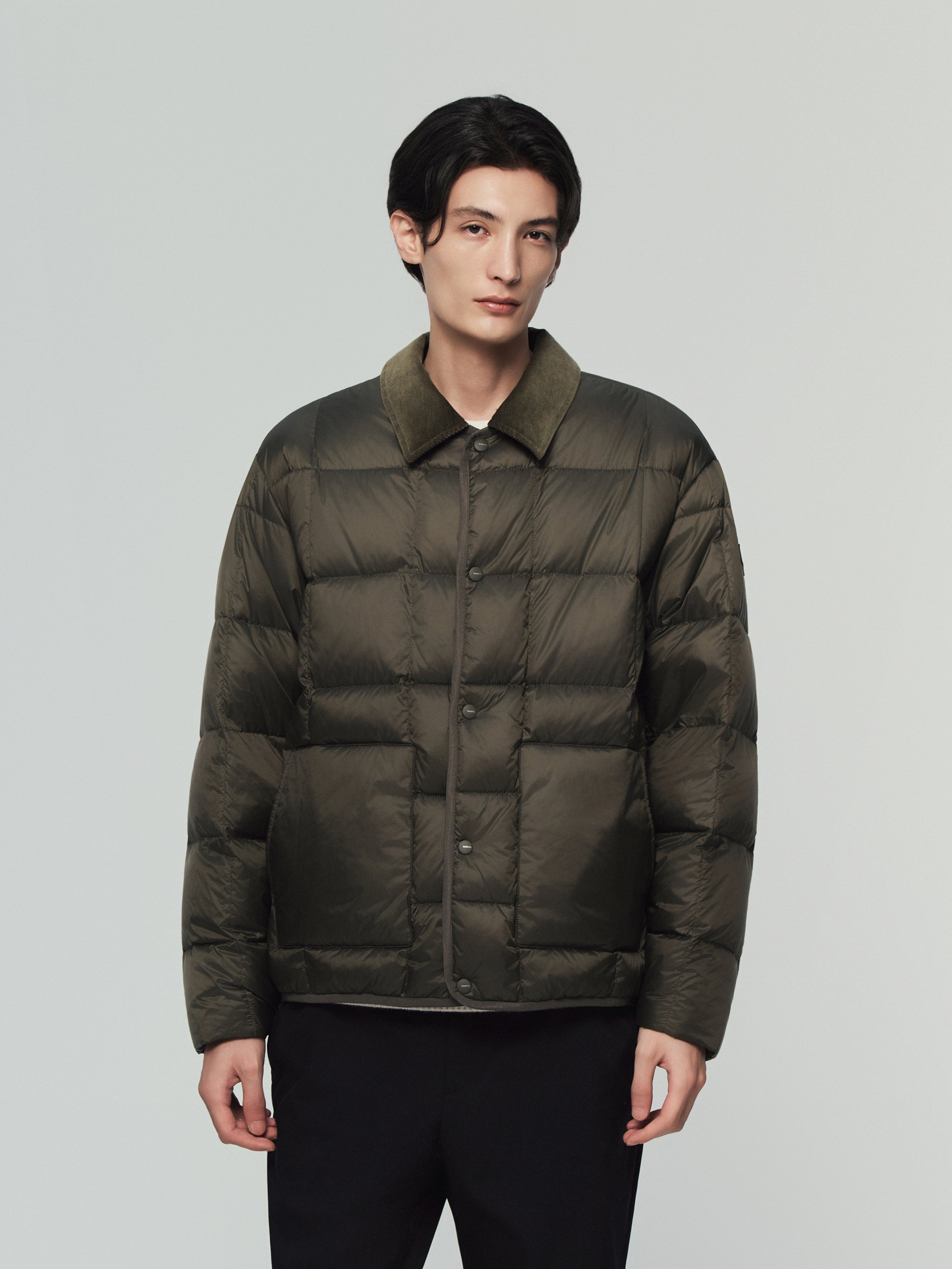 - 매트한 나일론 소재에 사각퀼팅을 적용한 워크자켓형 남성 경량 다운자켓