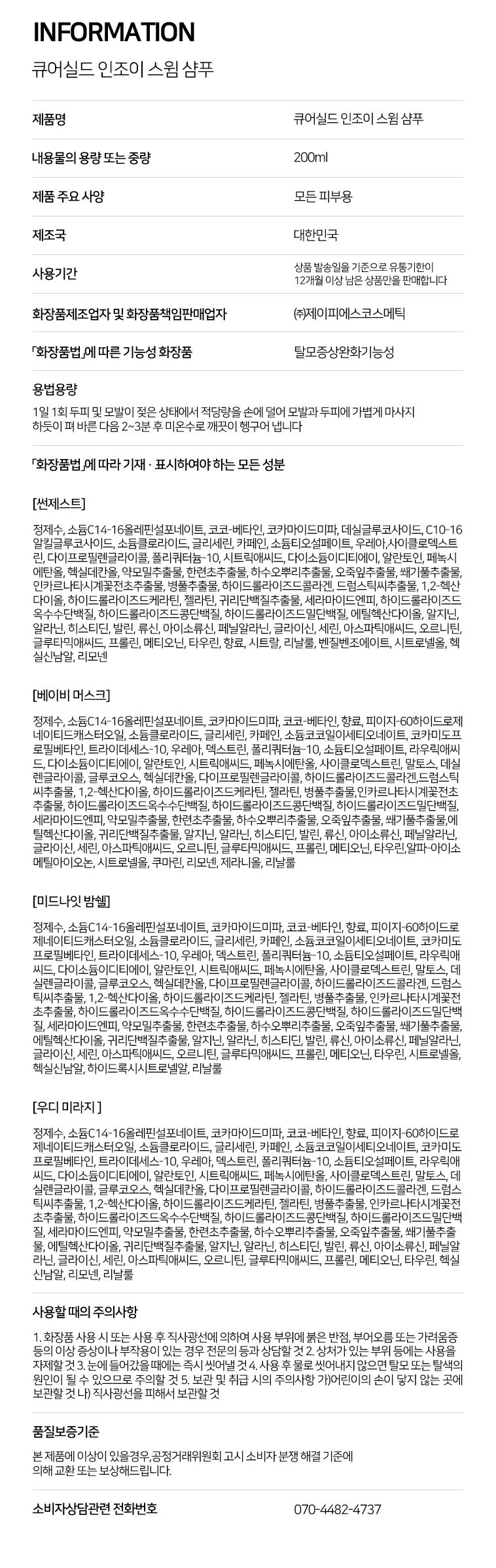| 화장품법에 따라 기재,표시하여야 하는 모든 성분 | 정제수, 소듐C14-16올레핀설포네이트, 코카마이드미파, 코코-베타인, 향료, 피이지-60하이드로 제네이티드캐스터오일, 소듐클로라이드, 글리세린, 카페인, 소듐코코일이세티오네이트, 코카미도 프로필베타인, 트라이데세스-10, 우레아, 덱스트린, 폴리쿼터늄-10, 소듐티오설페이트, 라우릭애 씨드, 다이소듐이디티에이, 알란토인, 시트릭애씨드, 페녹시에탄올, 사이클로덱스트린, 말토스, 데 실렌글라이콜, 글루코오스, 실데칸올, 다이프로필렌글라이콜, 하이드롤라이즈드콜라겐, 드럼스 틱씨추출물, 1,2-산다이올, 하이드롤라이즈드케라틴, 젤라틴, 병풀추출물, 인카르나타시계꽃전 초추출물, 하이드롤라이즈드옥수수단백질, 하이드롤라이즈드콩단백질, 하이드롤라이즈드밀단백 질, 세라마이드엔피, 약모밀추출물, 한련초추출물, 하수오뿌리추출물, 오죽잎추출물, 쐐기풀추출물, 에틸헥산다이올, 귀리단백질추출물, 알지닌, 알라닌, 히스티딘, 발린, 류신, 아이소류신, 페닐알라닌, 글라이신, 세린, 아스파틱애씨드, 오르니틴, |