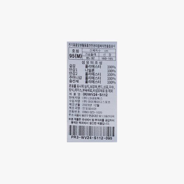 | 소재 | 겉감: 폴리에스터 100%, 안감: 폴리에스터 100%, 주머니감: 폴리에스터 100%, 충전재: 폴리에스터 100% |