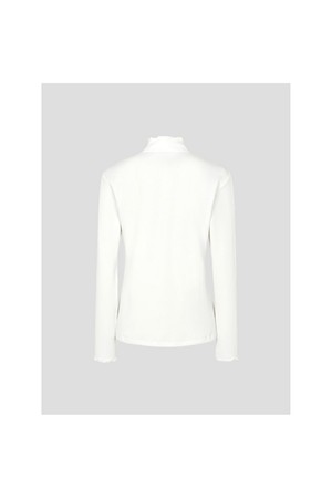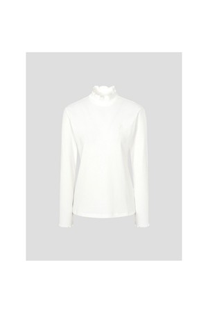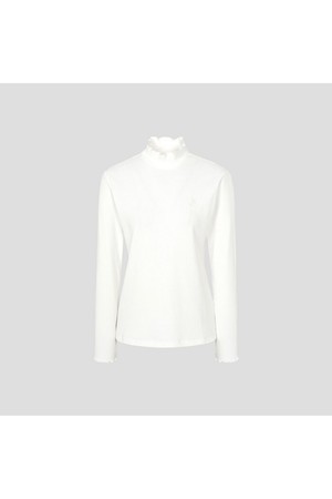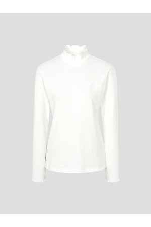 골지 조직 소재의 하이넥 티셔츠입니다. 외관을 스웨터처럼 보이게 하는 은은한 기모가 포인트입니다. 넥라인과 소매, 밑단의 잔잔한 주름은 여성스러운 분위기를 완성합니다. 기본 디자인으로 스웨터나 아우터와 코디하기 좋은 필수 아이템입니다.