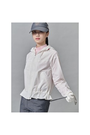 실용적인 후드가 달린 경량 바람막이 점퍼입니다. 신축성이 있는 가벼운 폴리에스터 소재에 절개선과 주름을 잡은 턱 디테일이 포인트가 되는 제품입니다. 후드부터 앞여밈까지 밴드를 적용하여 스포티하면서, 밑단의 고무 스트링으로 여성스러운 느낌을 더했습니다. 촘촘한 구멍이 뚫린 메시 안감이 청량감을 더해 산뜻하고 매력적인 무드로 코디하기 좋습니다.