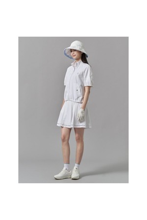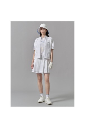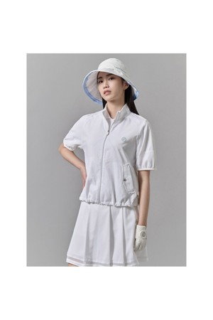 청량하고 가벼운 에어서커 소재의 점퍼입니다. 일본 수입 서커 조직의 폴리에스터 소재로 시원한 착용감을 선사합니다. 넥라인에 단을 더한 밴드넥과 반소매 기장으로 볼륨을 주었으며, 밑단의 고무 스트링으로 실루엣 조절이 가능합니다. 소매끝은 신축성이 있는 밴드를 적용해 활동하기 더욱 편안합니다. 스커트와도 팬츠와도 코디하기 용이한 아이템입니다.