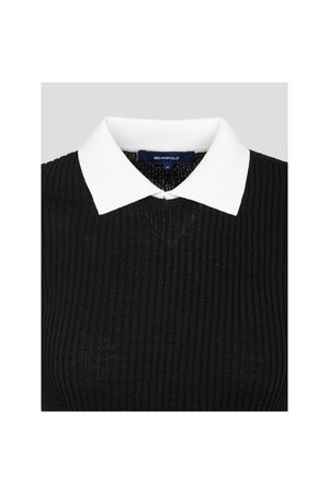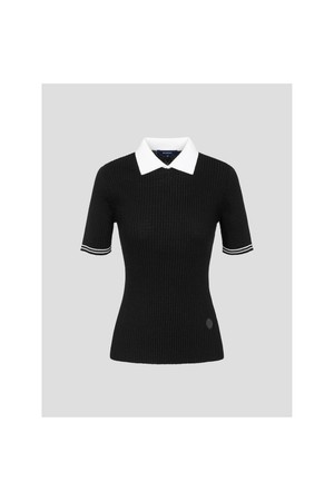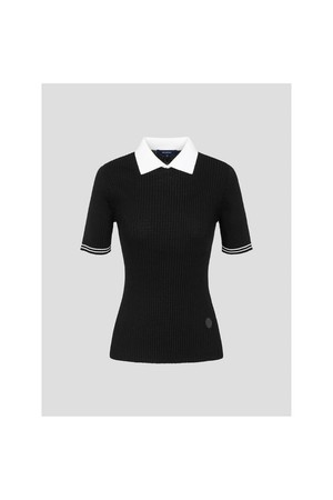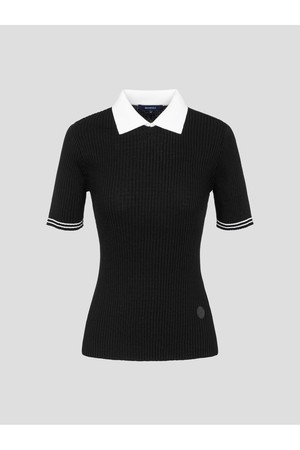 신축성이 좋은 골지 조직의 반소매 니트입니다. 탄력 있는 폴리에스터 혼방 원사를 사용해 활동성이 좋고 가볍습니다. 배색 칼라와 소매 티핑이 포인트가 되는 아이템으로, 몸을 여유 있고 편안하게 감싸줘 움직임이 편합니다.