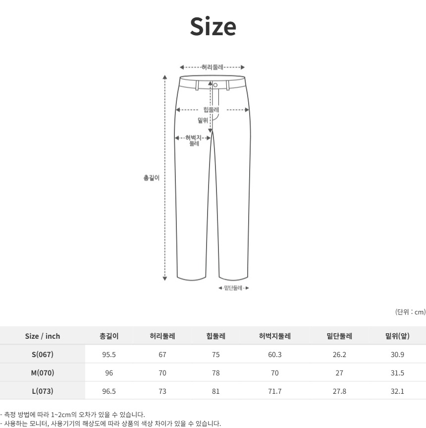 치수 | S(067) 총기장95.5 허리둘레67 힙둘레75 허벅지둘레60.3 밑단둘레26.2 밑위(앞)30.9 M(070) 총기장96 허리둘레70 힙둘레78 허벅지둘레70 밑단둘레27 밑위(앞)31.5 L(073) 총기장96.5 허리둘레73 힙둘레81 허벅지둘레71.7 밑단둘레27.8 밑위(앞)32.1 |