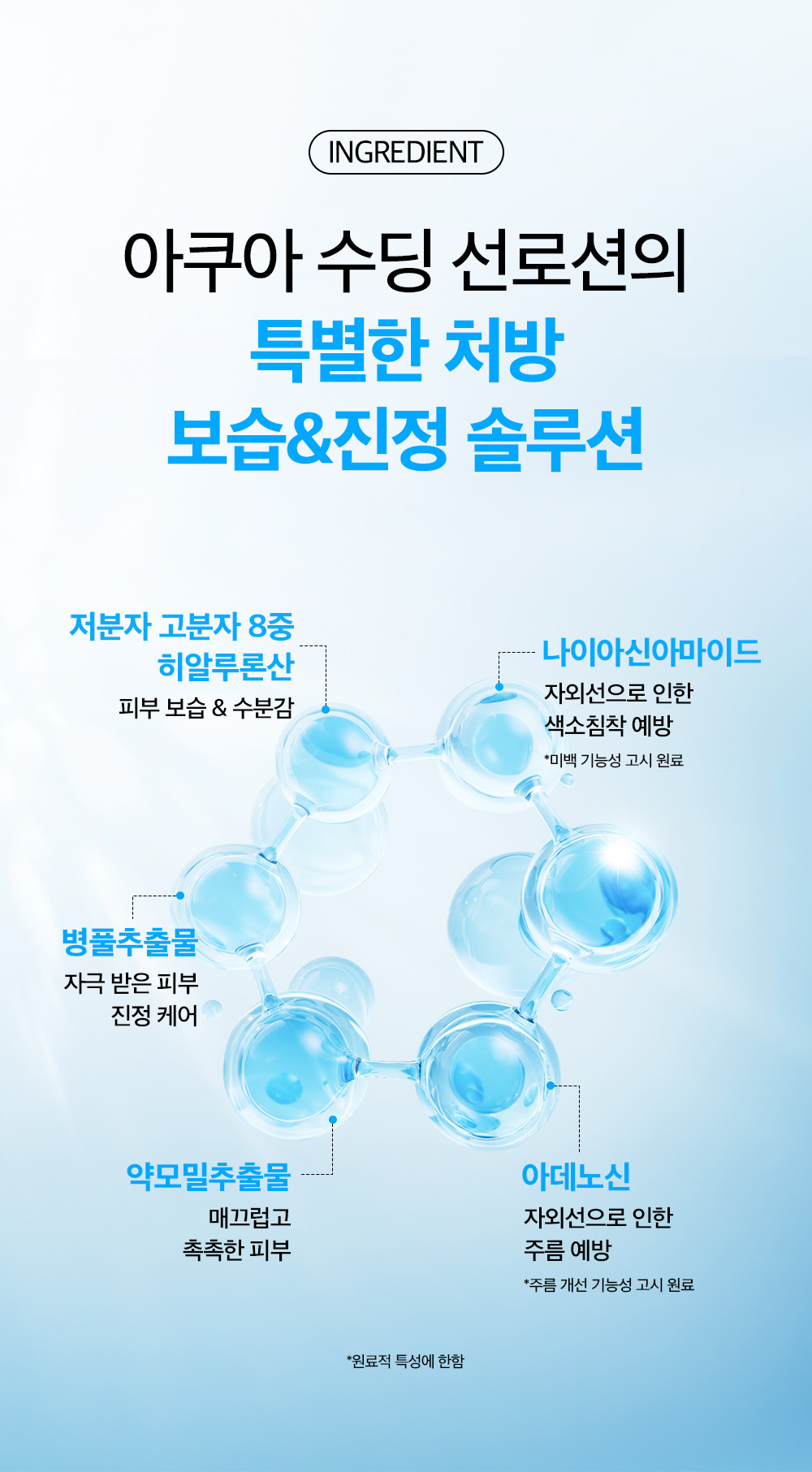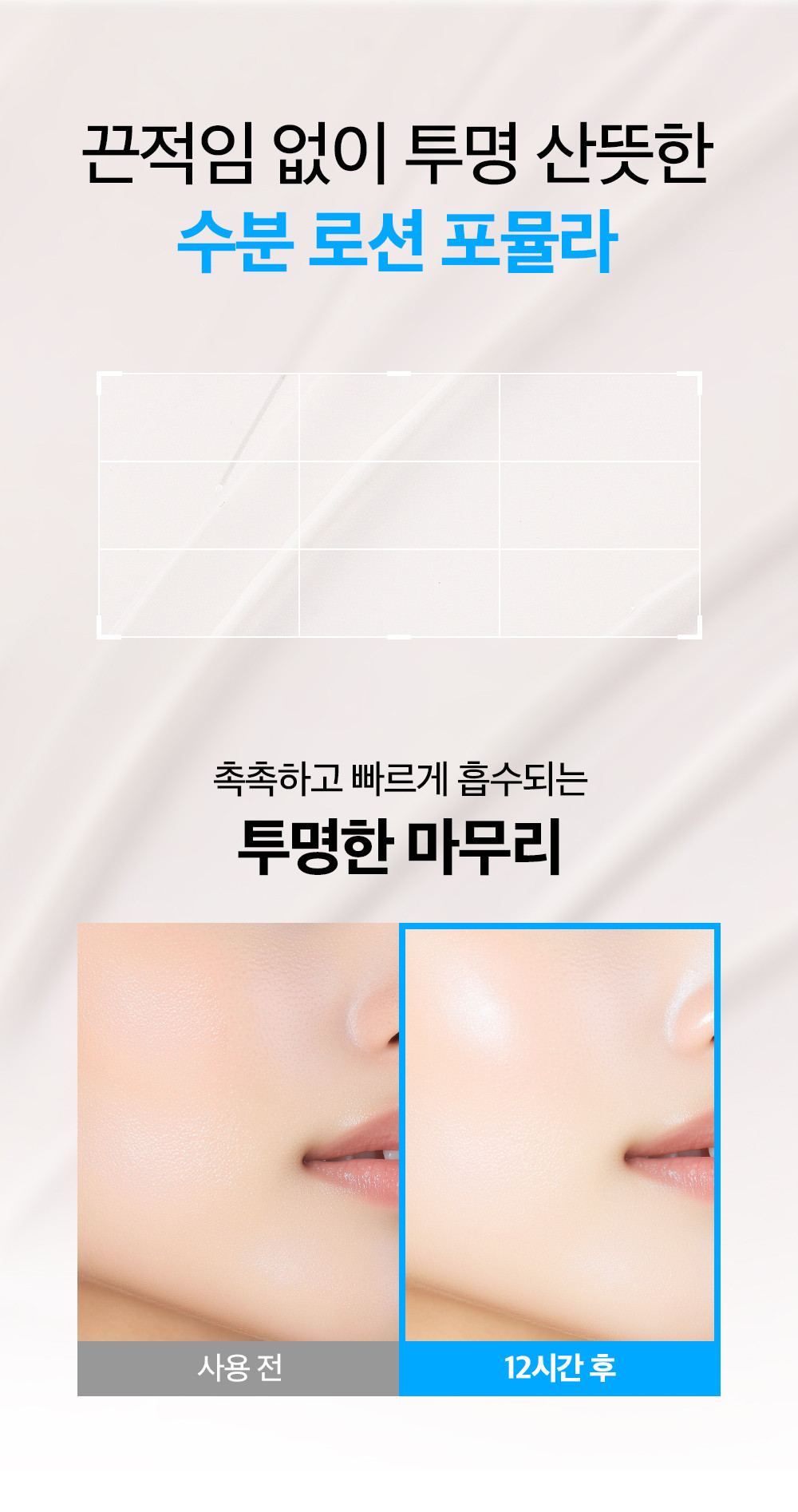 | 화장품법에 따라 기재,표시하여야 하는 모든 성분 | 정제수, 다이부틸아디페이트, 변성알코올, 디에칠아미노하이드록시벤조일헥실벤조에이트, 프로판다이올, 에칠헥실트리아존, 트라이데케인, 비스-에칠헥실옥시페놀메톡시페닐트리아진, 나이아신아마이드, 1,2-헥산다이올, 아크릴레이트/C10-30알킬아크릴레이트크로스폴리머, 트로메타민, 폴리메틸실세스퀴옥세인, 암모늄아크릴로일다이메틸타우레이트/브이피코폴리머, 리모넨, 에틸헥실글리세린, 아데노신, 리날룰, 사카라이드아이소머레이트, 오렌지껍질오일, 부틸렌글라이콜, 녹나무껍질오일, 토코페롤, 흰목이버섯추출물, 잔탄검, 소듐시트레이트, 시트릭애씨드, 카프릴릴글라이콜, 쌀추출물, 연꽃꽃추출물, 개똥쑥추출물, 효모발효물, 병풀추출물, 약모밀추출물, 멕시칸치아씨추출물, 글루코오스, 소듐하이알루로네이트, 아이리쉬모스추출물, 하이드록시프로필트라이모늄하이알루로네이트, 하이드롤라이즈드하이알루로닉애씨드, 소듐아세틸레이티드하이알루로네이트, 하이알루로닉애씨드, 소듐하이알루로네이트크로스폴리머, 하이드롤라이즈드소듐하이알루로네이트, |