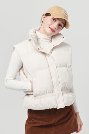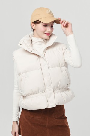 스텐드 카라 허리 밴딩 아이보리 패딩 베스트