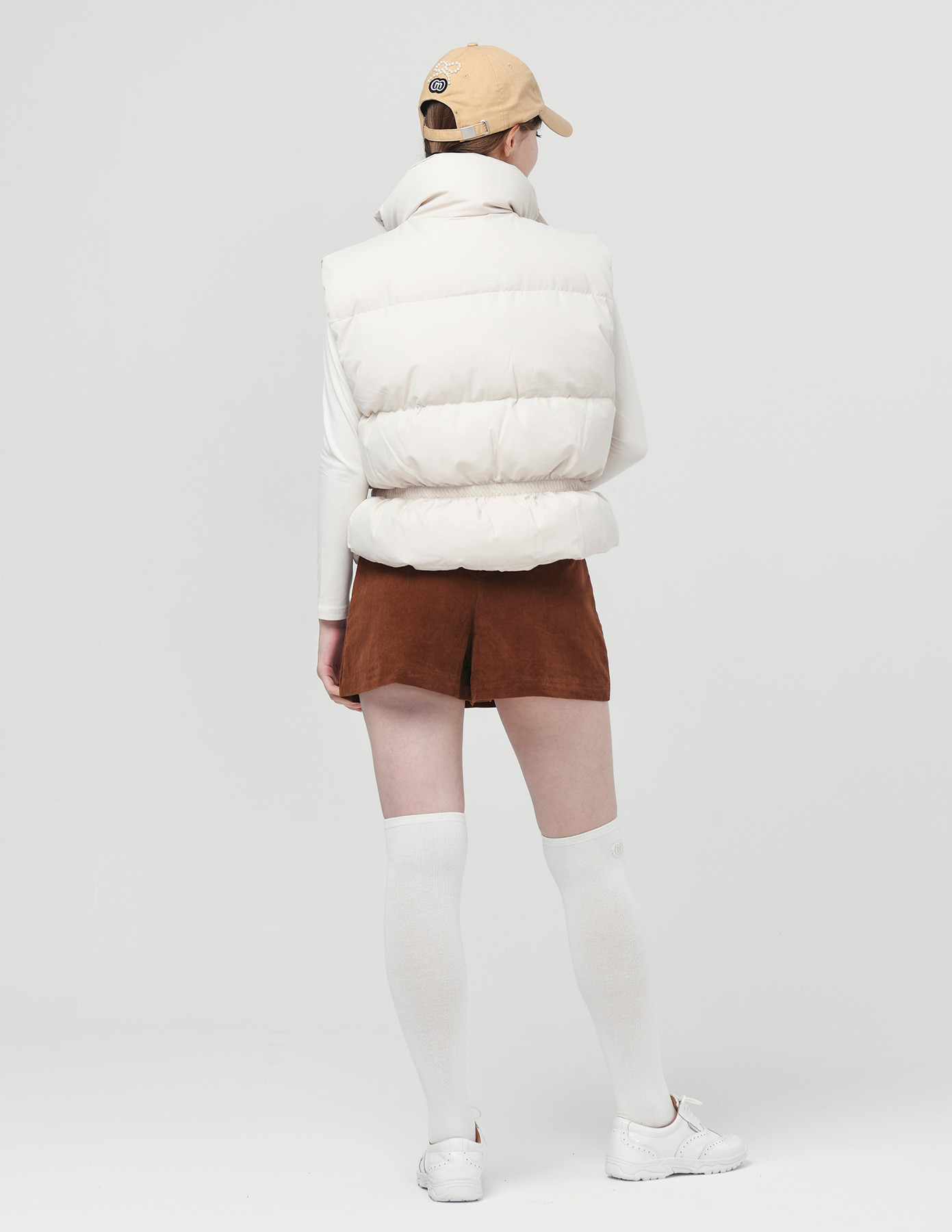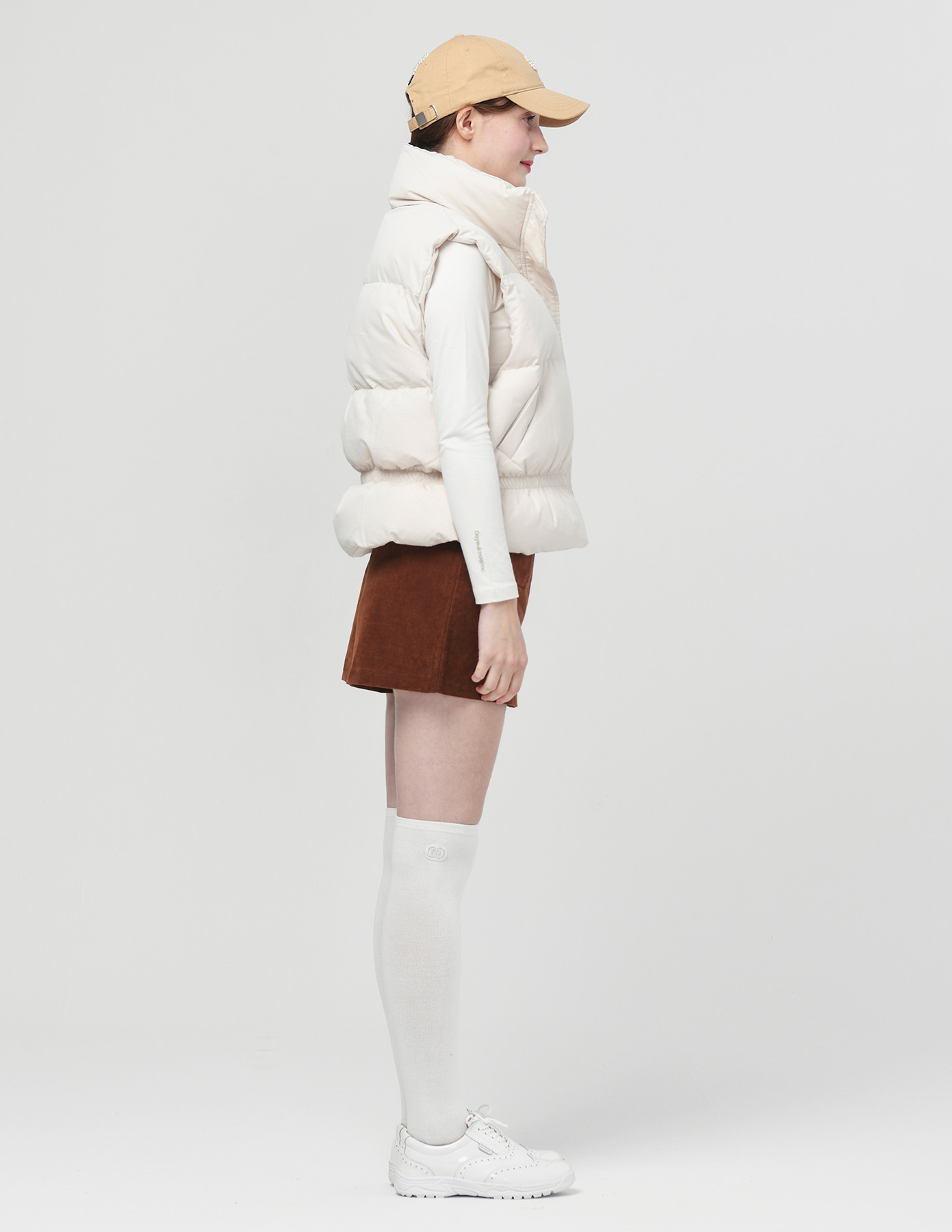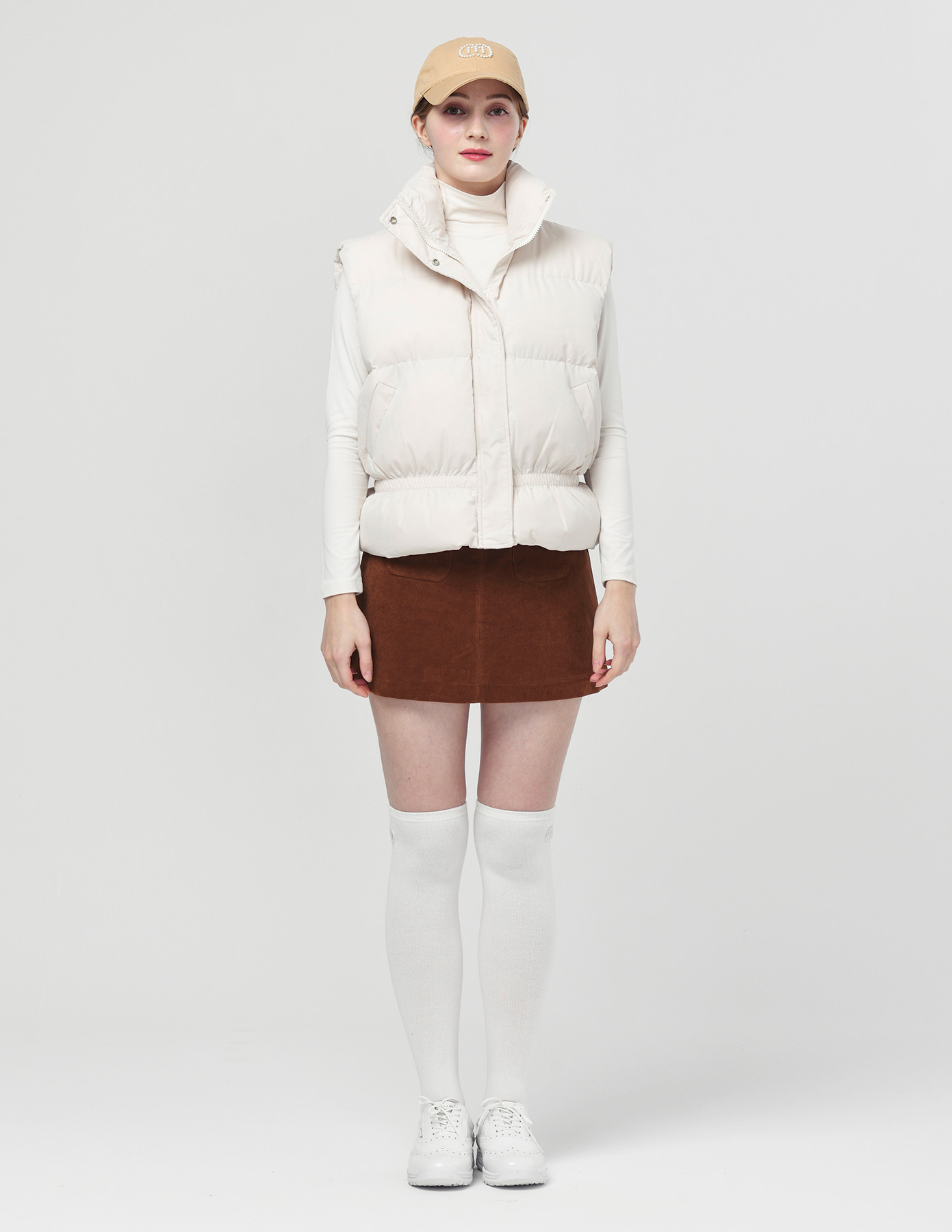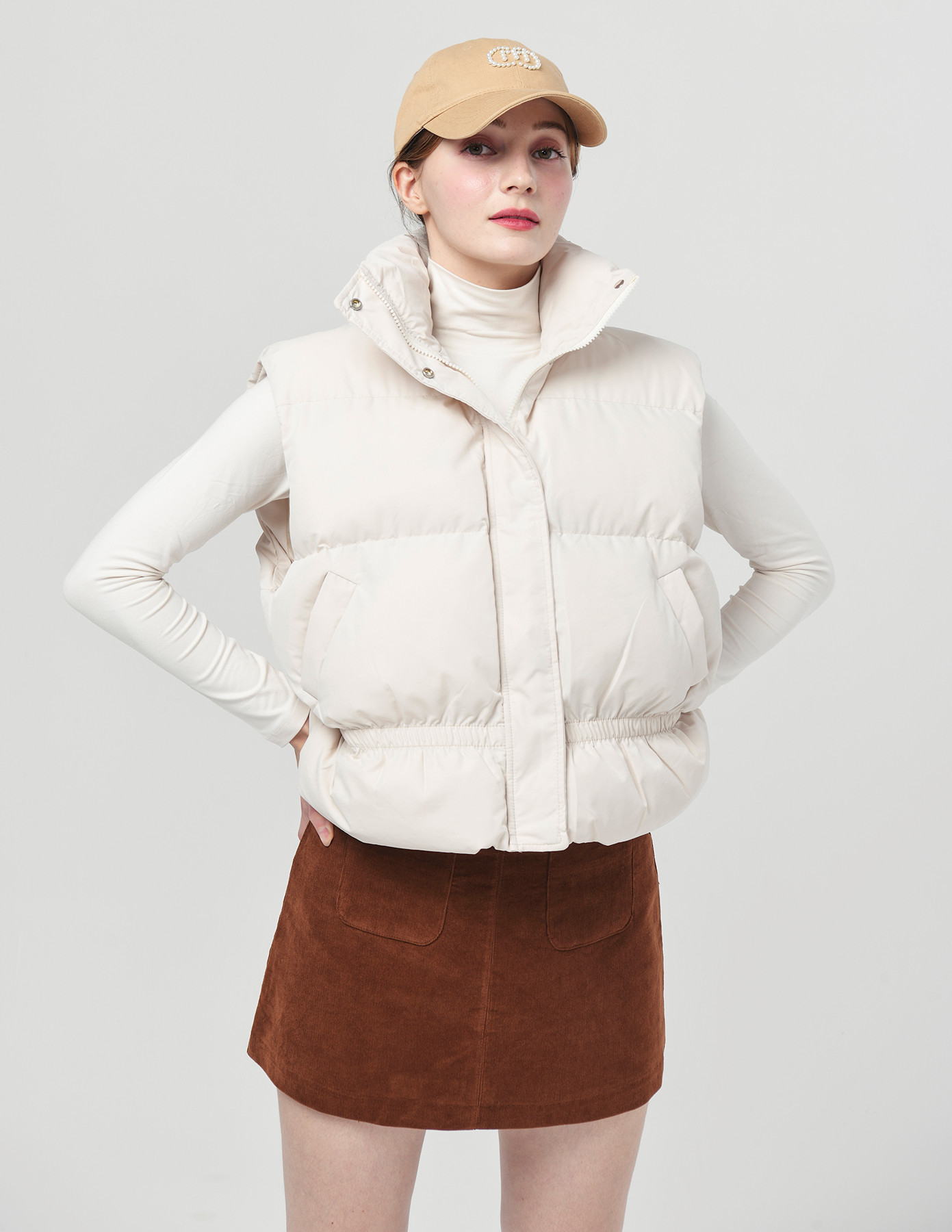 25FW 스텐드 카라 허리 밴딩 아이보리 패딩 베스트
