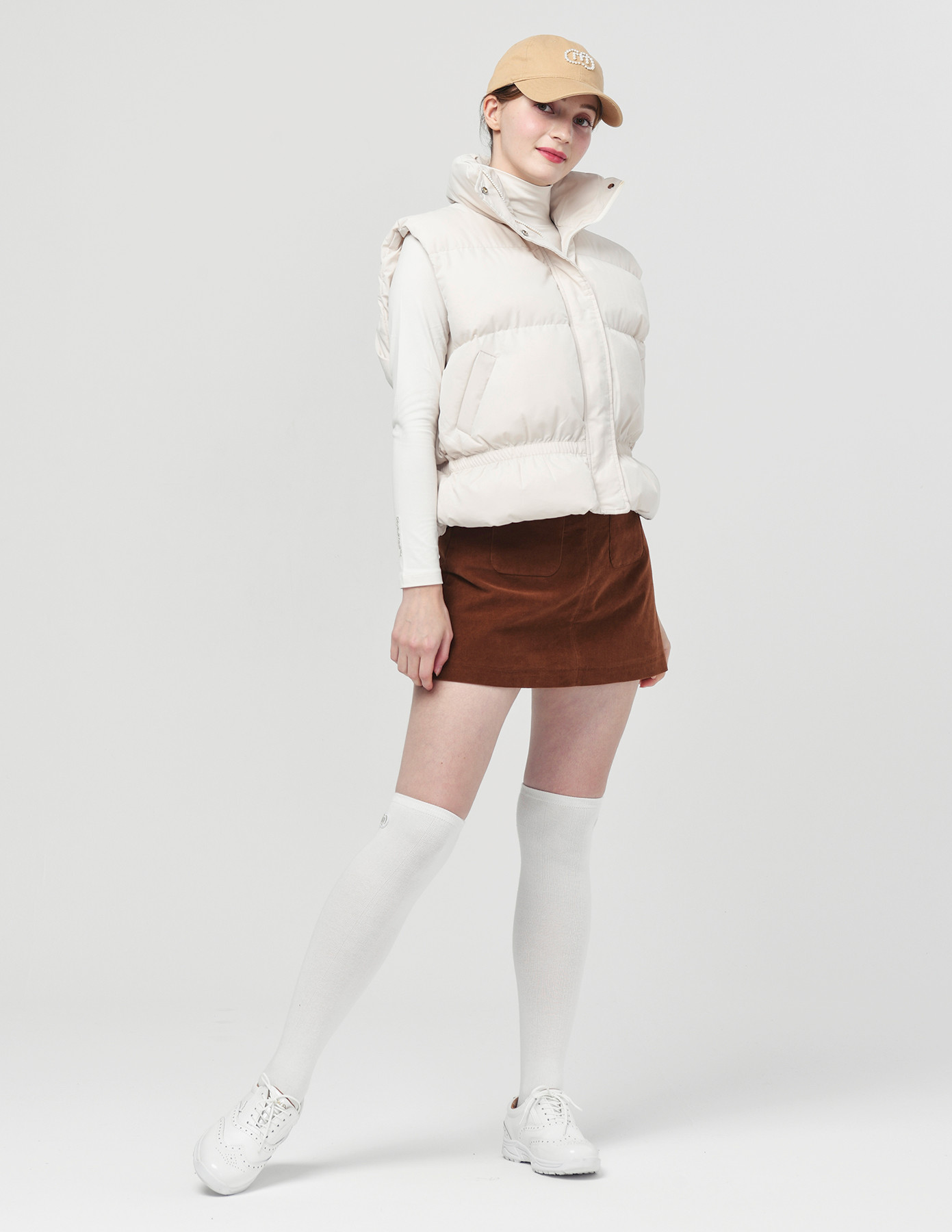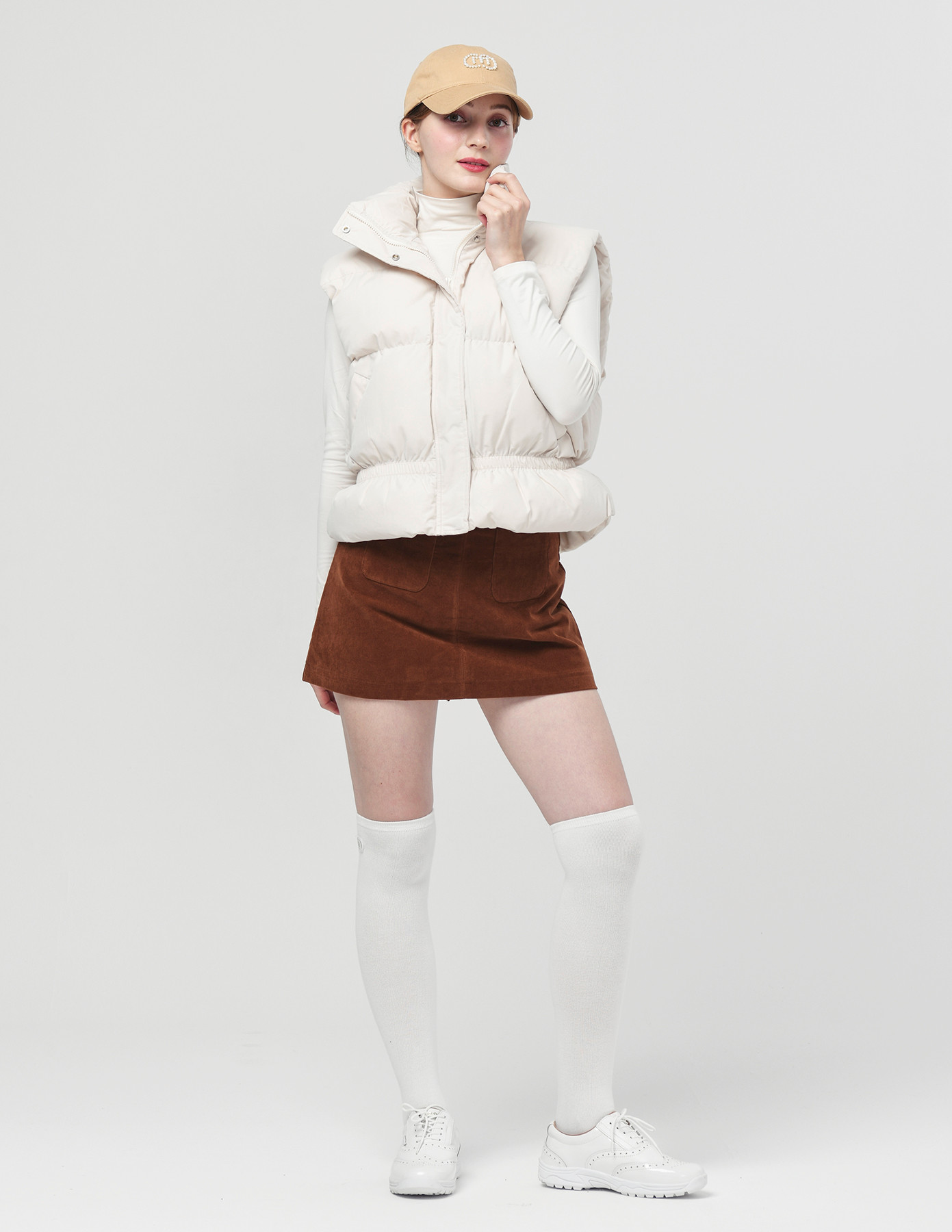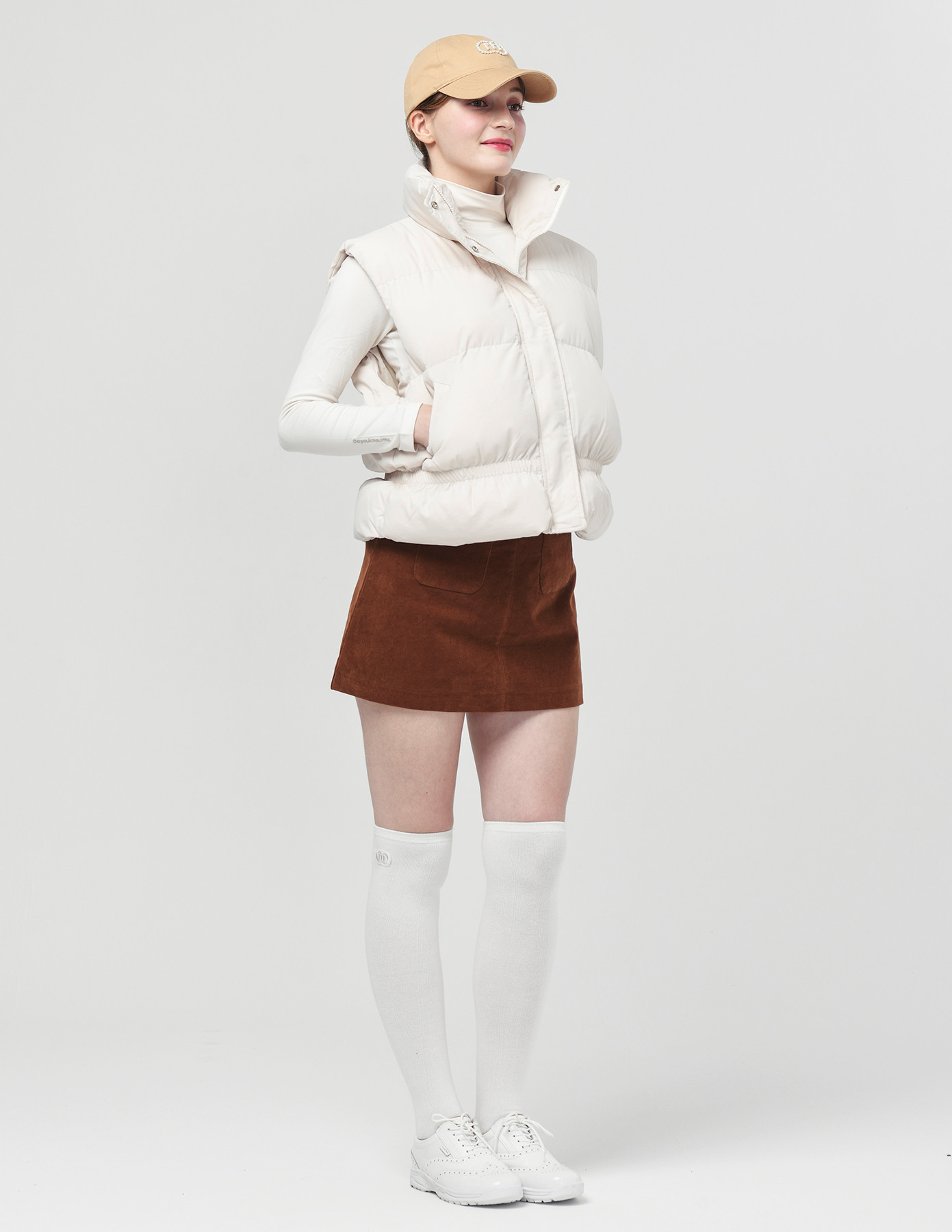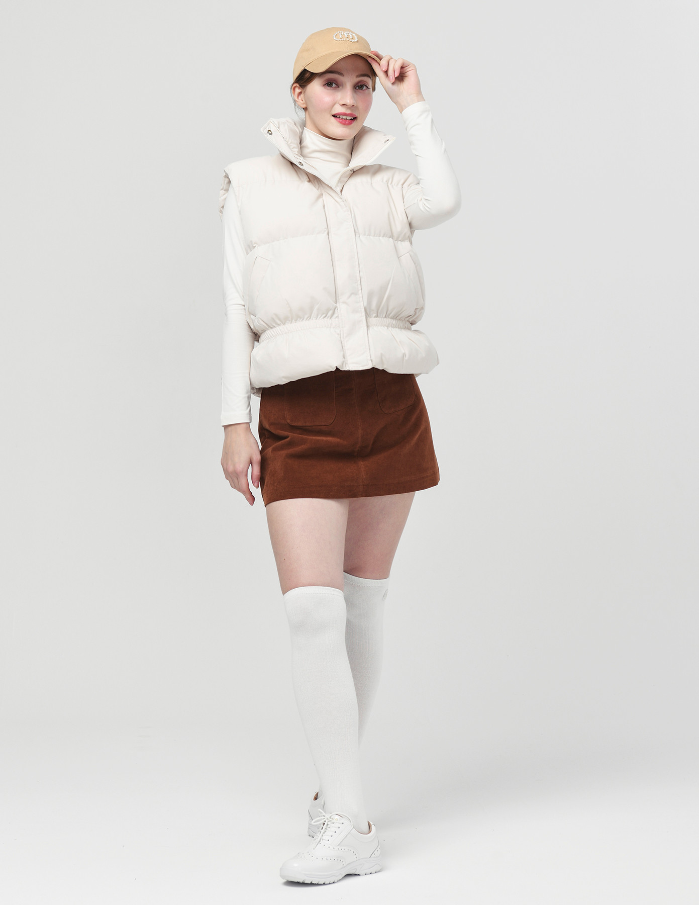 25FW 스텐드 카라 허리 밴딩 아이보리 패딩 베스트