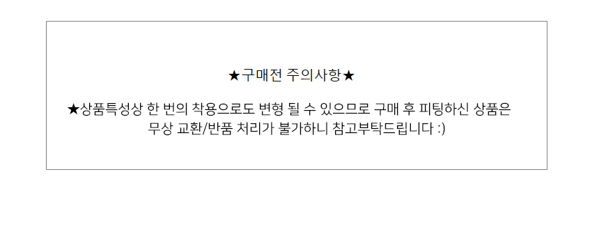 ★상품특성상 한번의 착용으로도 변형될수 있으므로 구매후 피팅하신 상품은 교환/반품처리가 불가하니 참고부탁드립니다