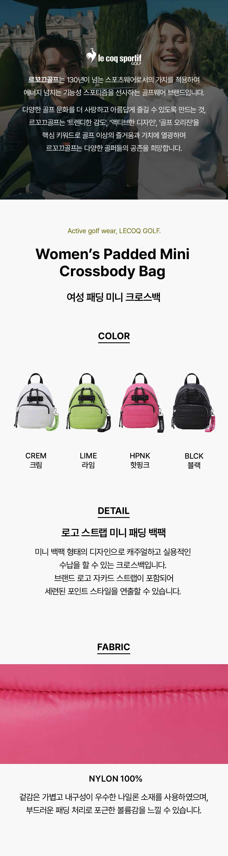 | 색상 | BLCK,CREM,HPNK,LIME (입고 시기에 따라 정보가 상이할 수 있어, 수령하신 상품의 라벨을 참고하시기 바랍니다.) |