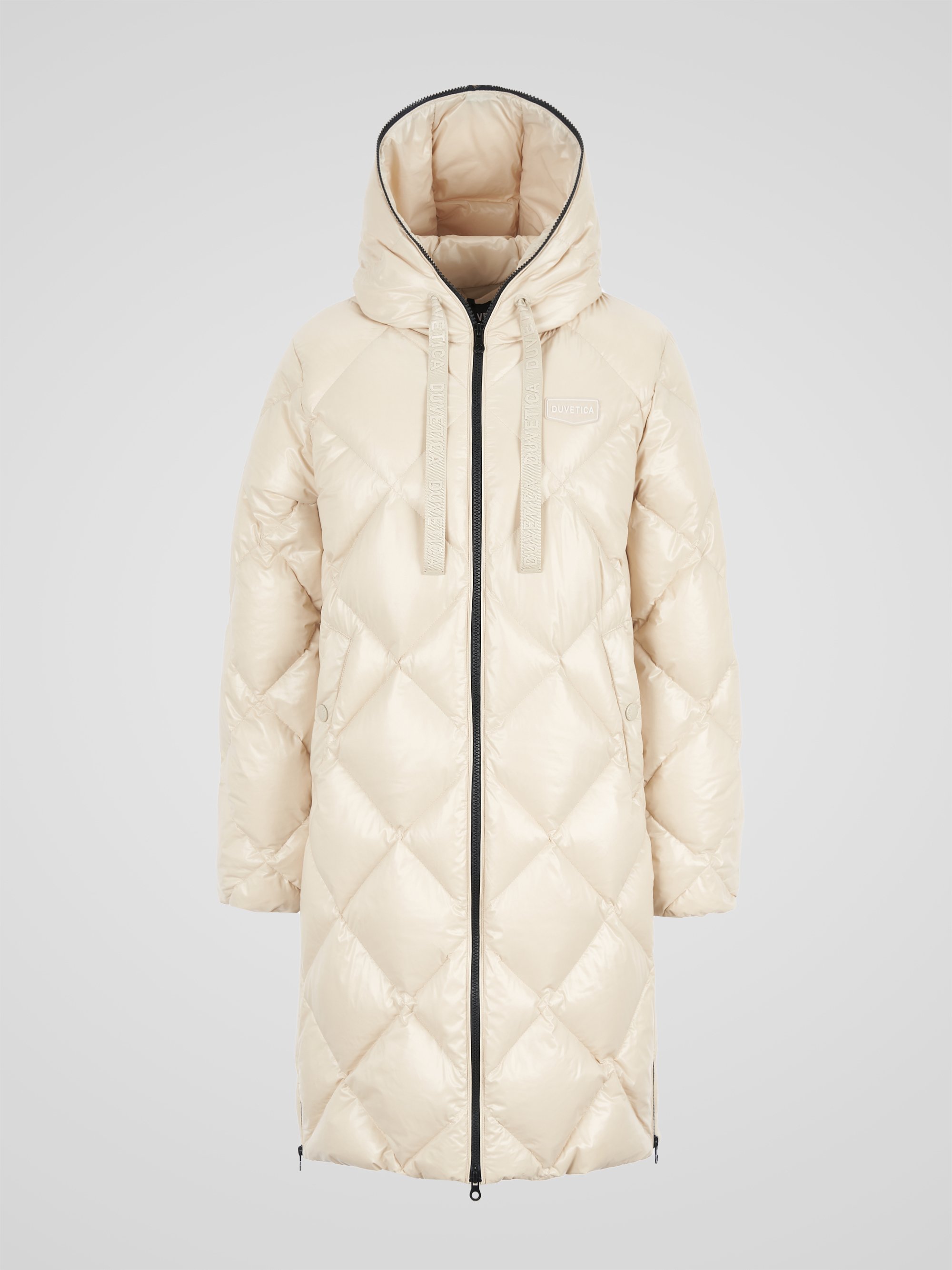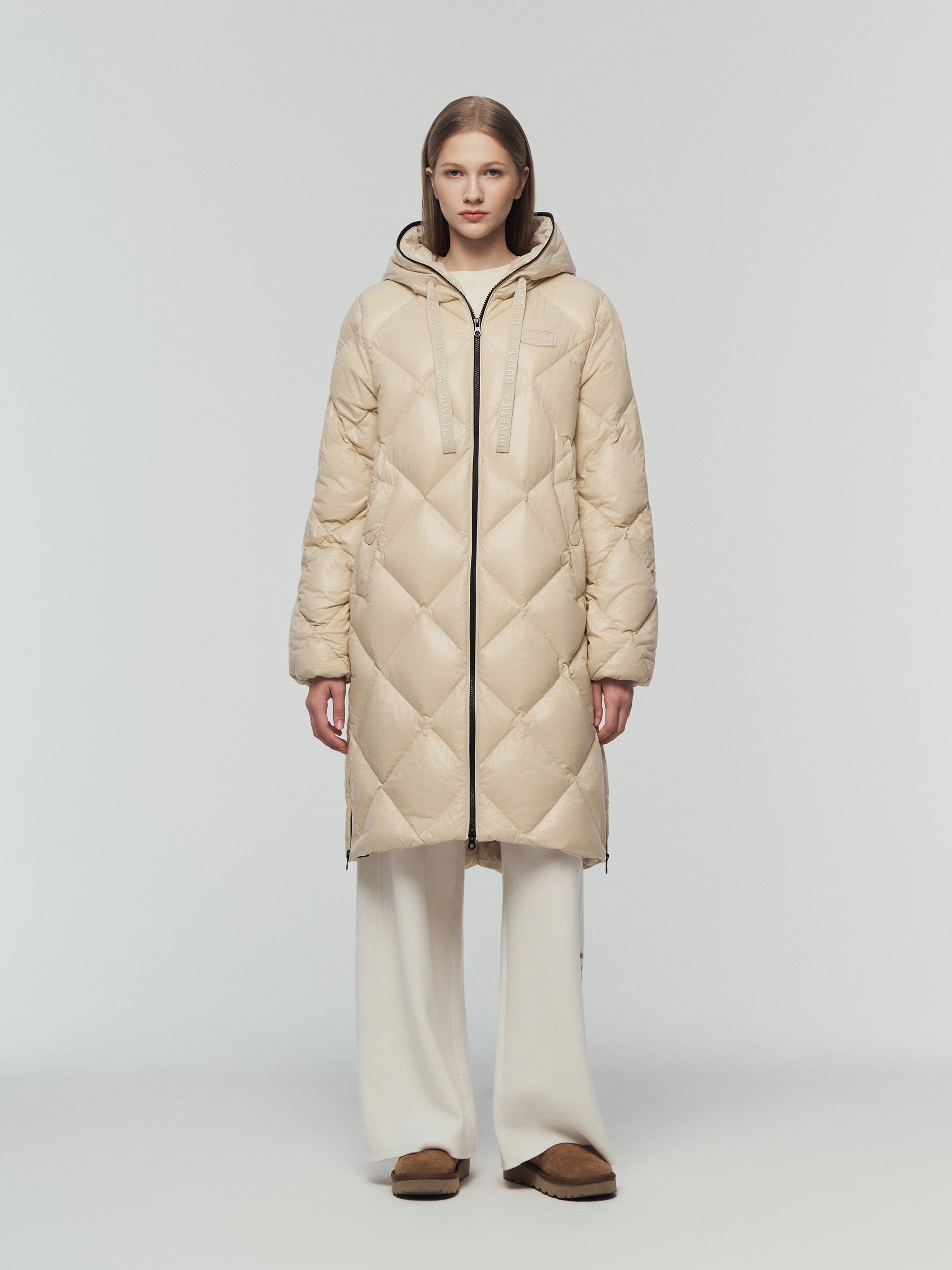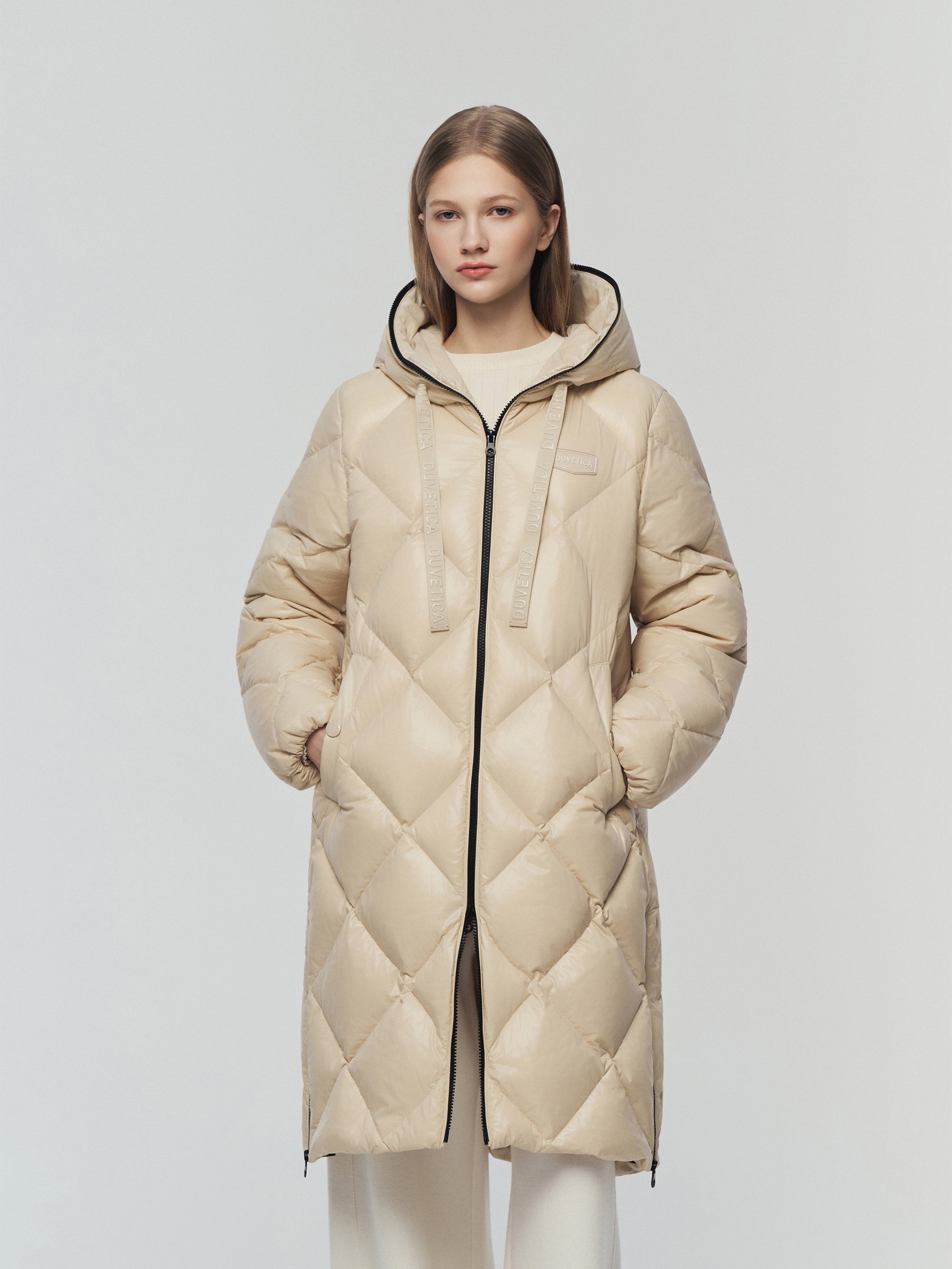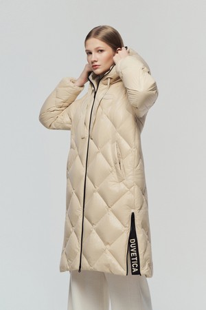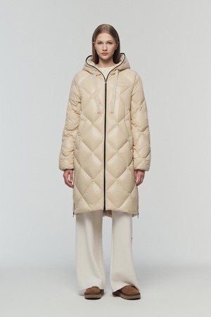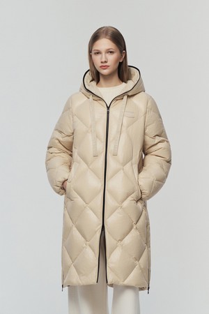 - 시그니처 리치한 유광 다이아 퀼팅이 돋보이는 롱기장 다운 자켓임
