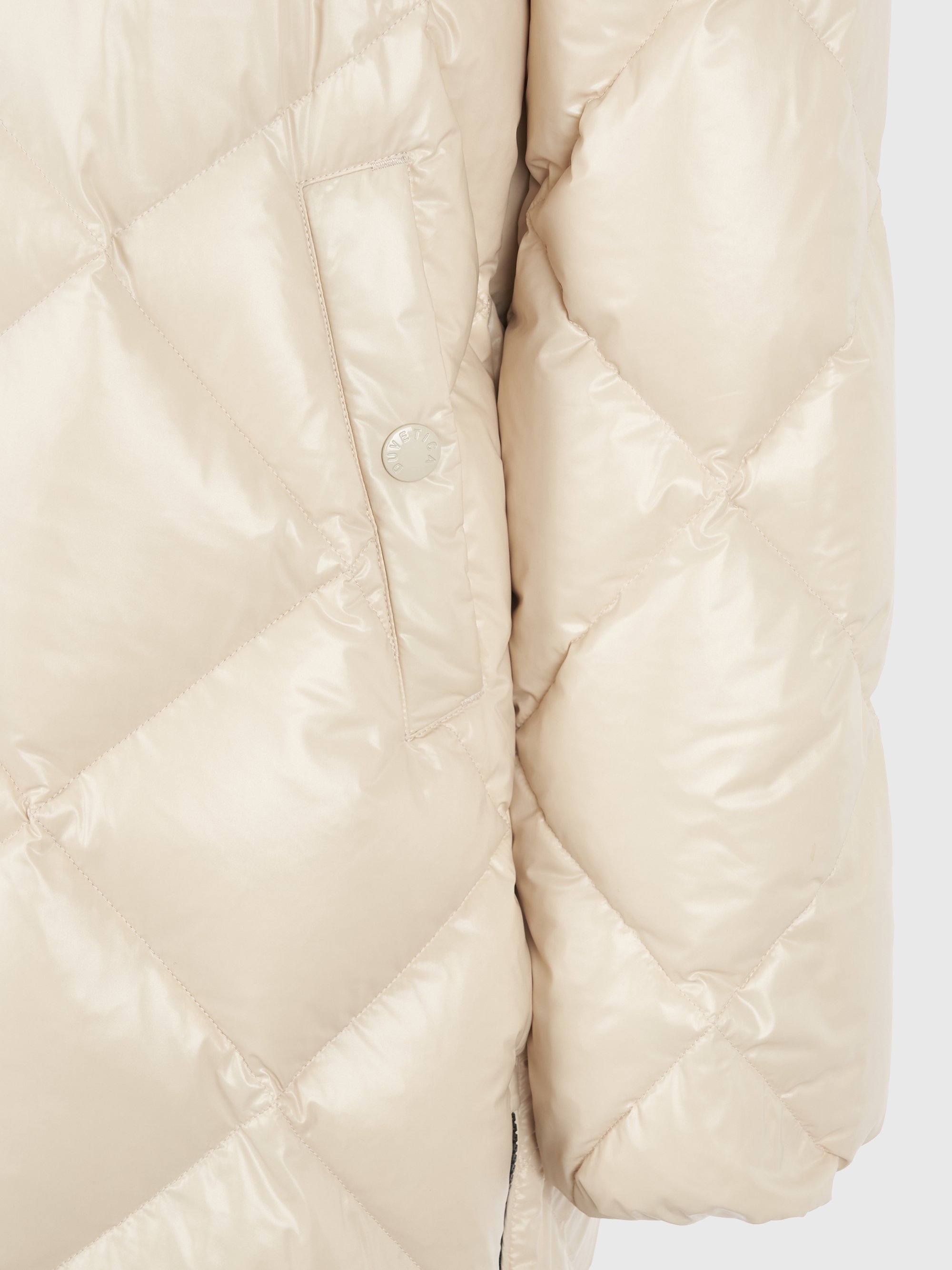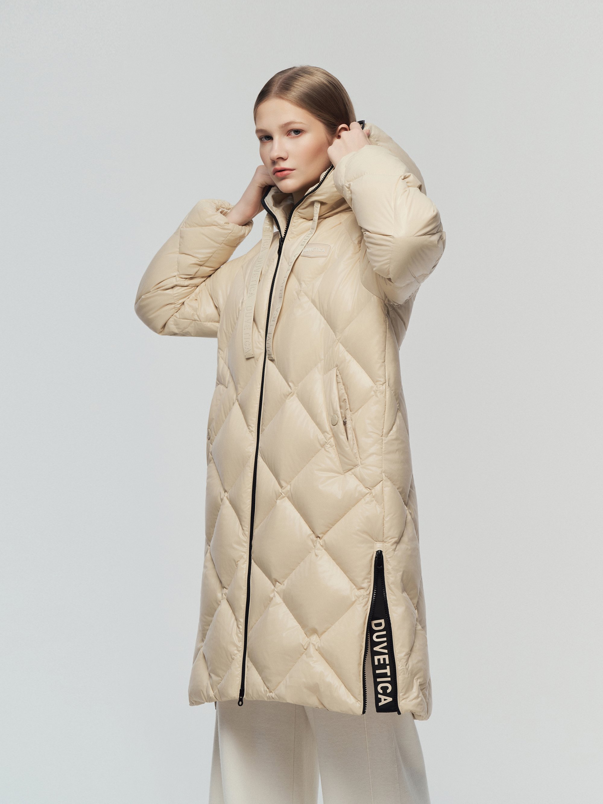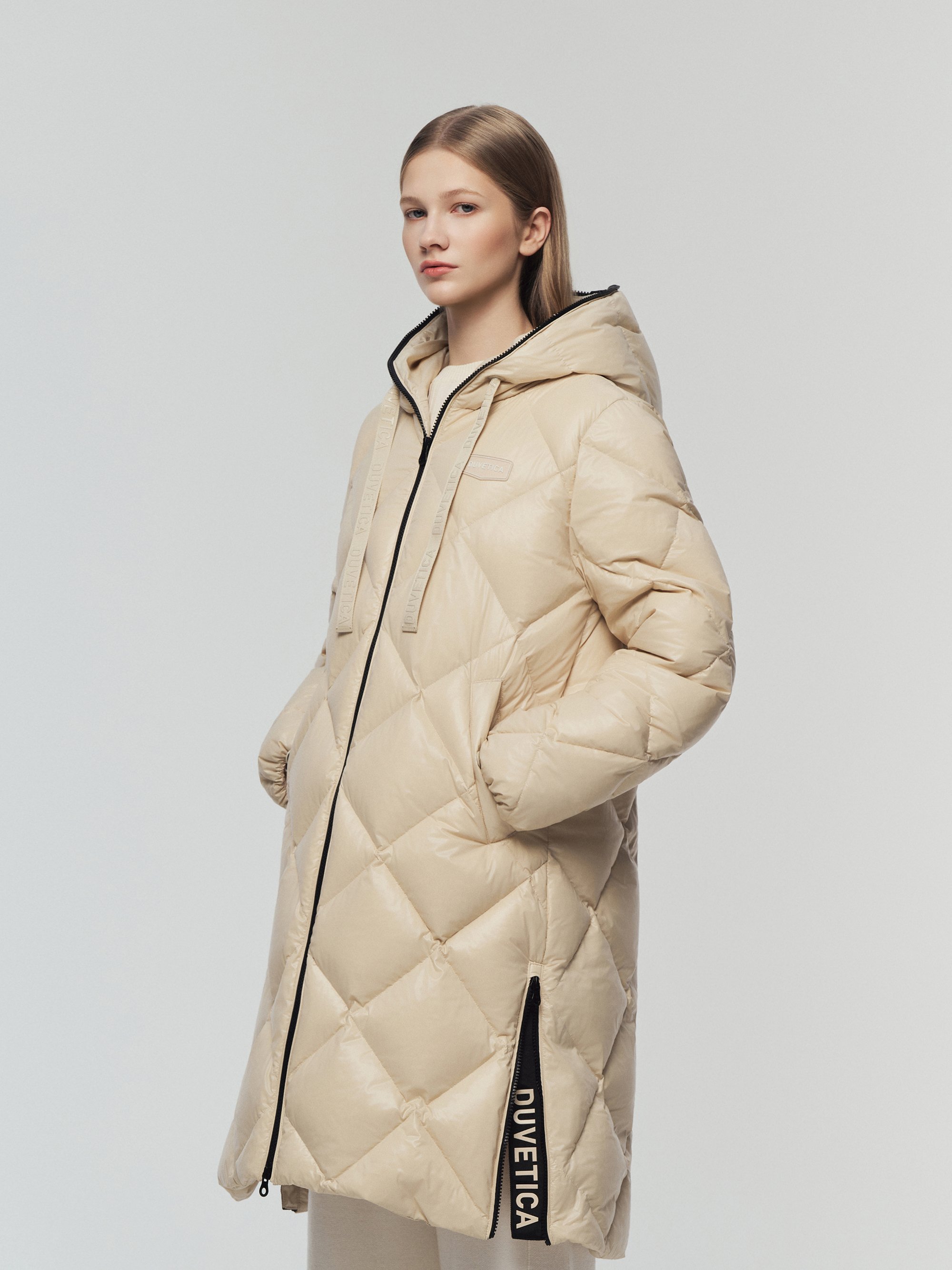 - 시그니처 리치한 유광 다이아 퀼팅이 돋보이는 롱기장 다운 자켓임