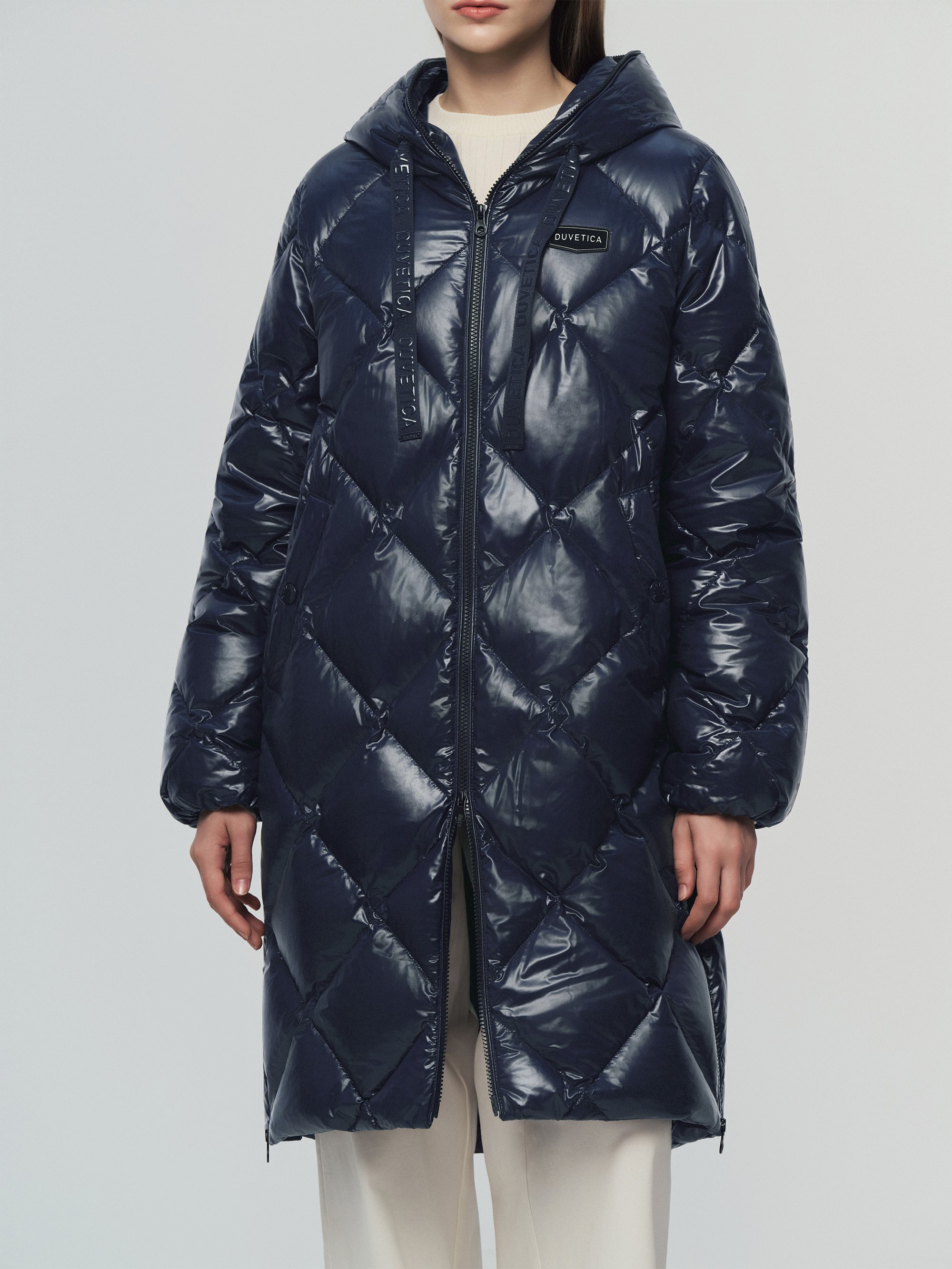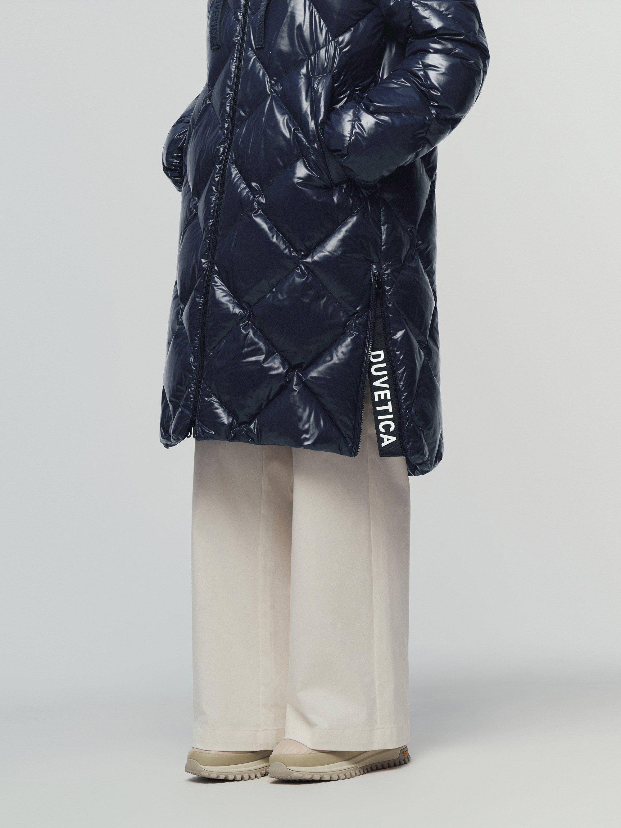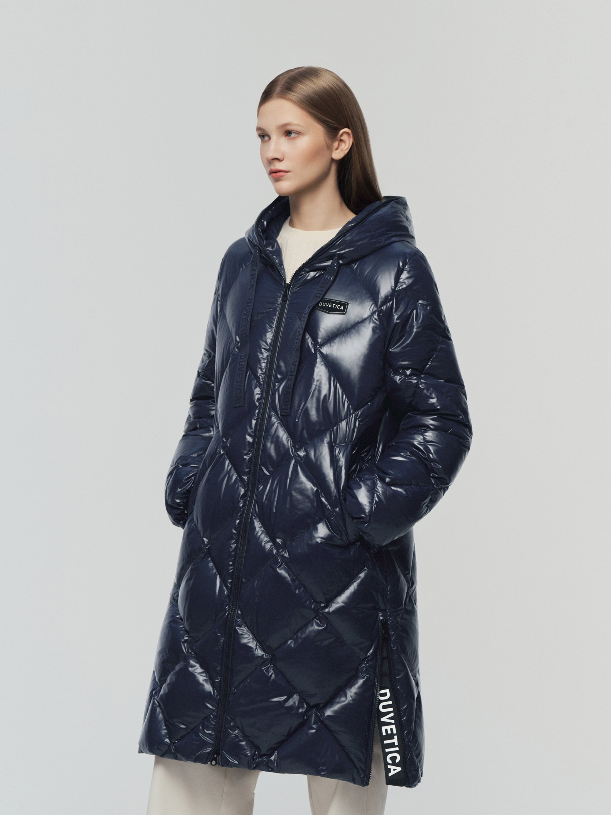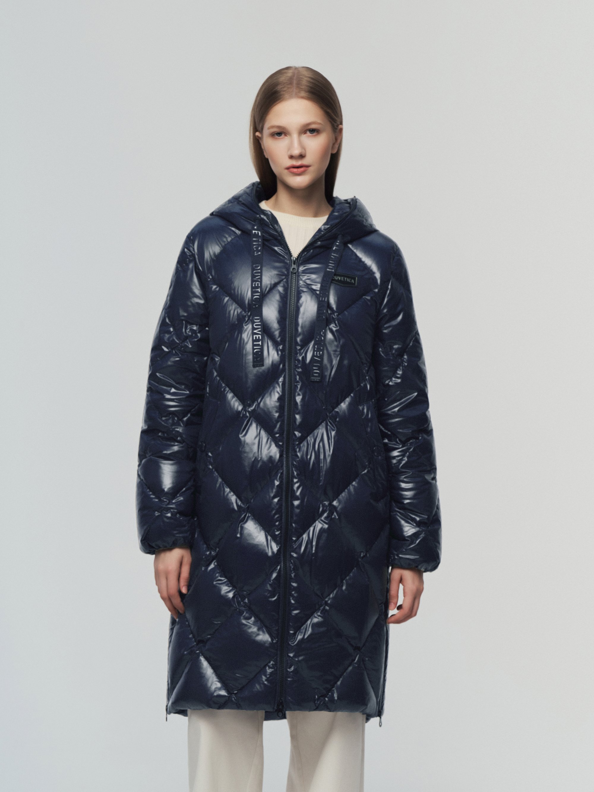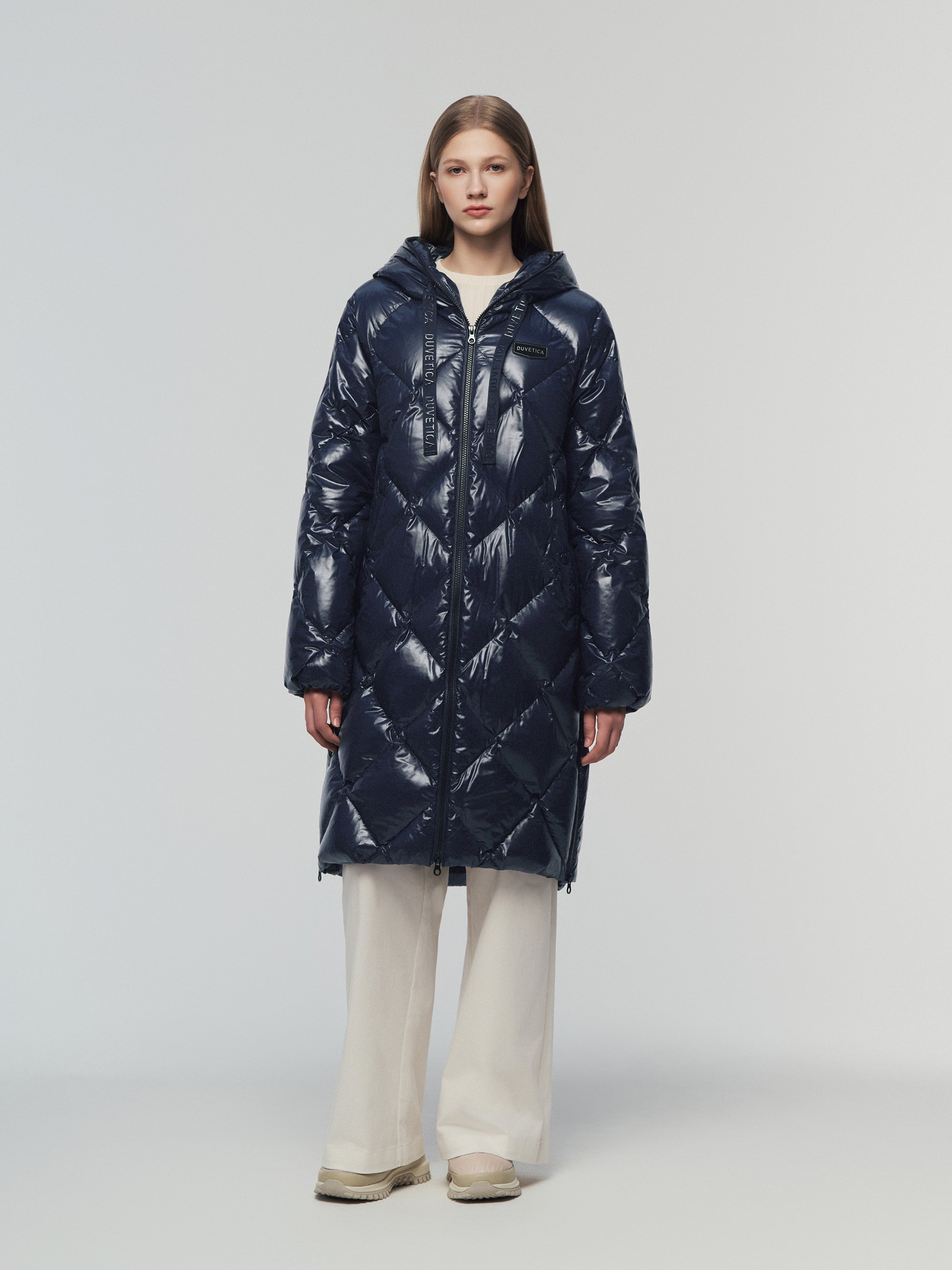 - 시그니처 리치한 유광 다이아 퀼팅이 돋보이는 롱기장 다운 자켓임