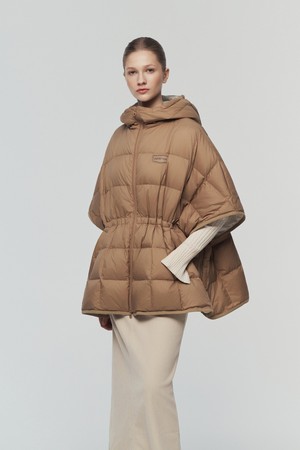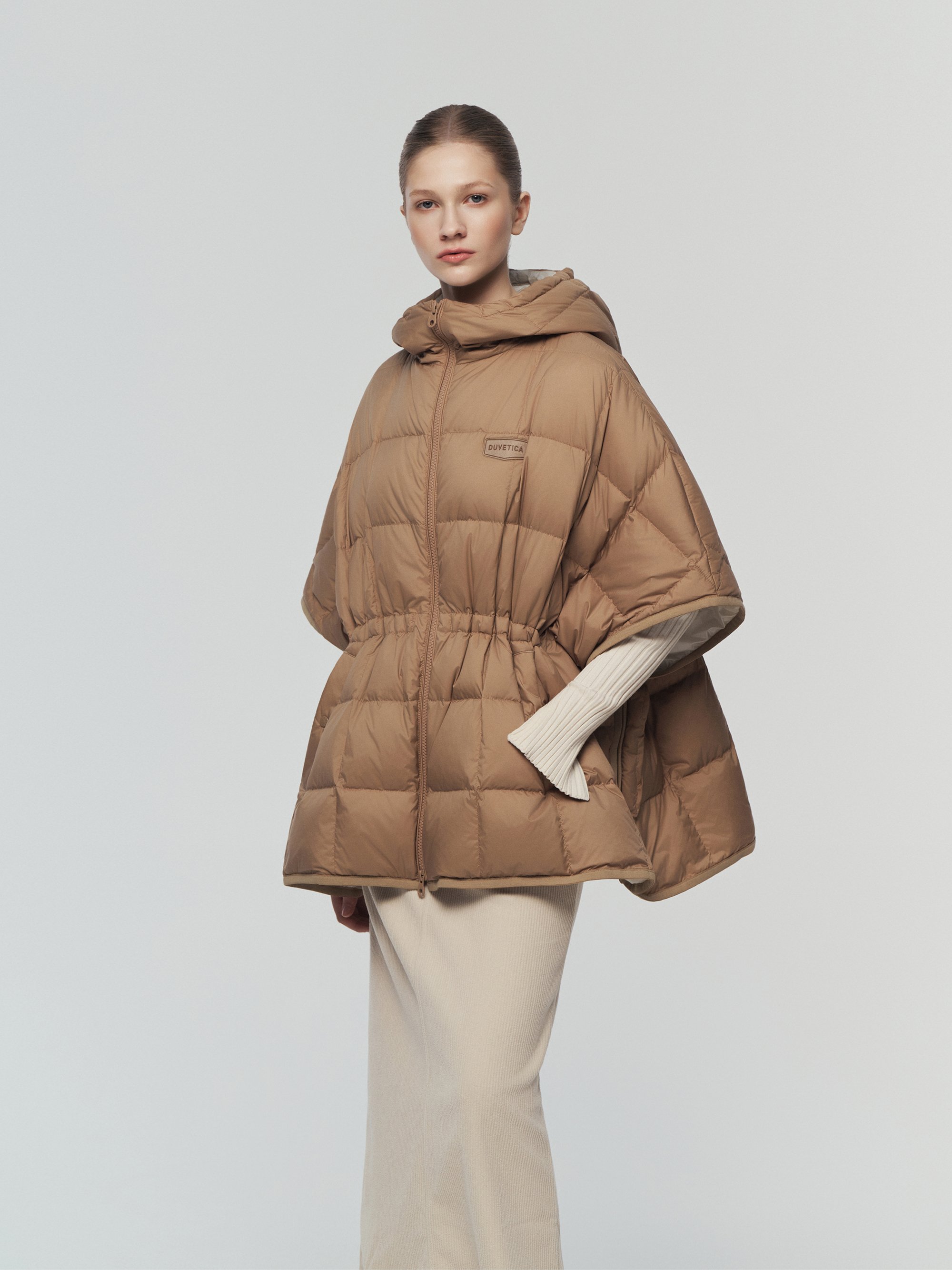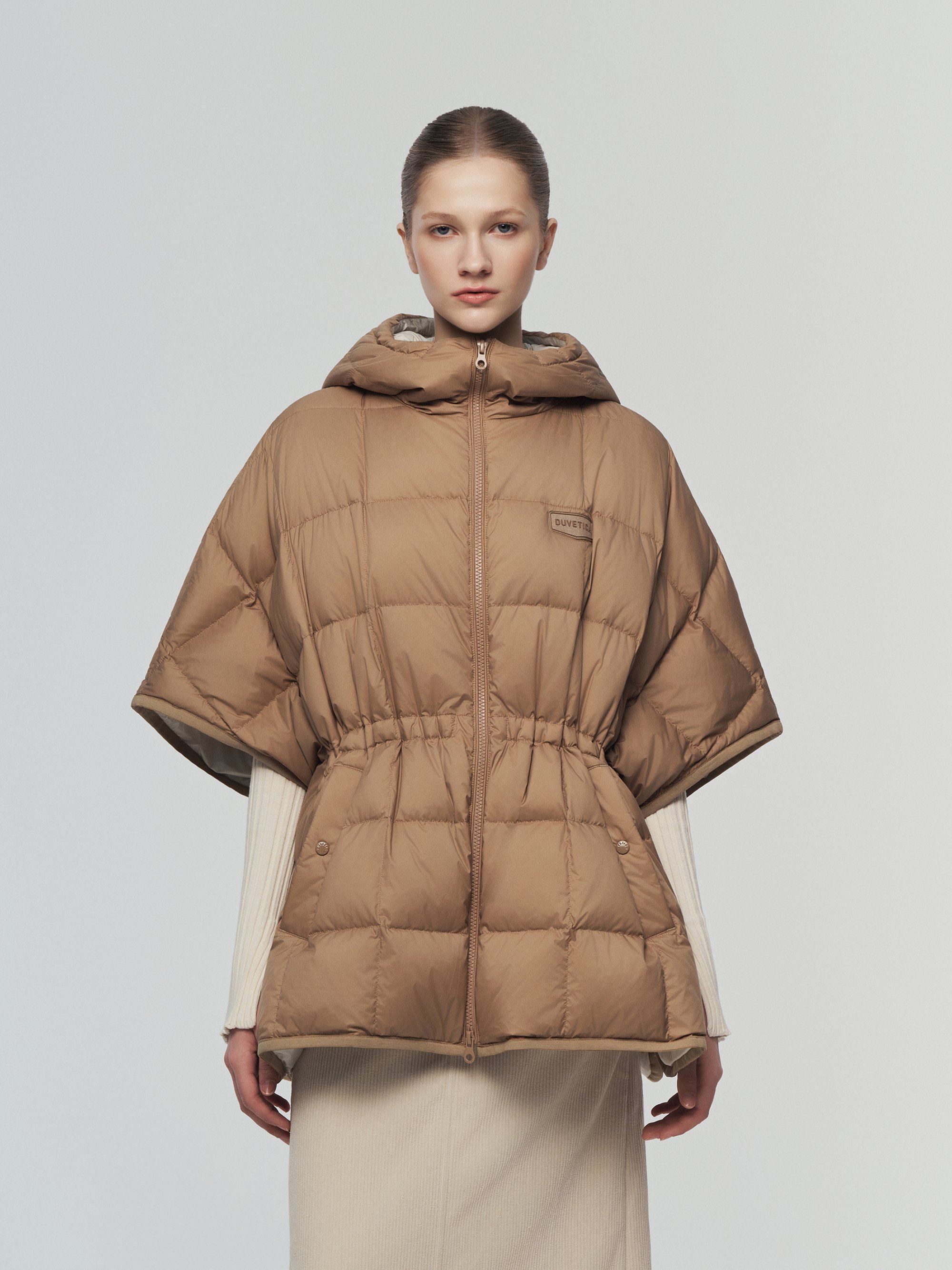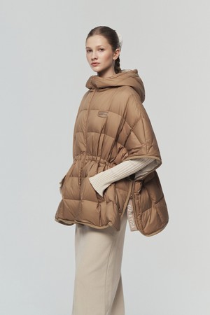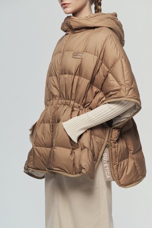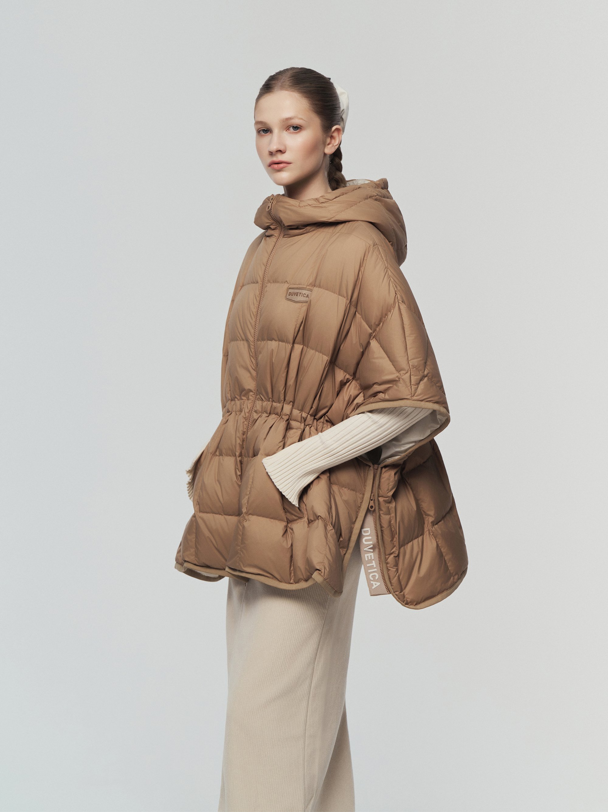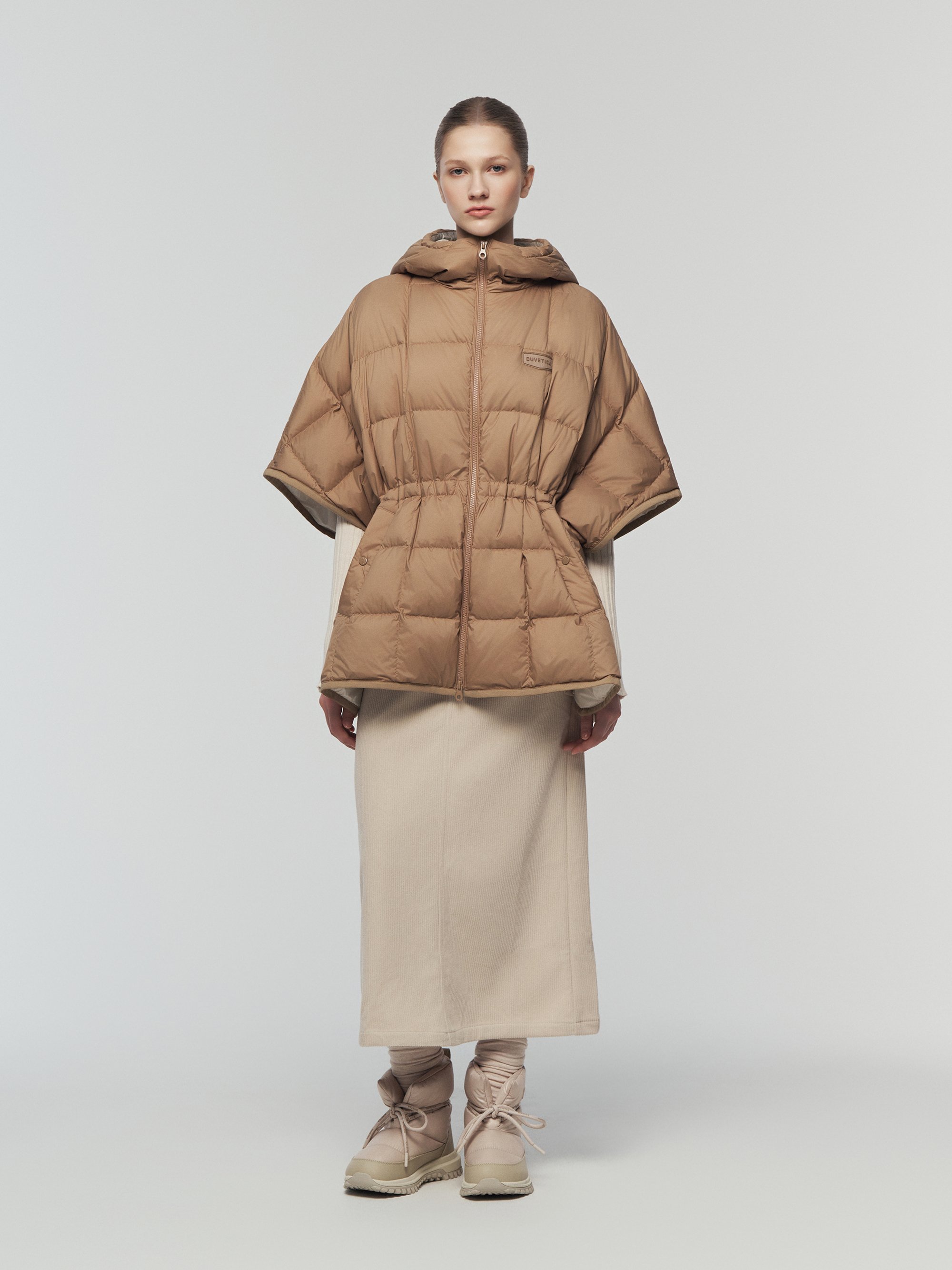 - 정형화된 다운자켓 형태가 아닌 판쵸 형태로 여성스러운 실루엣