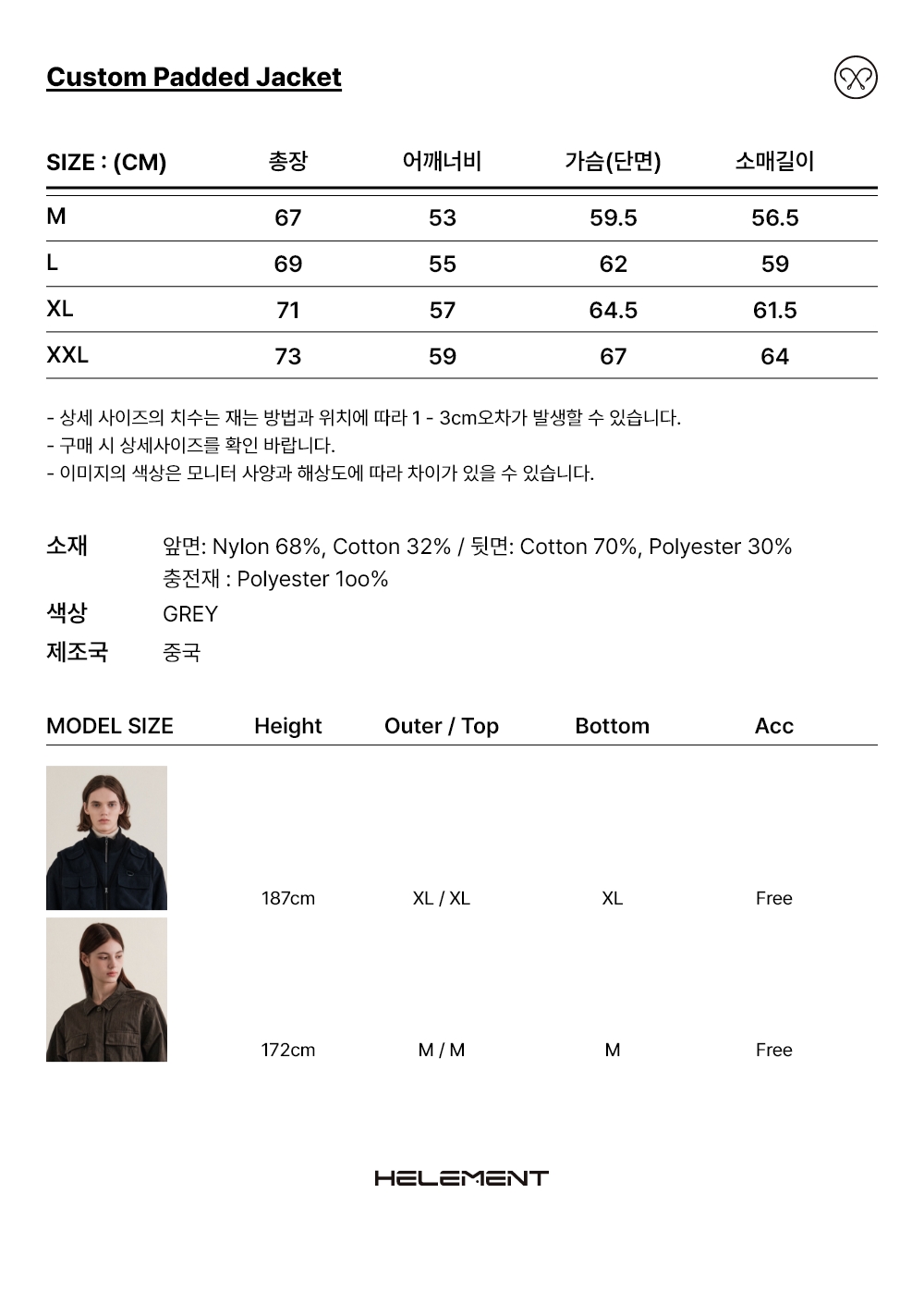 | 소재 | 앞면: 나일론 68%, 면 32% / 뒷면: 면 70%, 폴리에스터 30% / 충전재: 폴리에스터 100% |