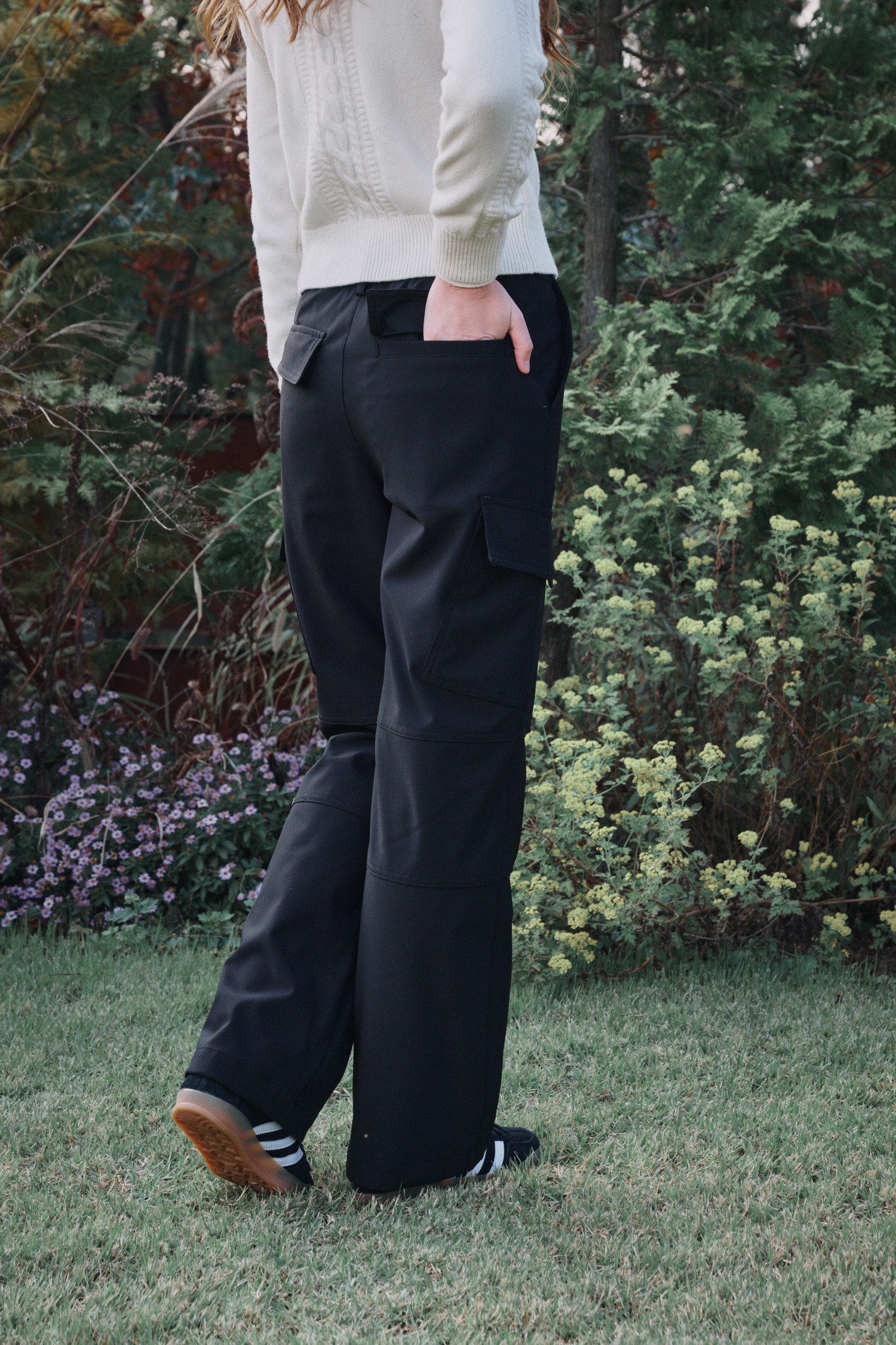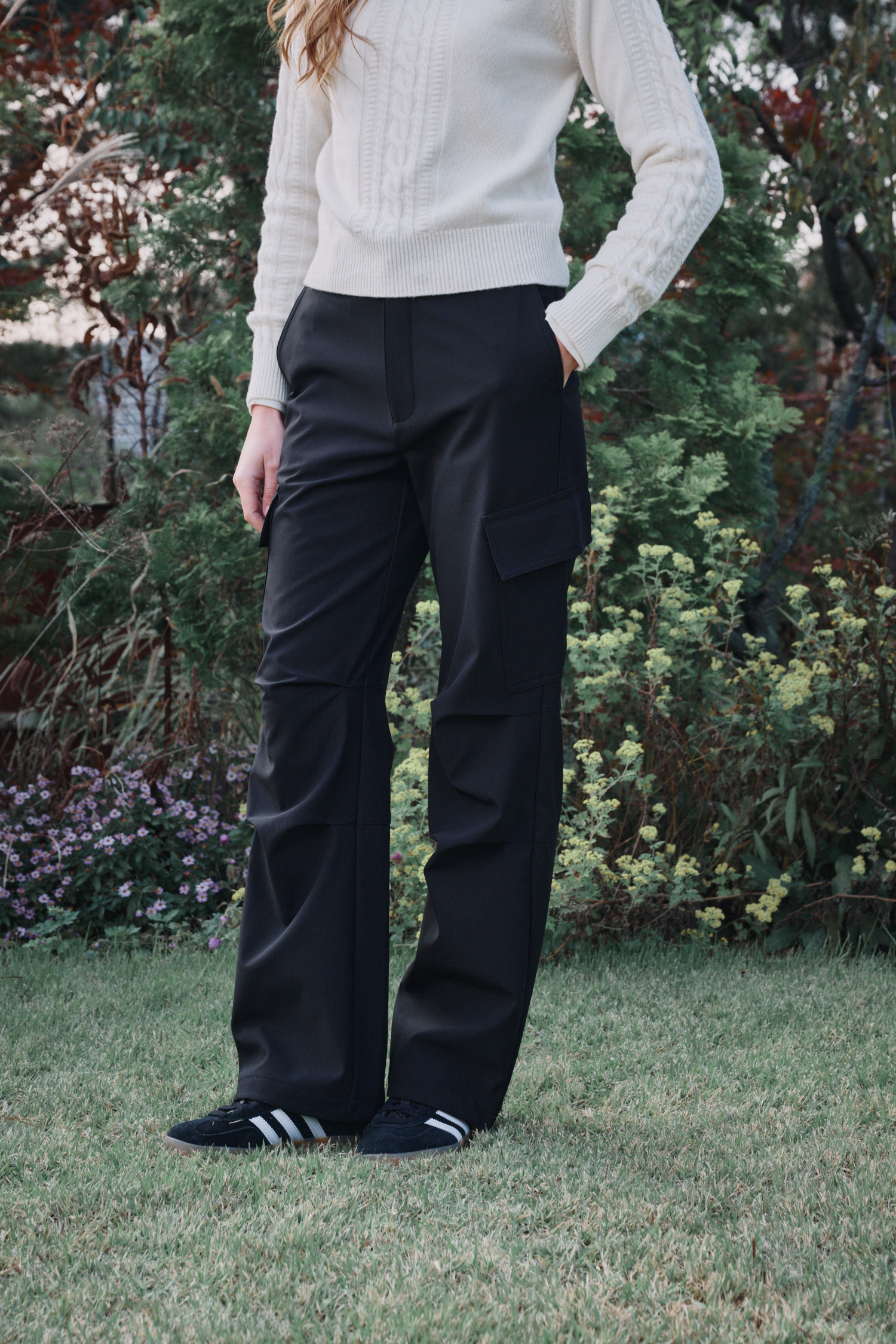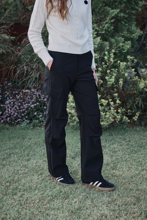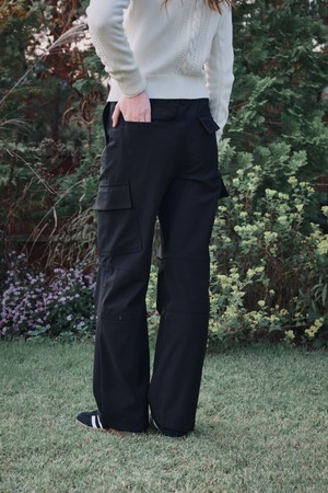 유틸리티 스타일의 팬츠 이며 충분한 주머니 디테일과