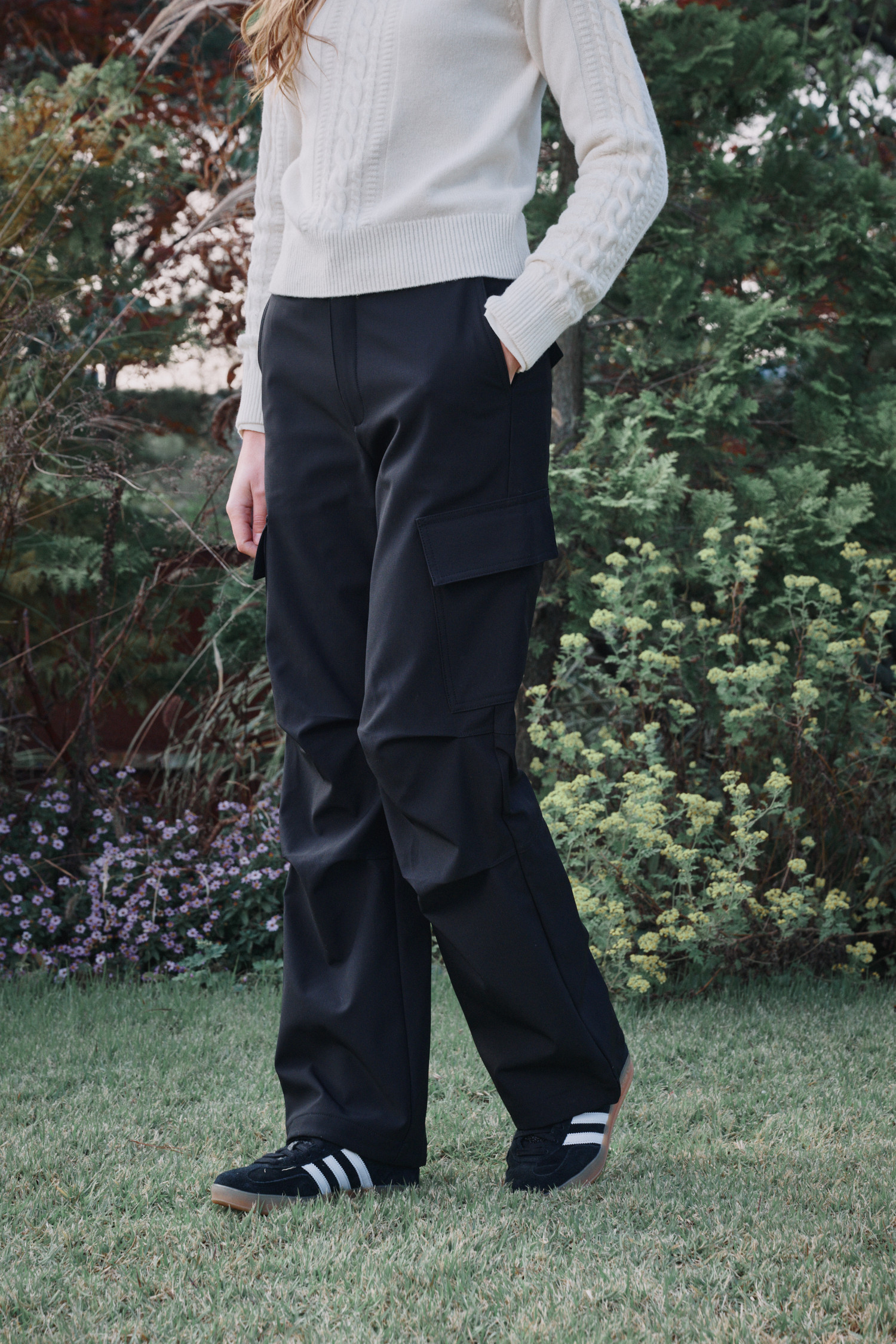 바지 총기장은 S 기준 104cm로 신장 165cm 기준으로 신발 발등이 모두 덮히는 기장입니다