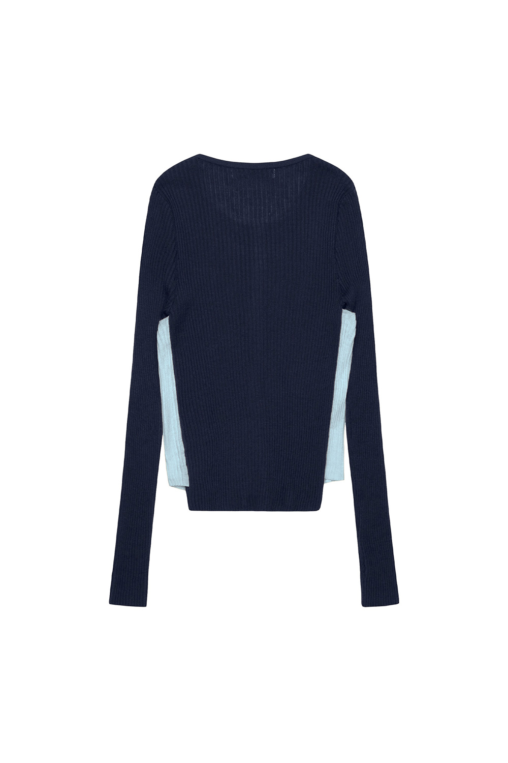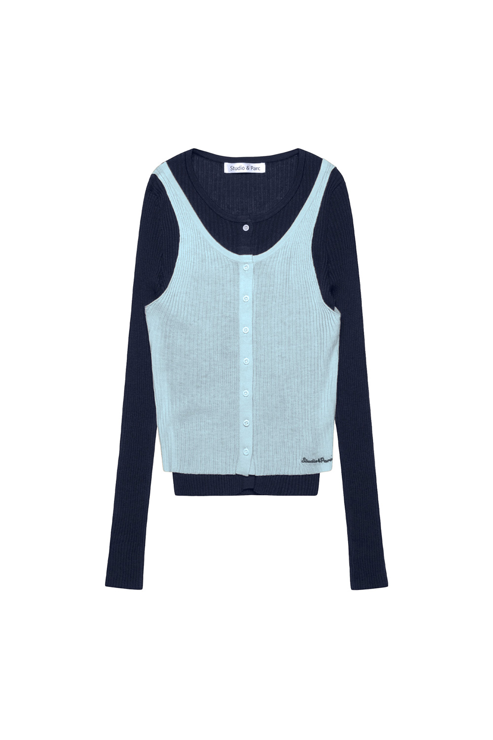 배색이 돋보이는 레이어드 디자인의 니트입니다.