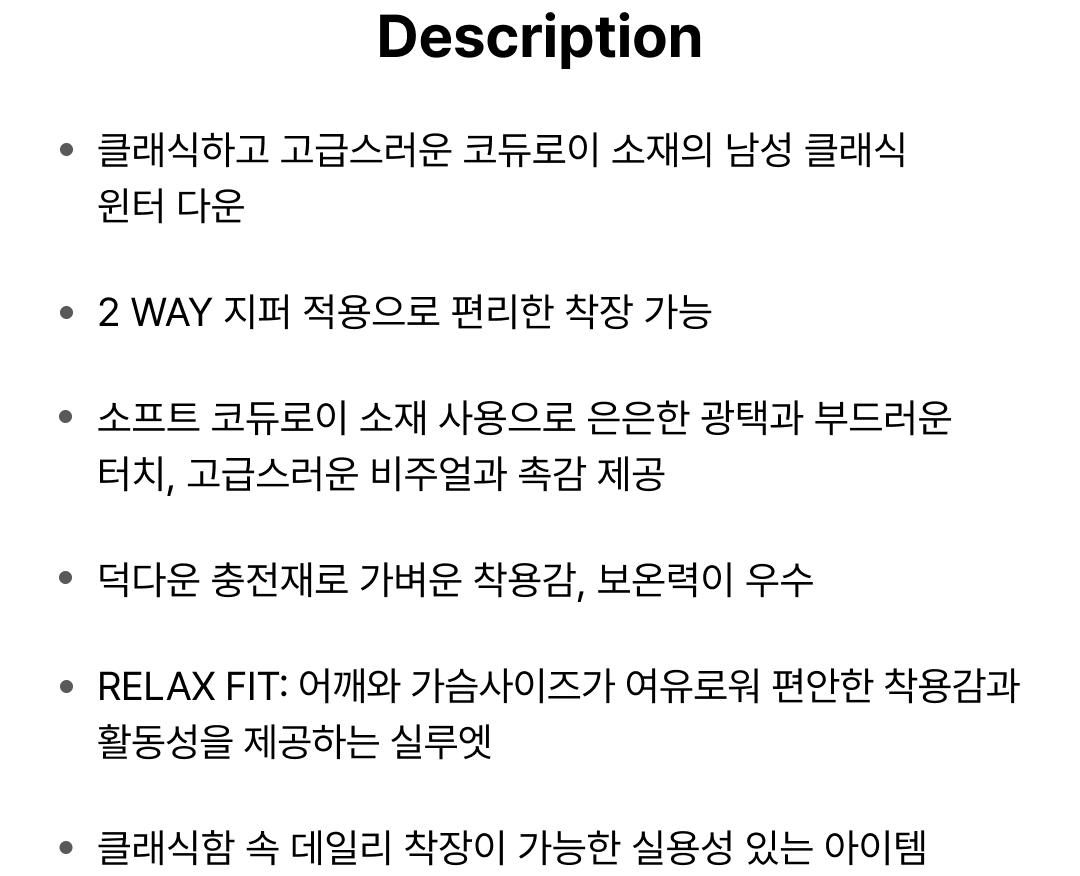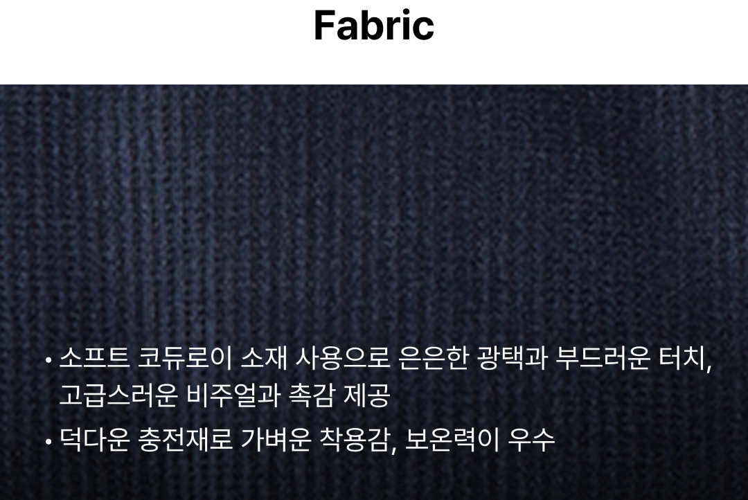 | 소재 | 겉감 폴리에스터100% 안감 나일론100% 충전재 오리솜털80% 충전재 오리깃털20% 제품구분 솜털(다운)제품100% |
