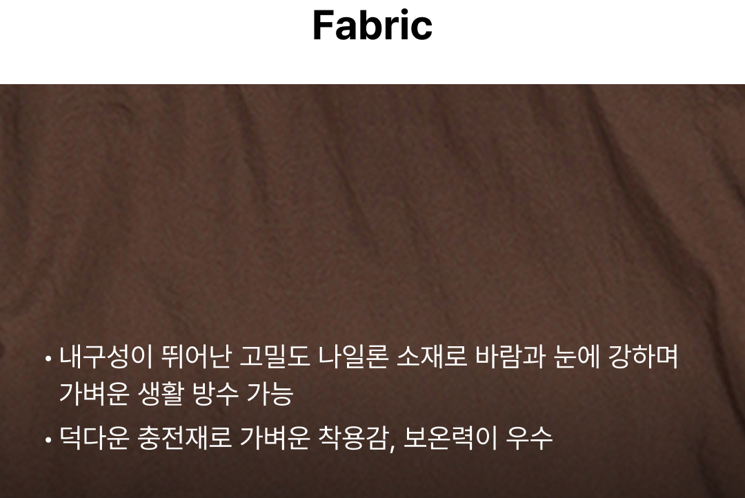 | 소재 | 겉감 나일론100% 안감 나일론100% 충전재1 오리솜털80% 충전재1 오리깃털20% 충전재2 폴리에스터100% |