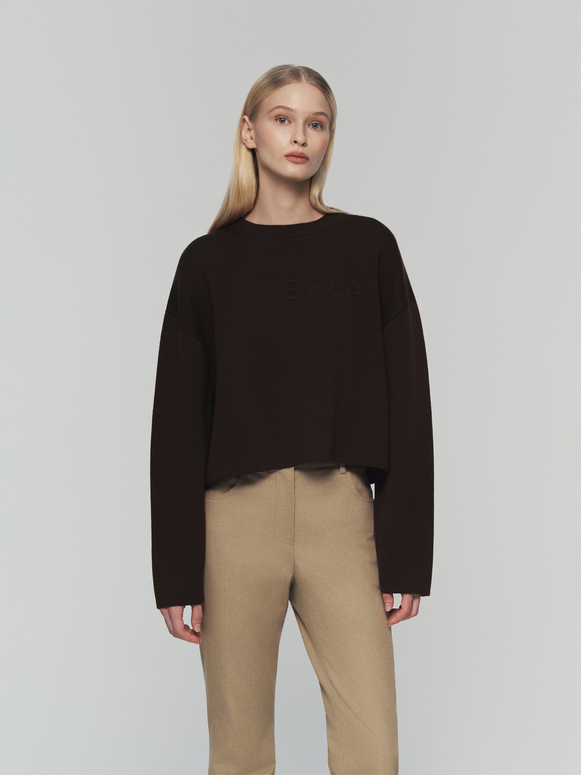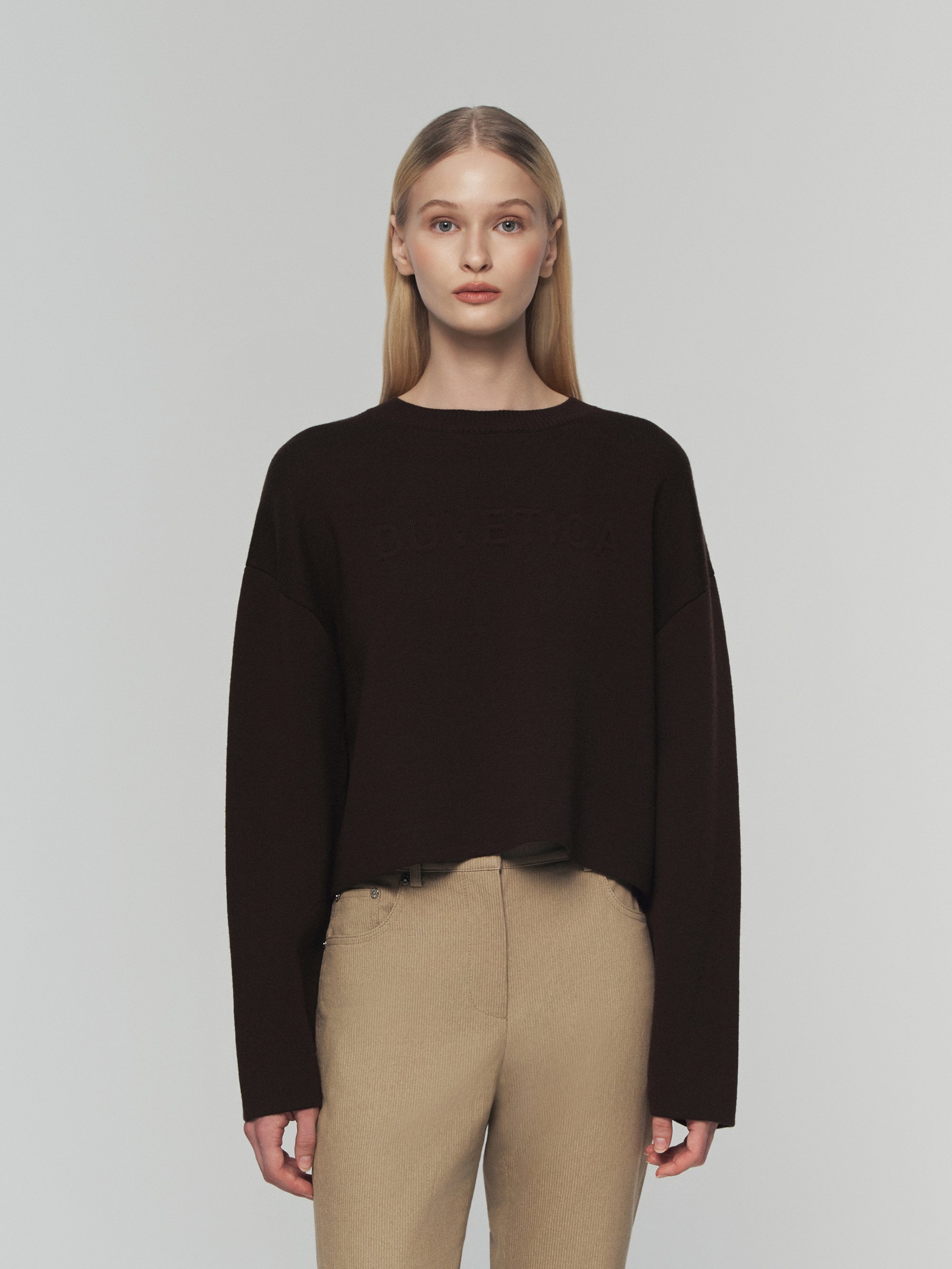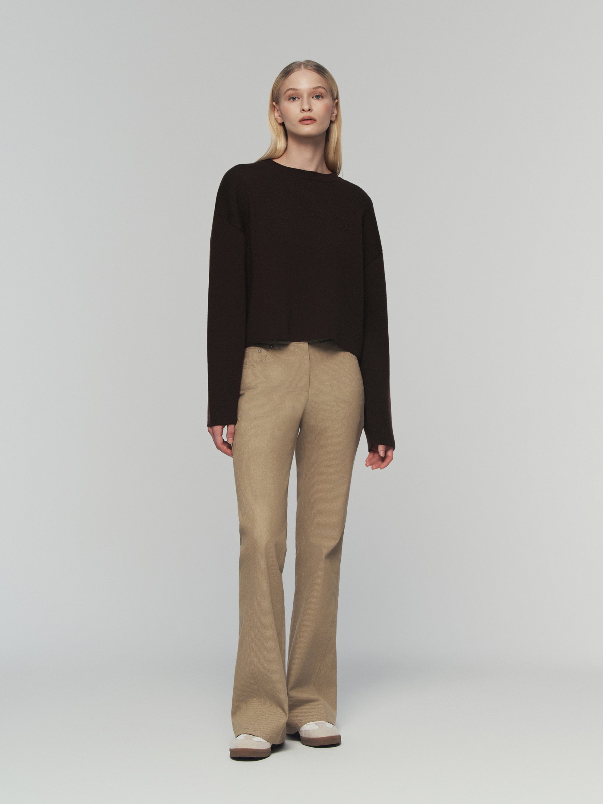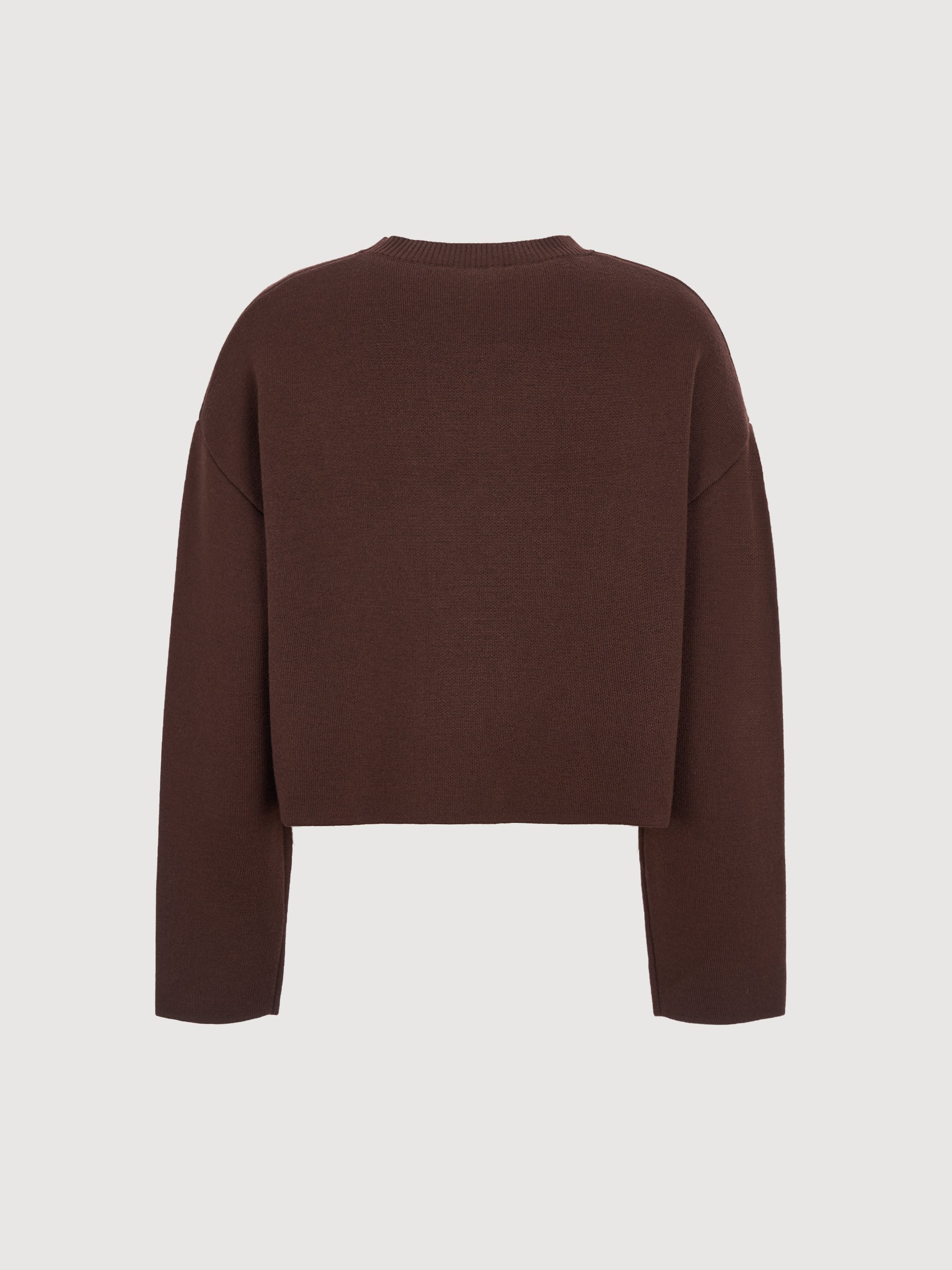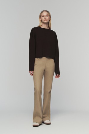 - 포근한 터치감의 울 혼용 니트 소재의 세미오버핏 크롭 니트