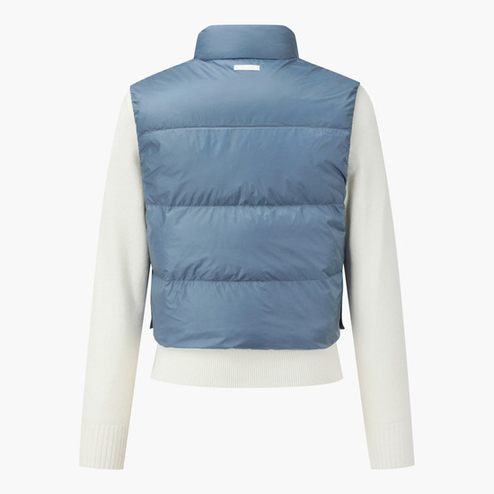 소매에 울 혼방 원사를 사용하여 착용 시 포근하고 따뜻한 하이브리드 다운 점퍼입니다.